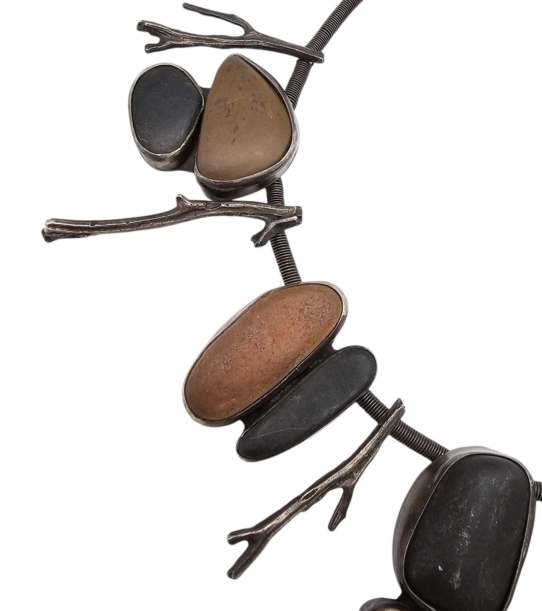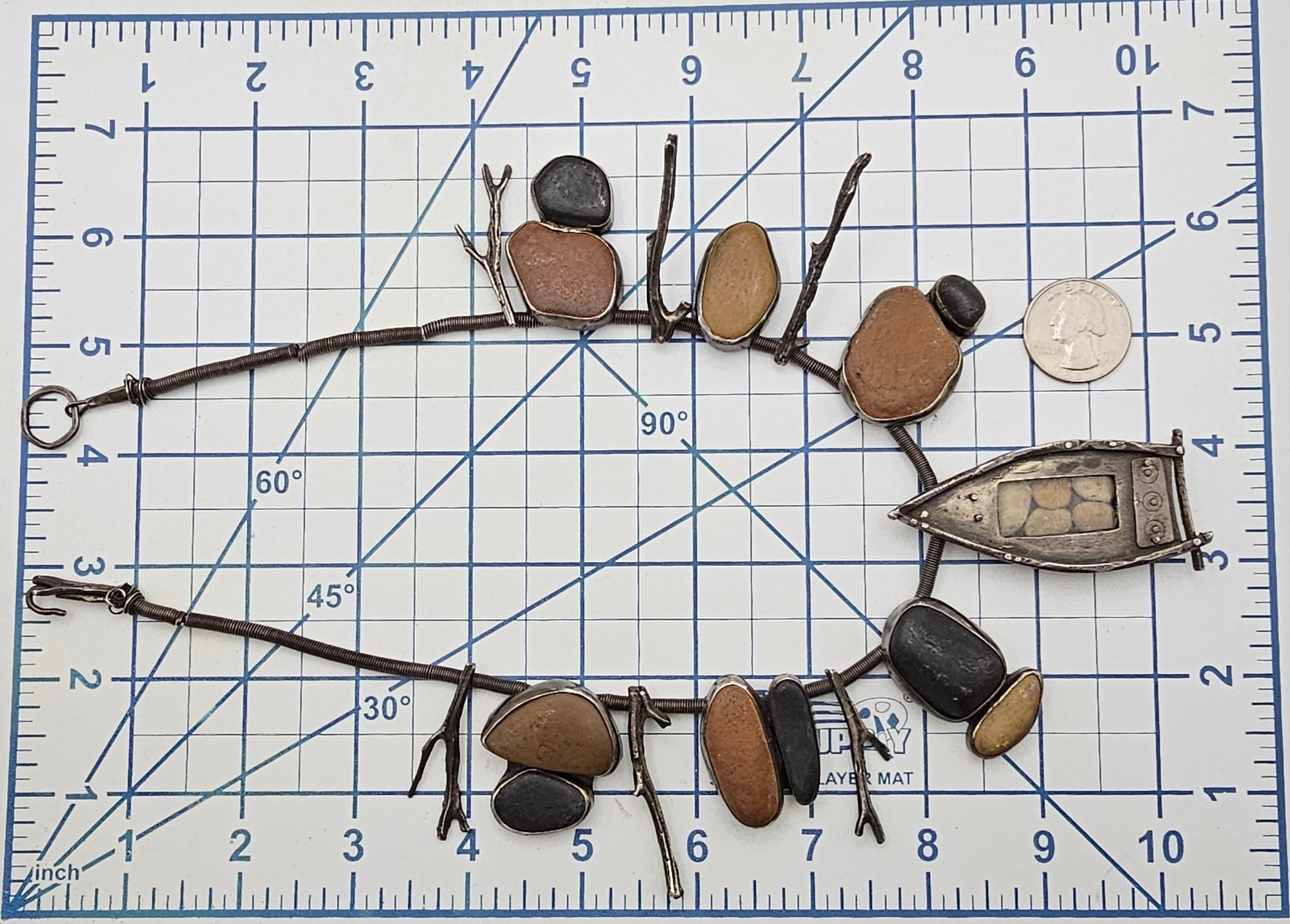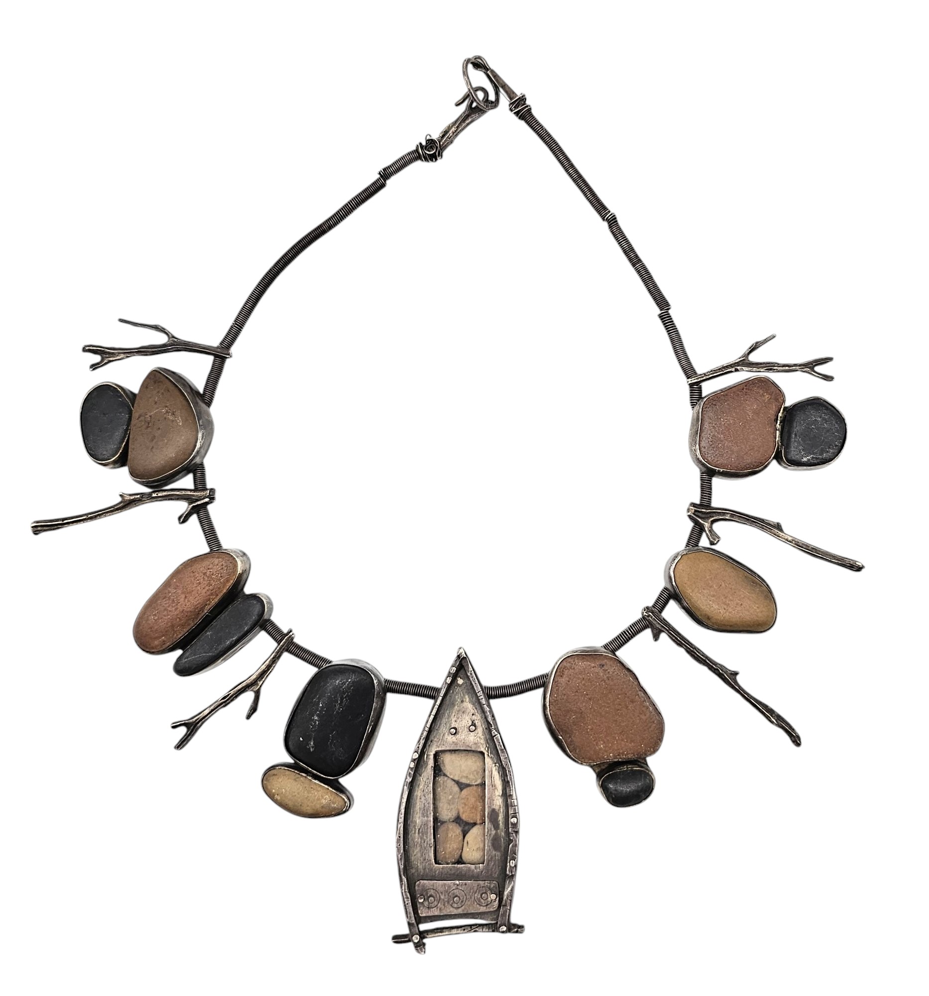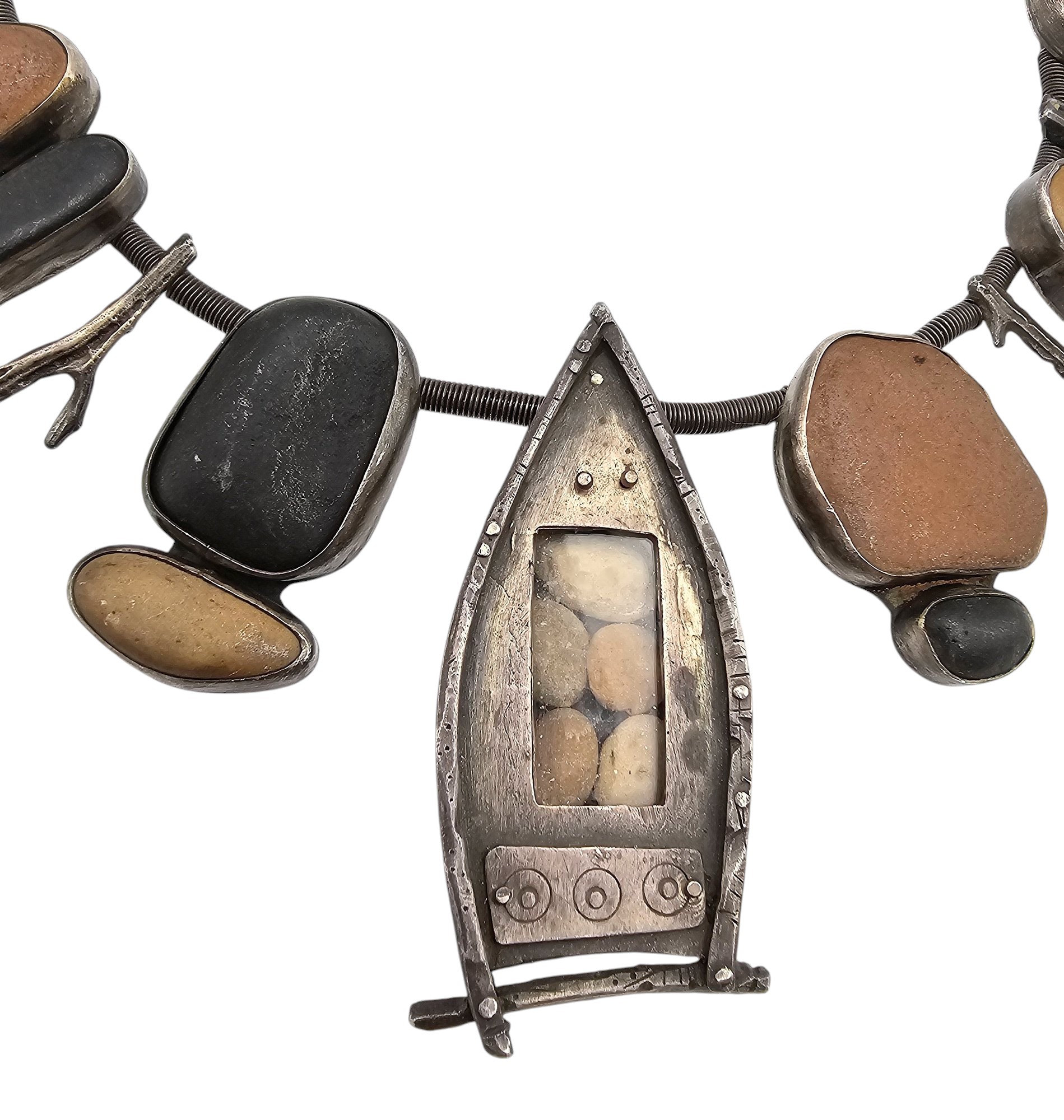 Vintage Sterling Silver Natural Stone Row Boat Natural Style Necklace 152.2 G Coil Style Chain Sterling Branches or Sticks