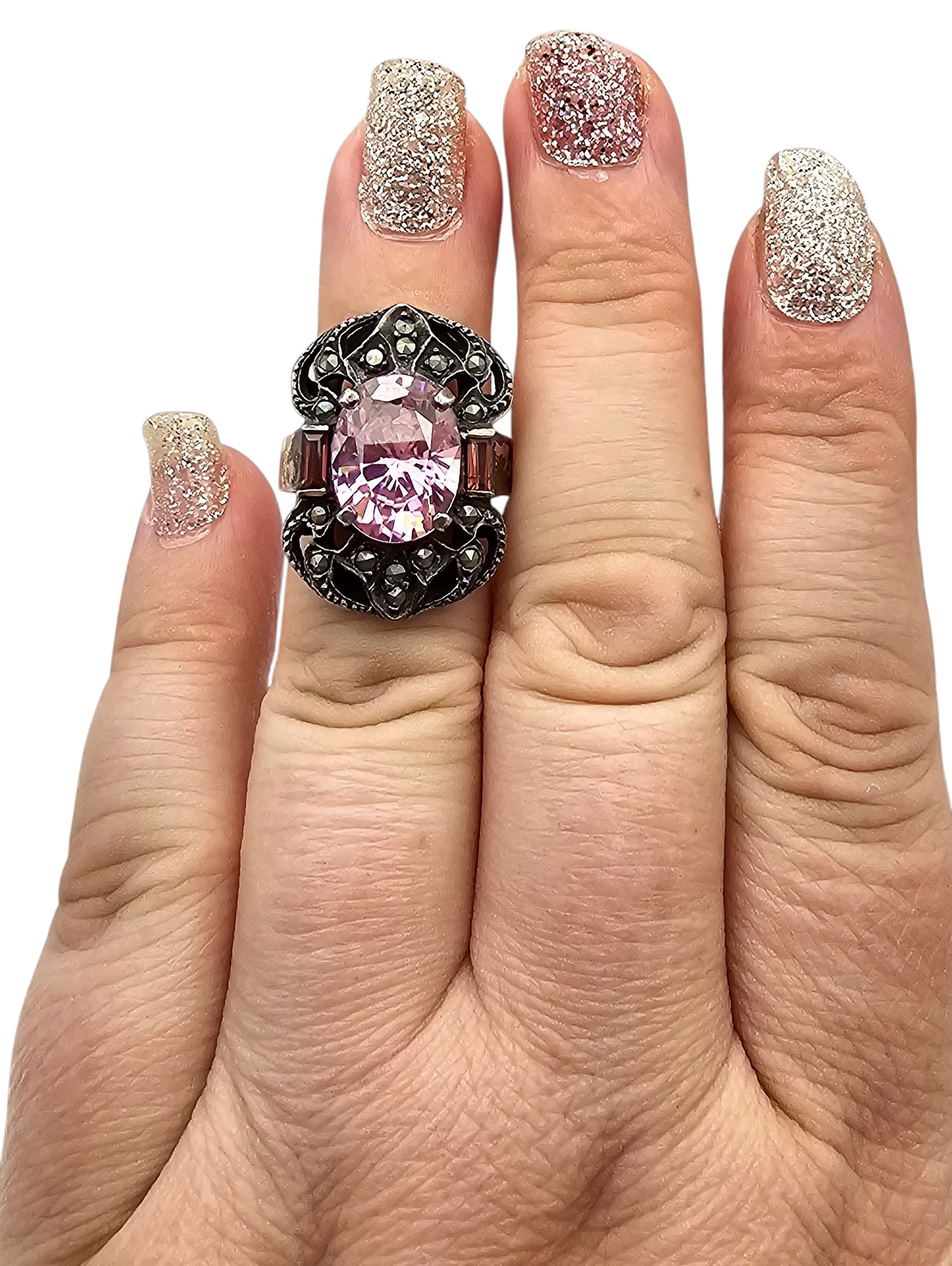 Rhinestone Marcasite Sterling Silver Cocktail Ring Sz 5.5 8.5 G