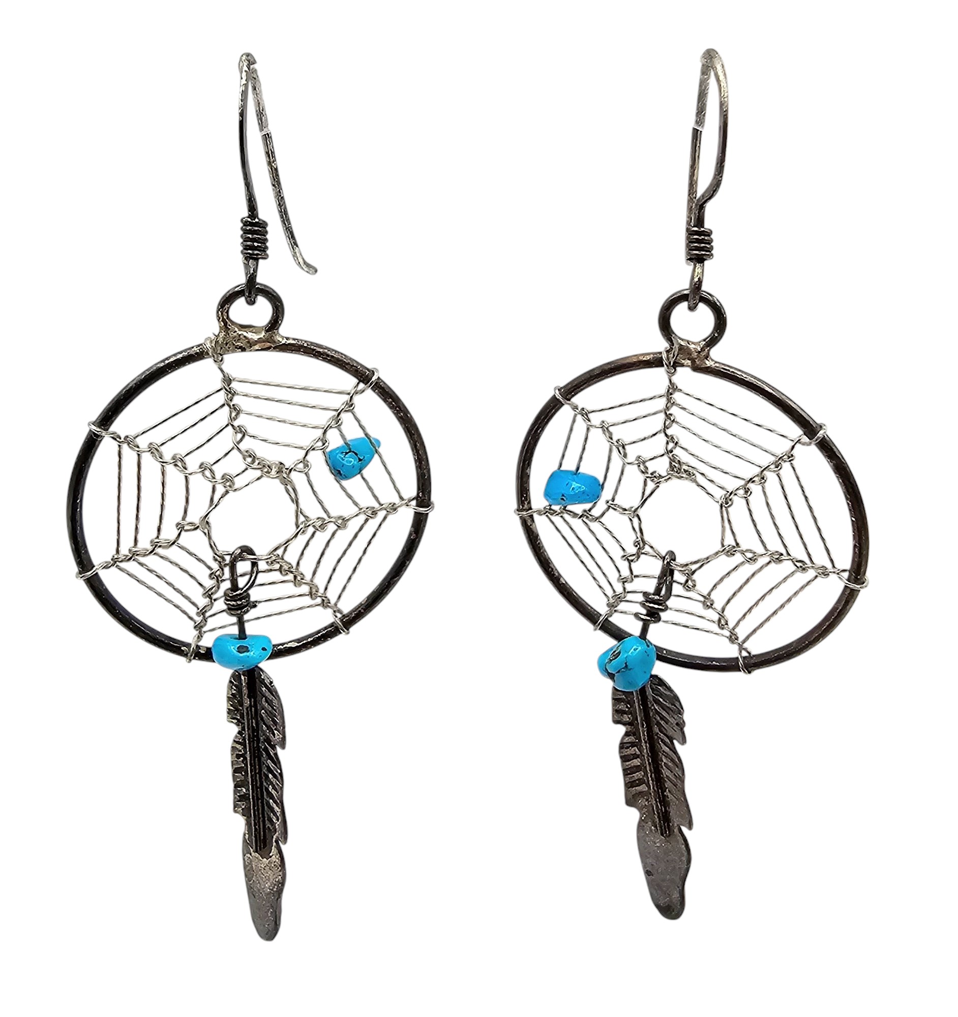 Southwestern Turquoise Sterling Silver Dream Catcher Drop Dangle Earrings 2.6 G
