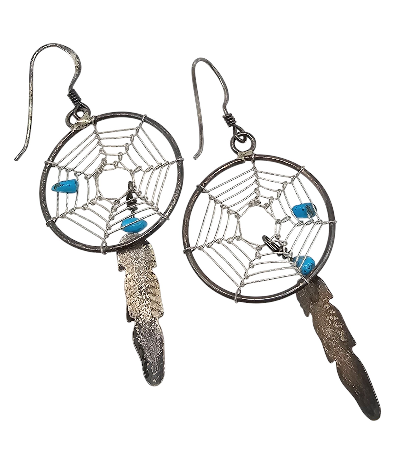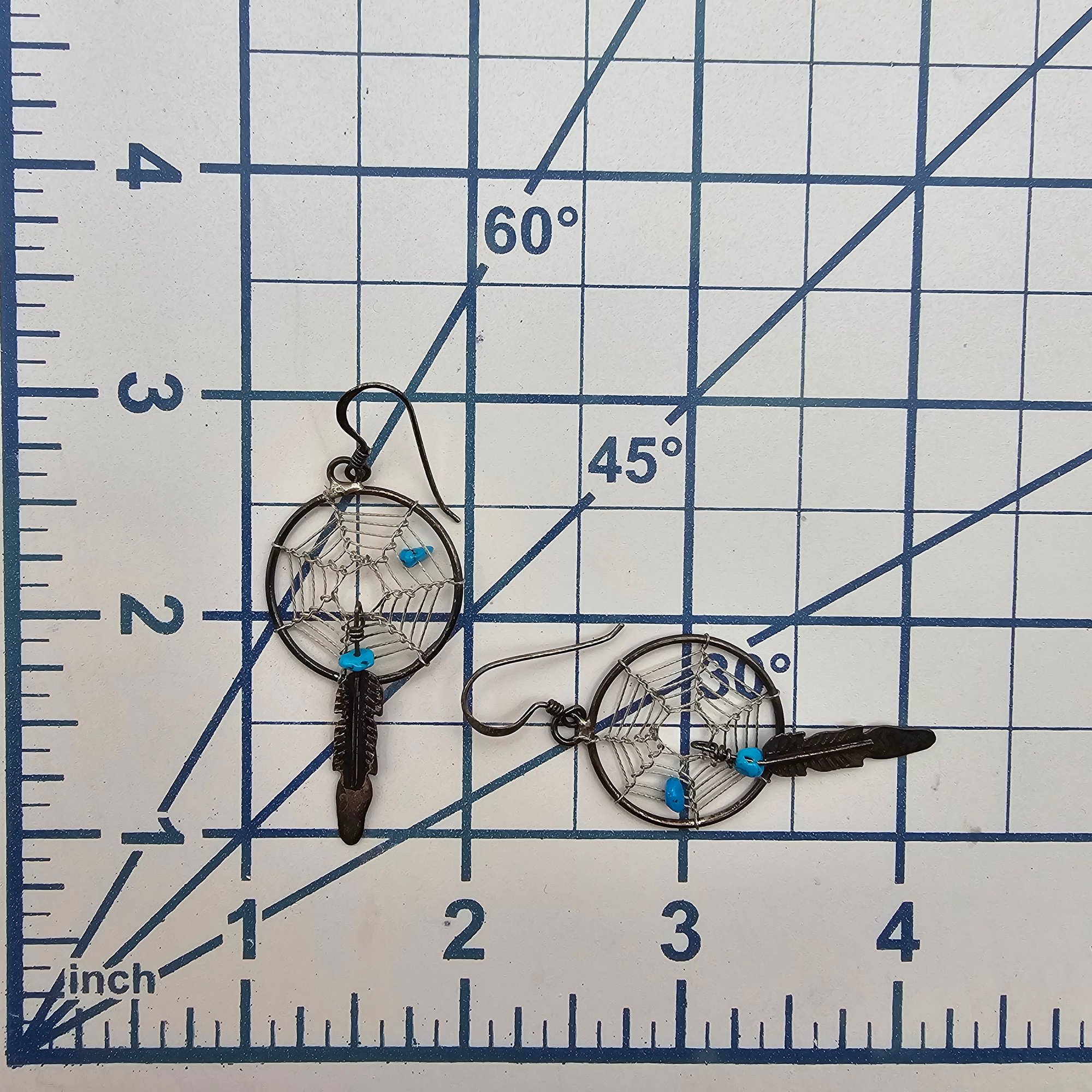 Southwestern Turquoise Sterling Silver Dream Catcher Drop Dangle Earrings 2.6 G