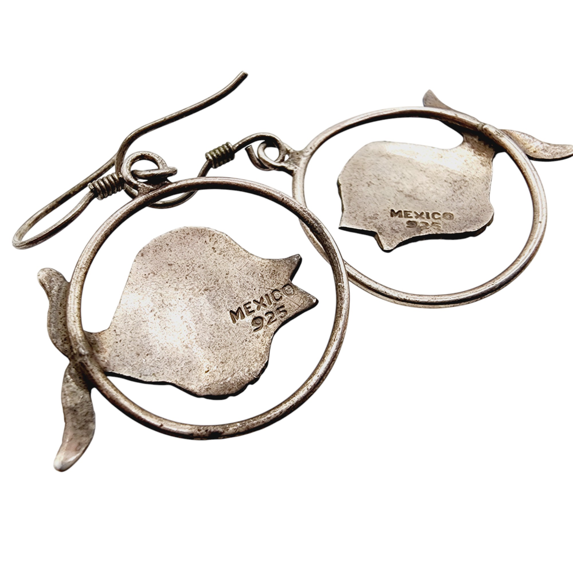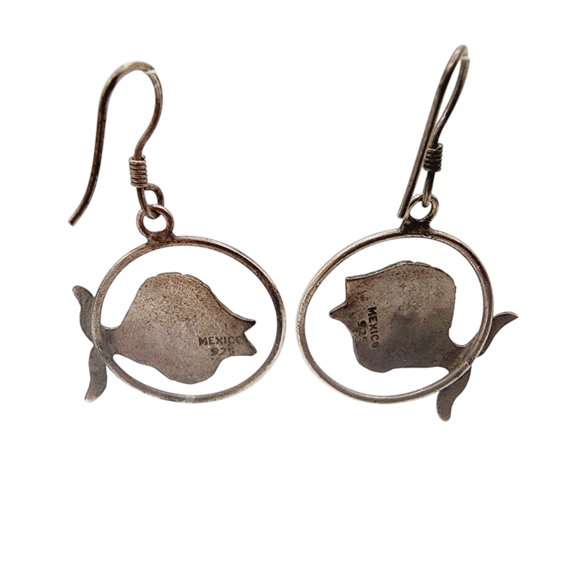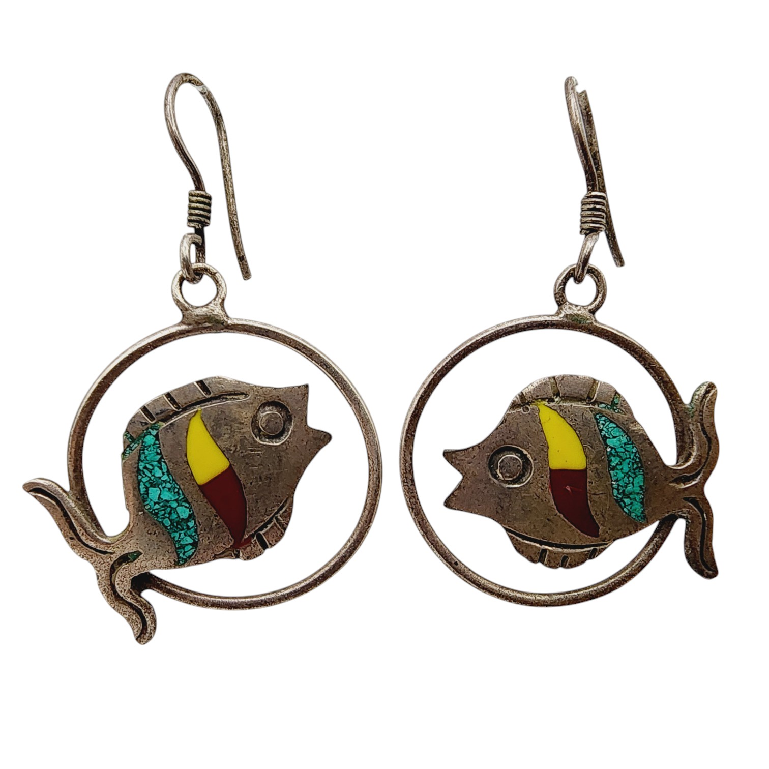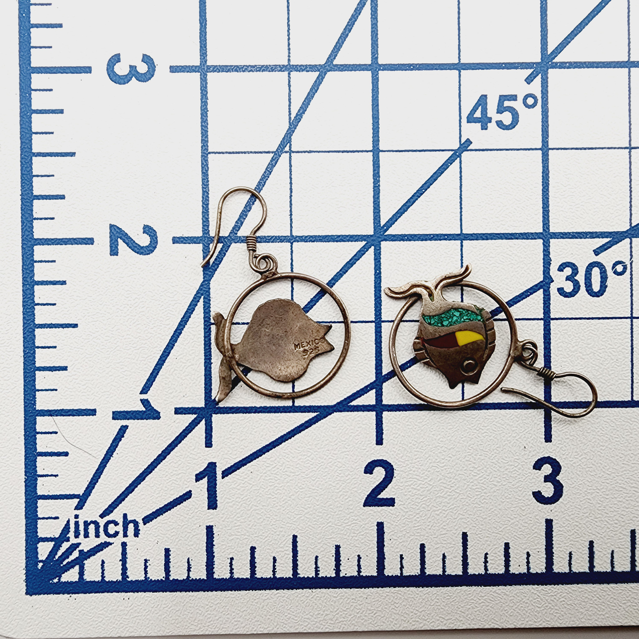 Sterling Mexico Inlay Fish Hoop Dangle Earrings 2.6g