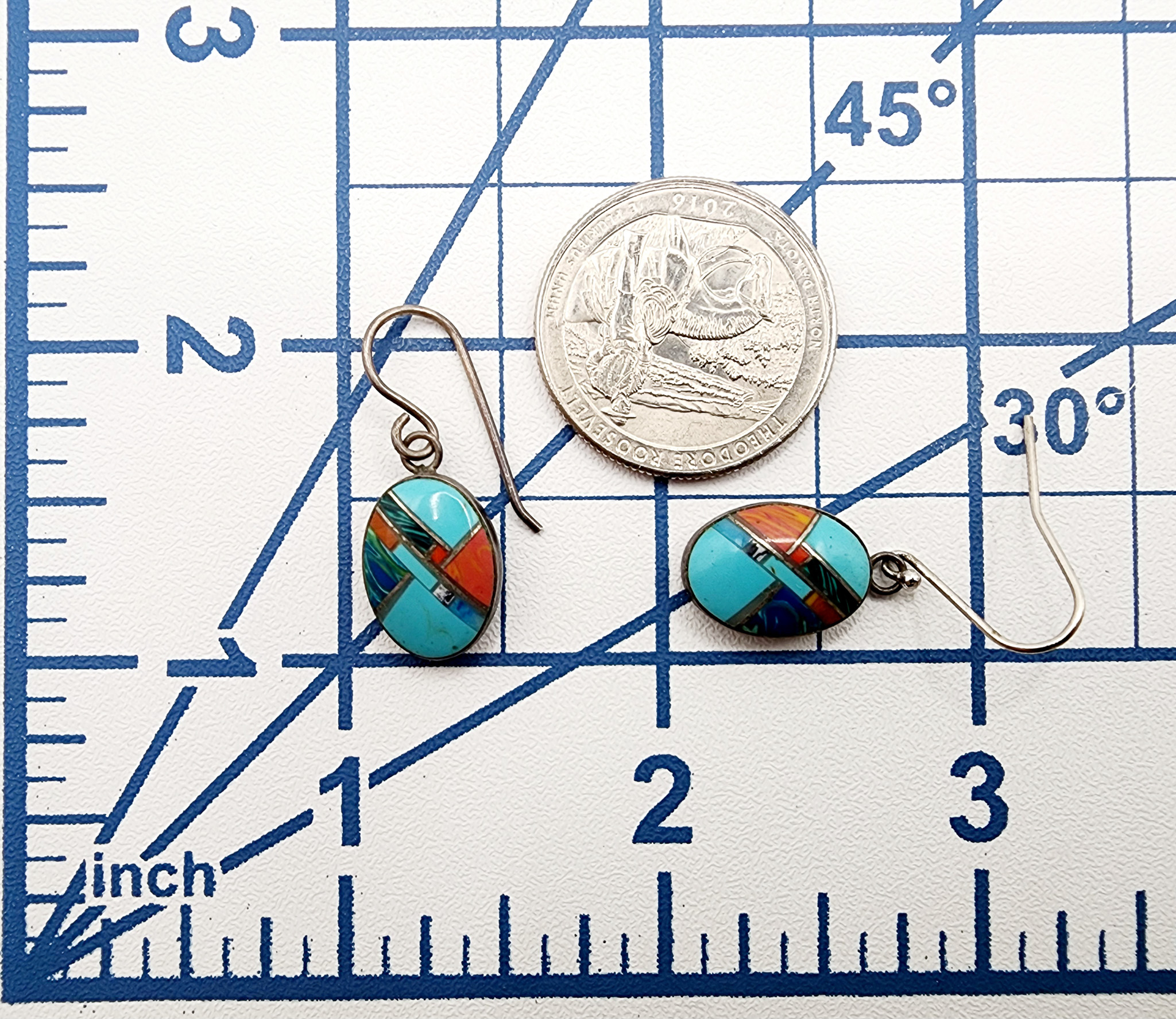 Sterling Navajo Turquoise Mosaic Inlay Dangle Drop Earrings 3g