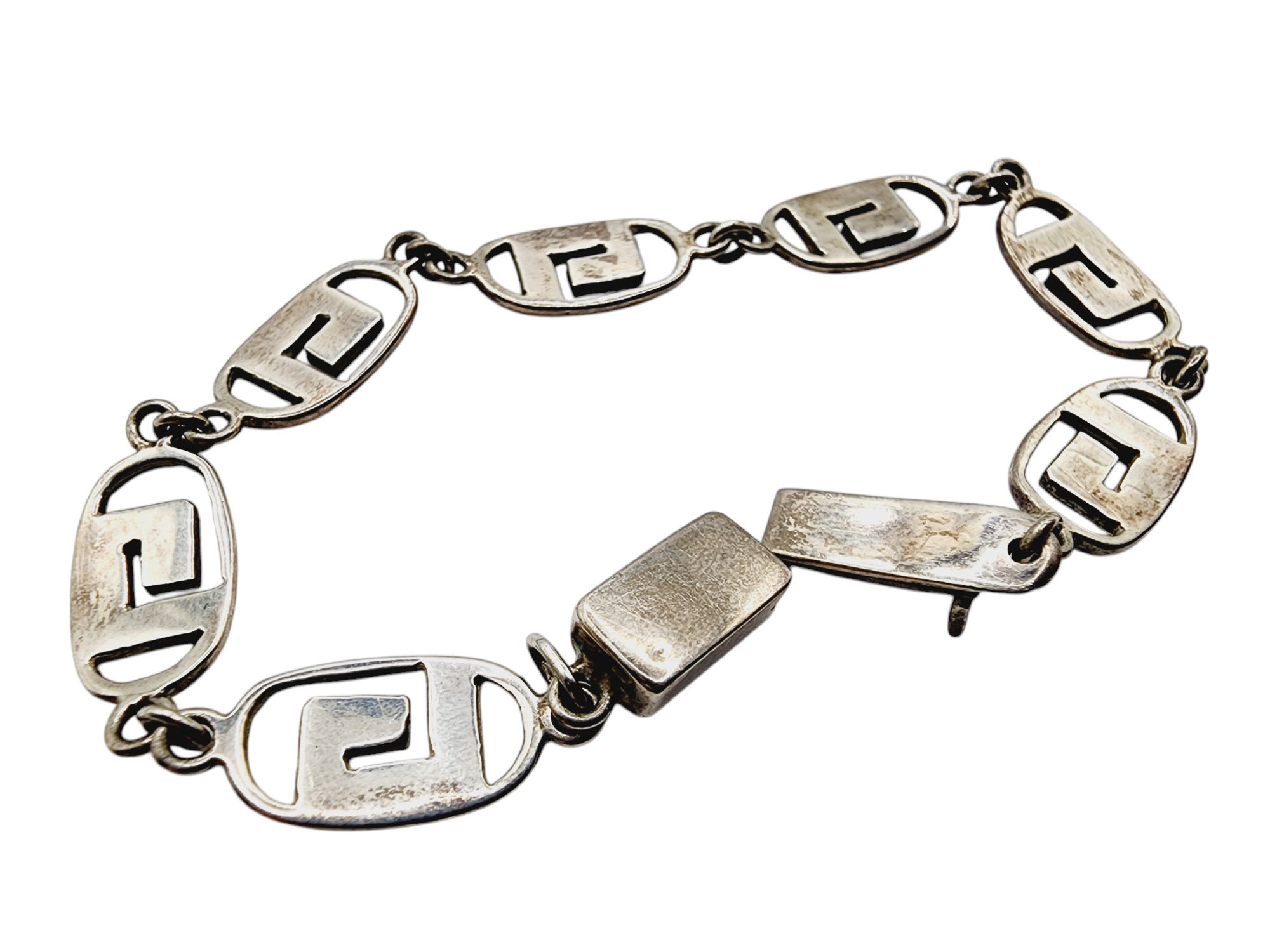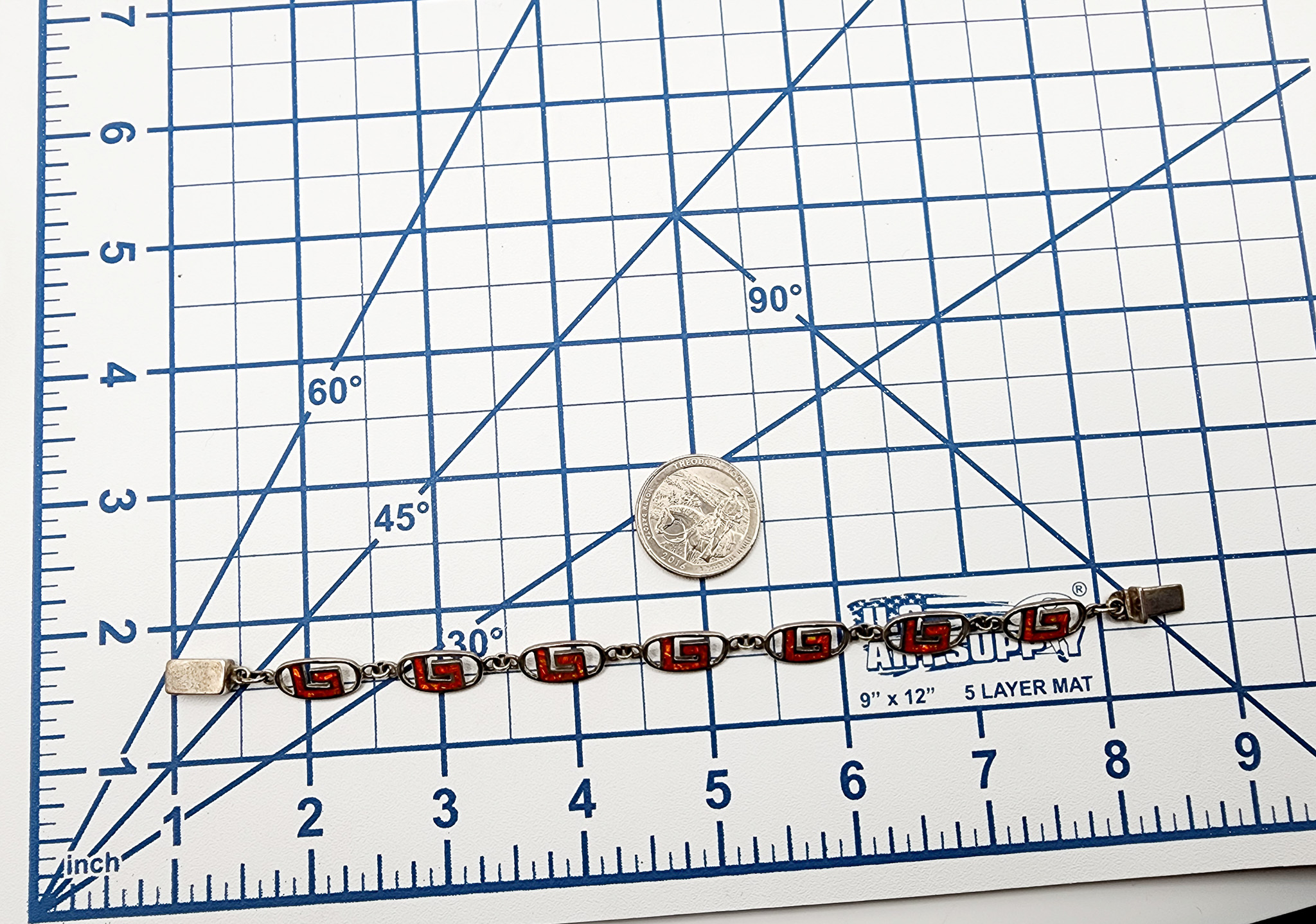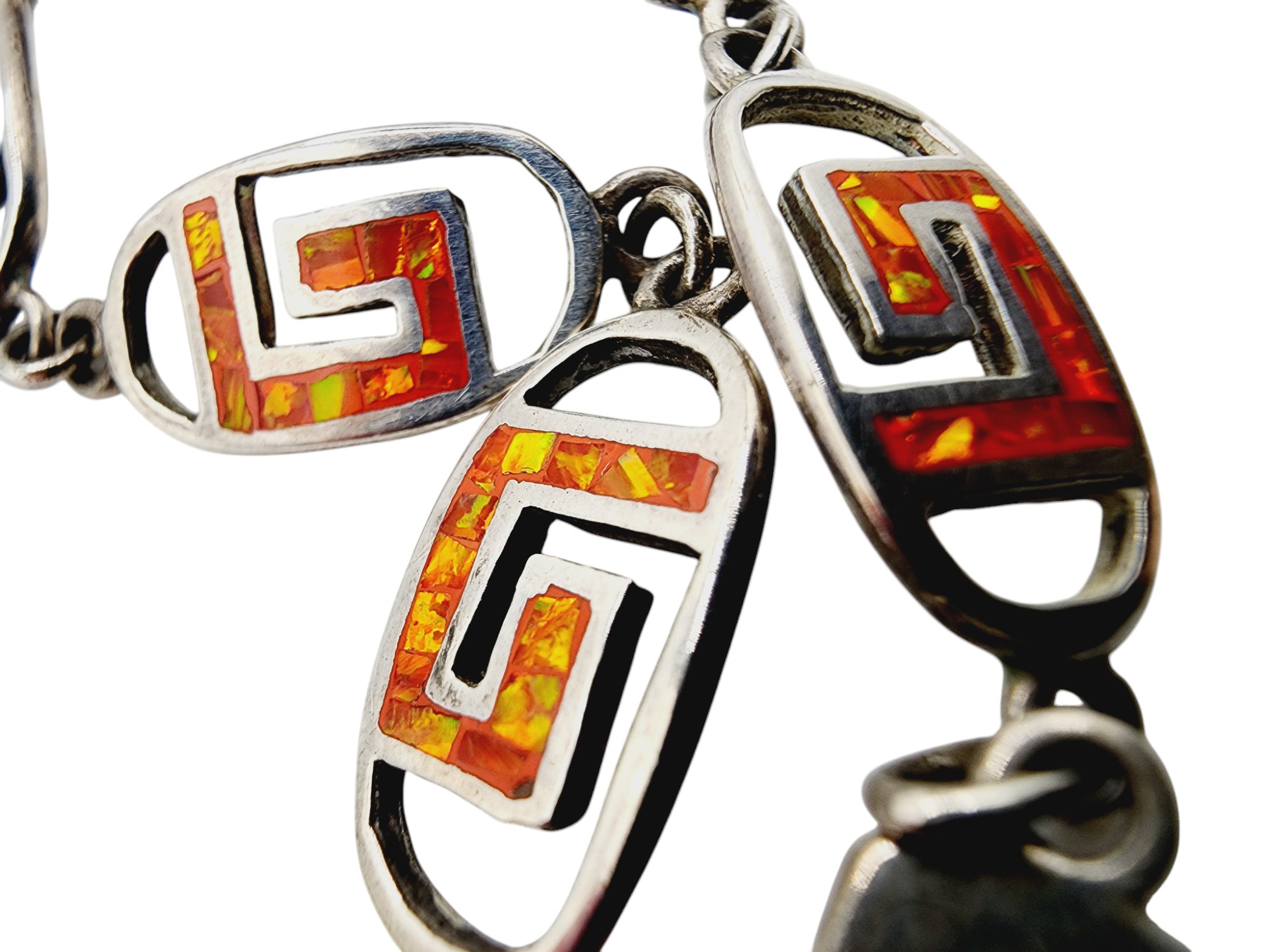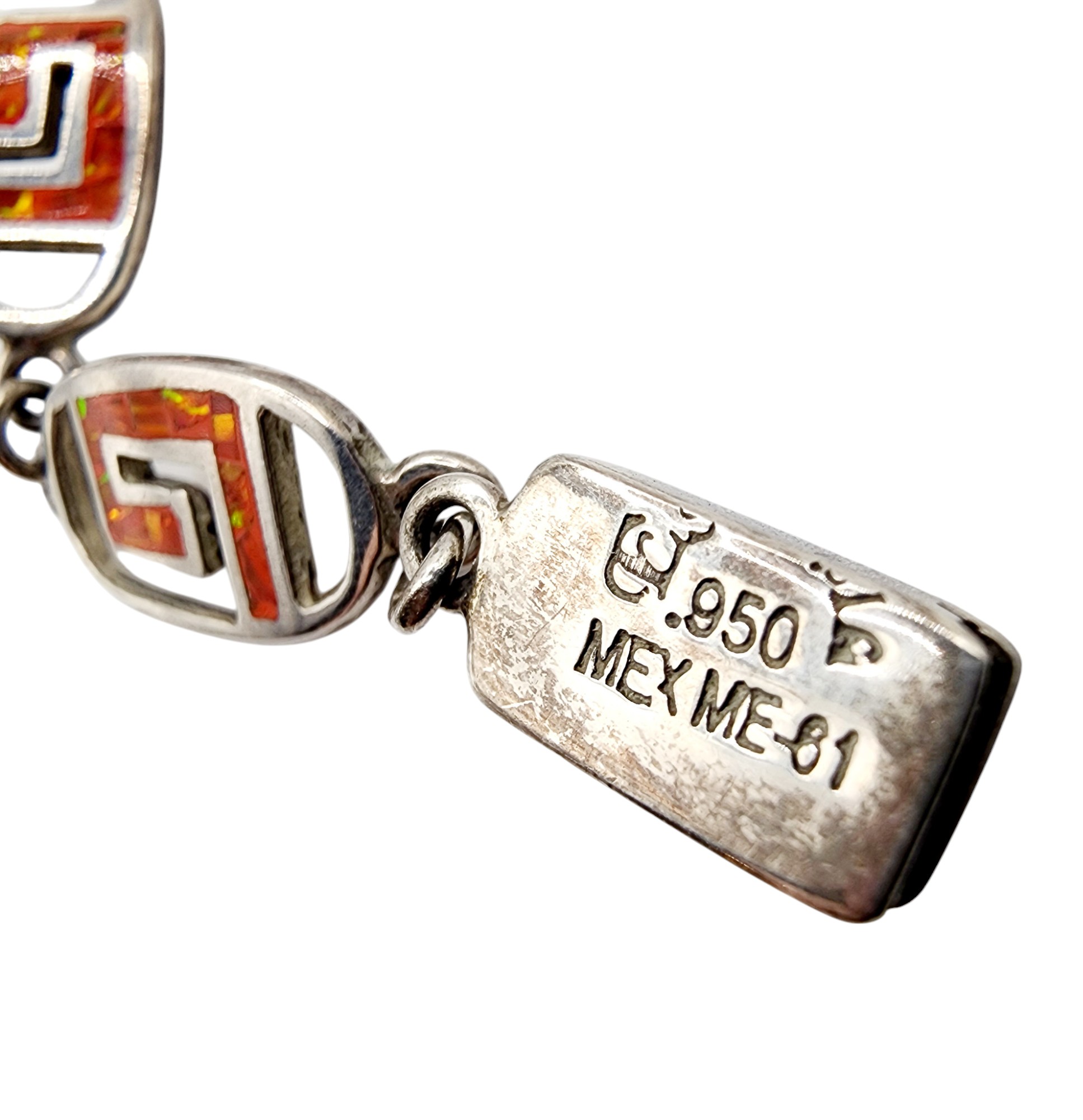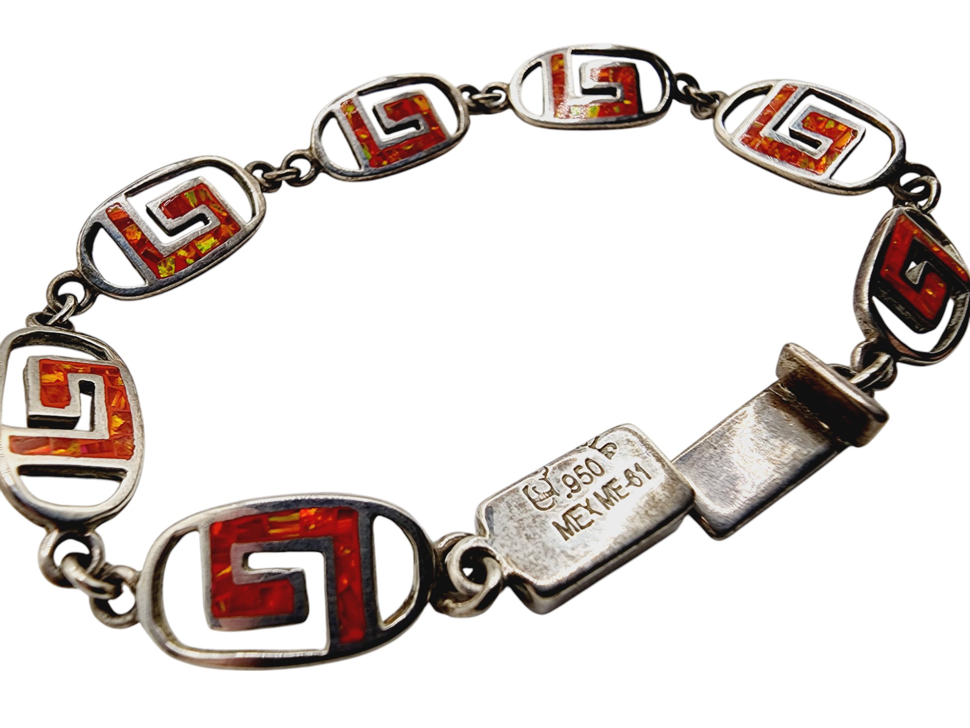 Sterling 950 Signed ME-61 Mexico Fire Opal? Inlay Greek Key Link Bracelet 9.7g