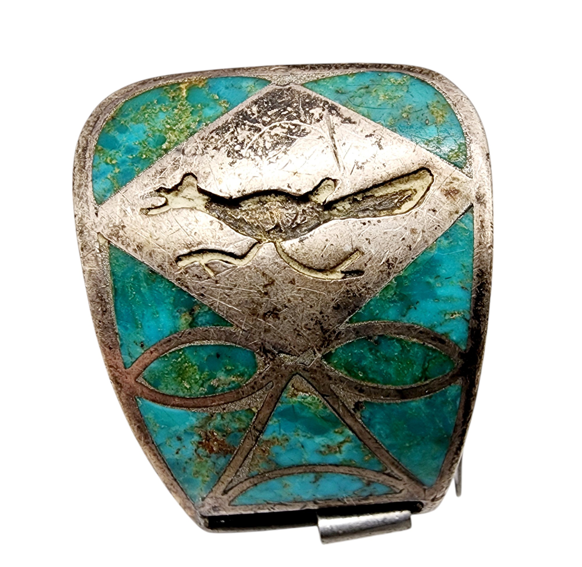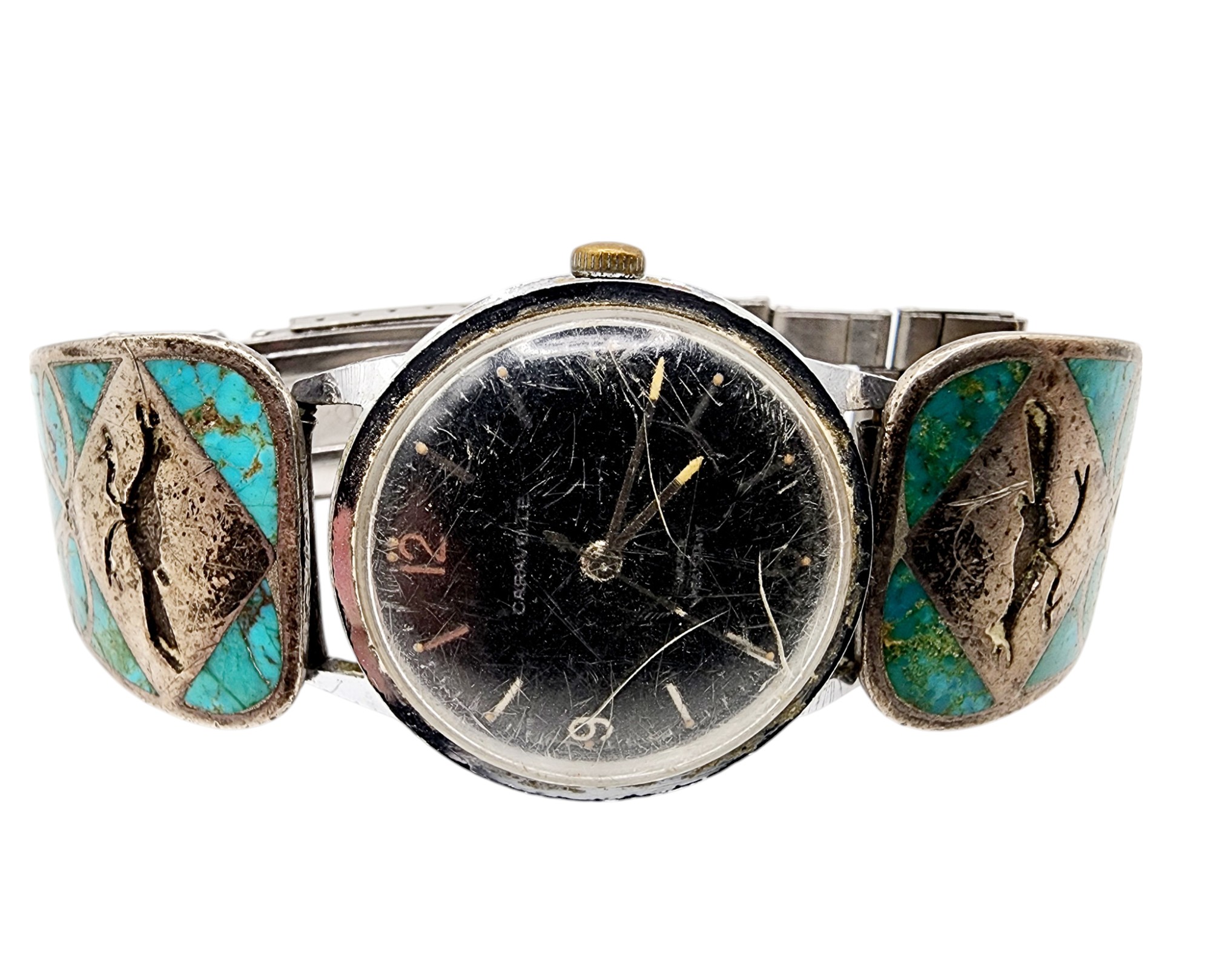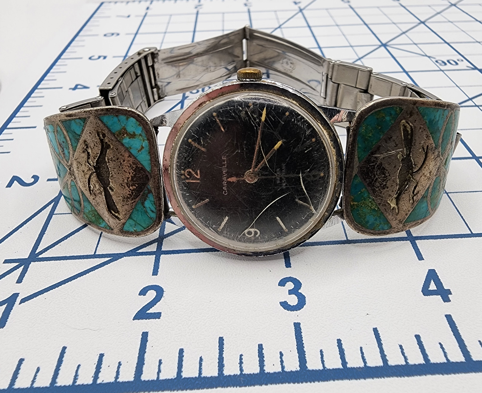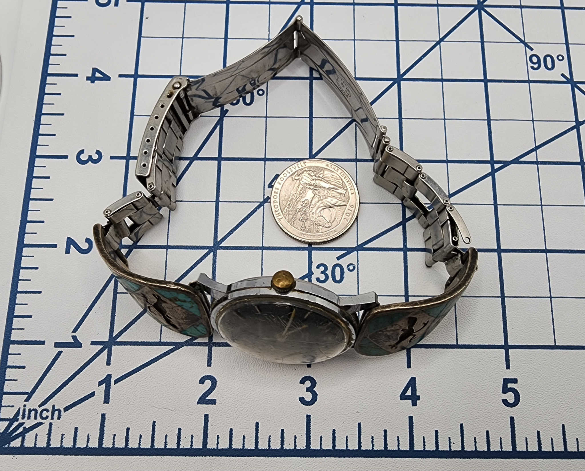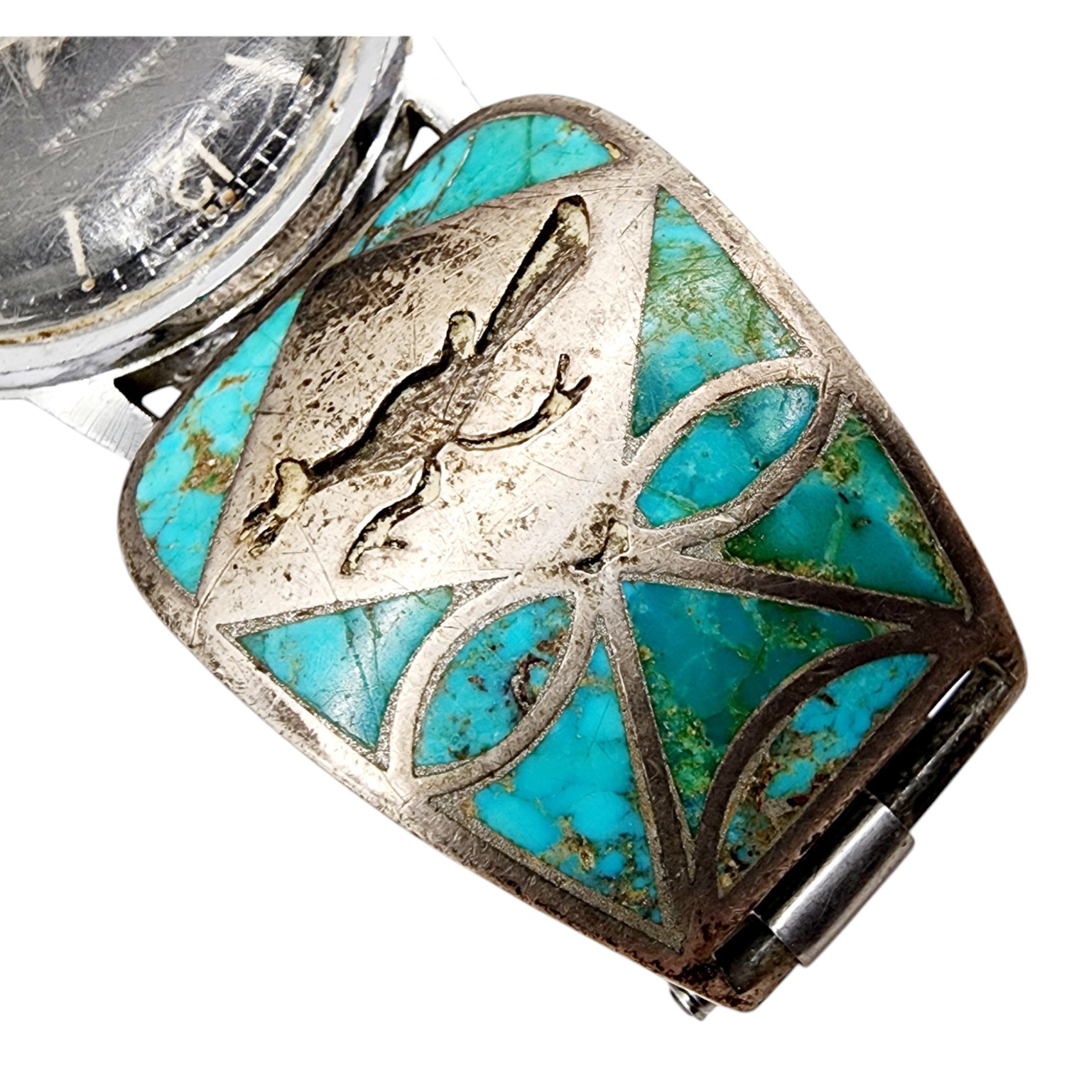 Sterling Vintage Navajo Turquoise Inlay Roadrunner Watch Tips & Watch (Needs Battery, as is, surface scratches on watch face) 67g