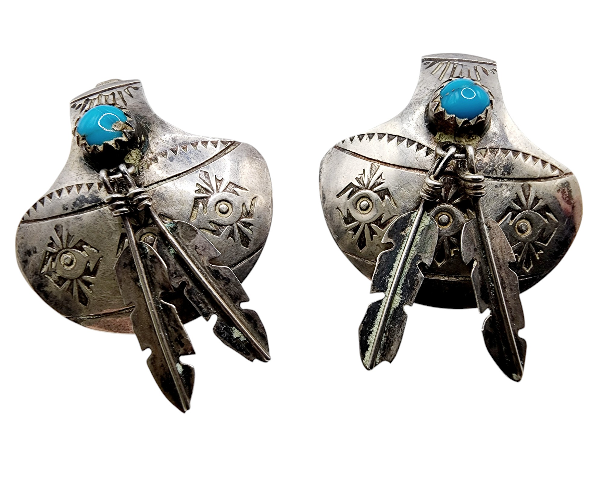 Sterling Navajo Handstamped Basket Turquoise Feather Dangle Earrings