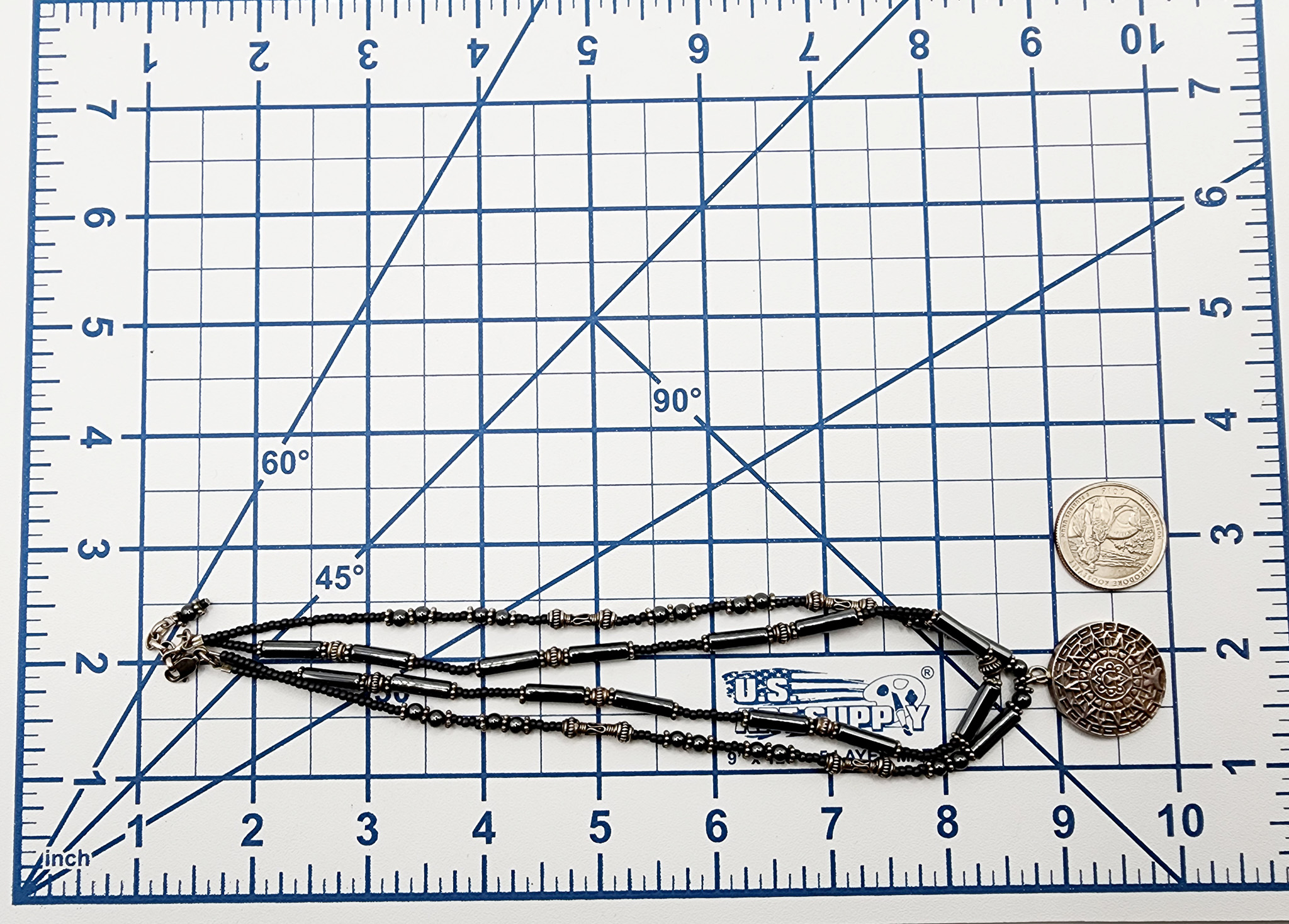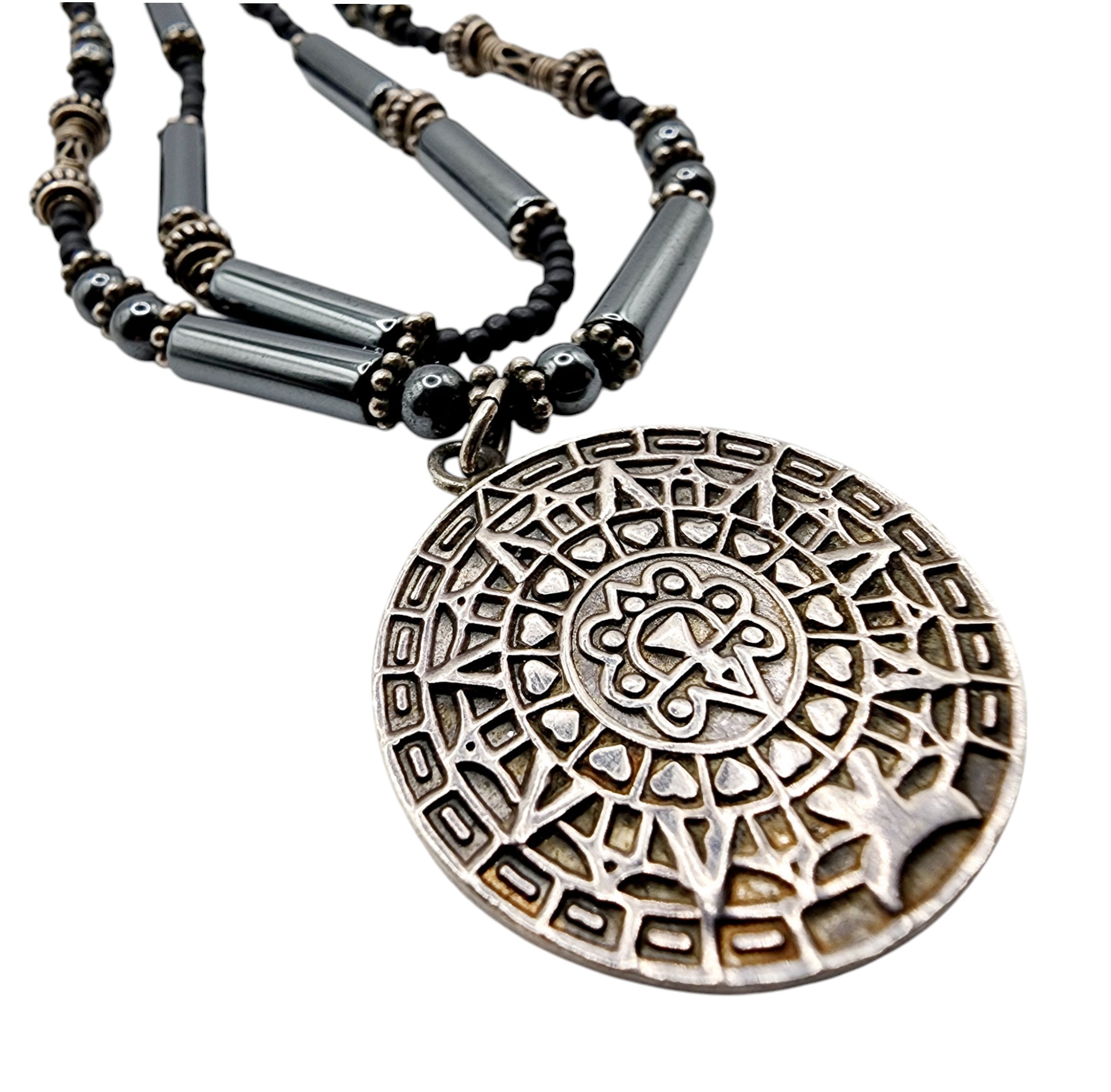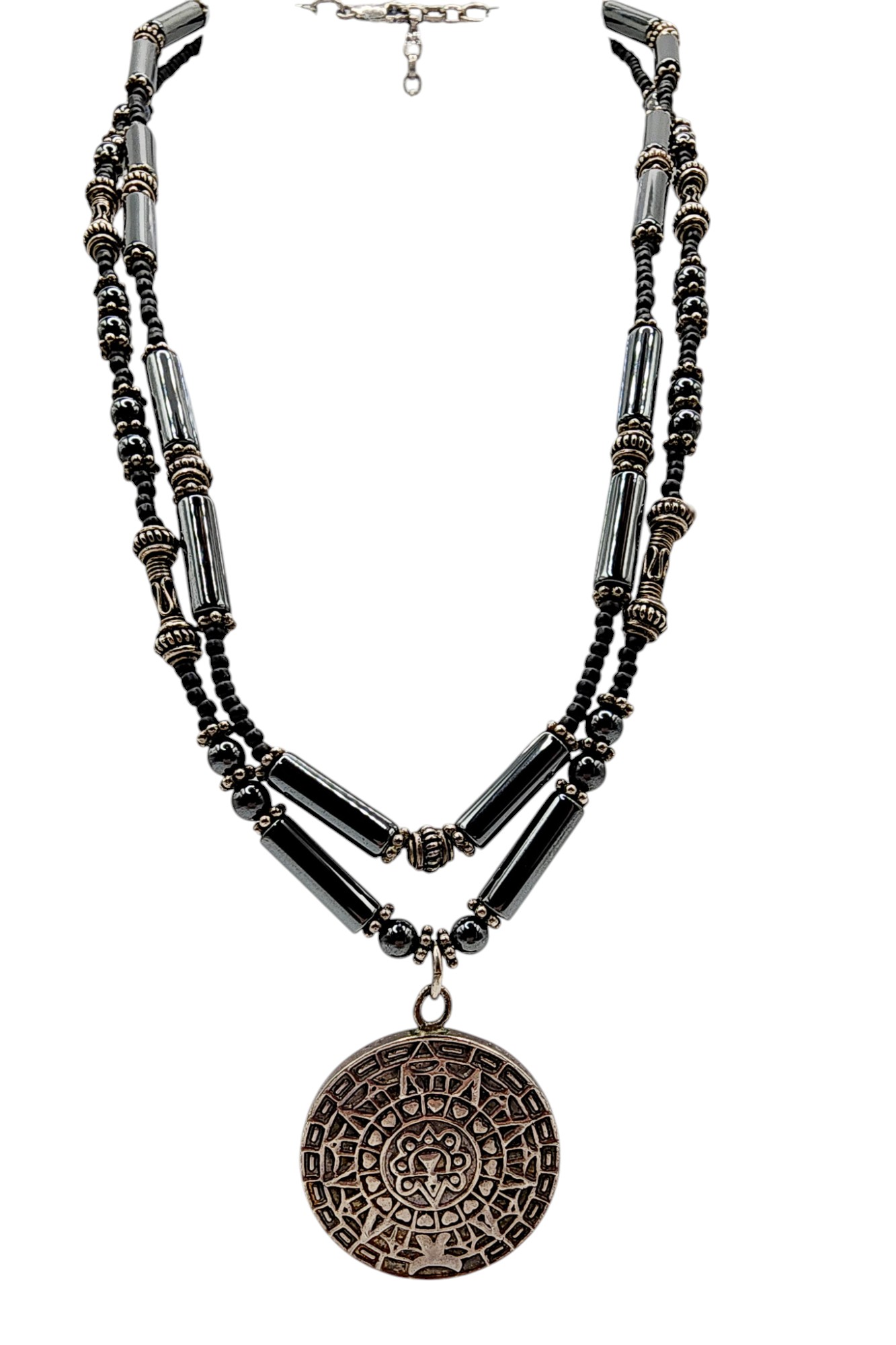 Sterling Mayan/Aztec Medallion Hematite Beaded Double Strand Necklace 42.4g
