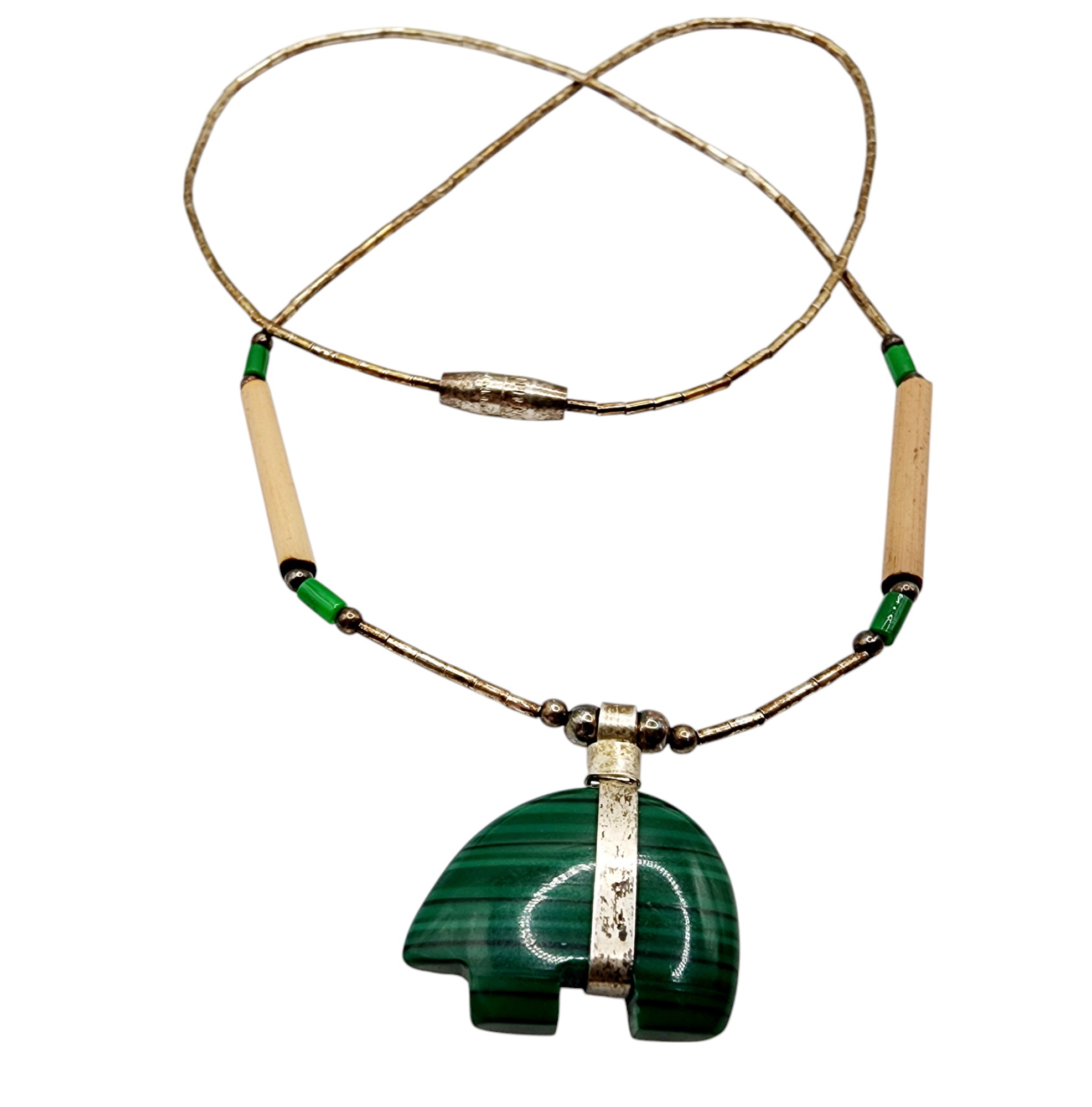 Sterling Liquid Silver Malachite Fetish Bear Necklace 4.7g