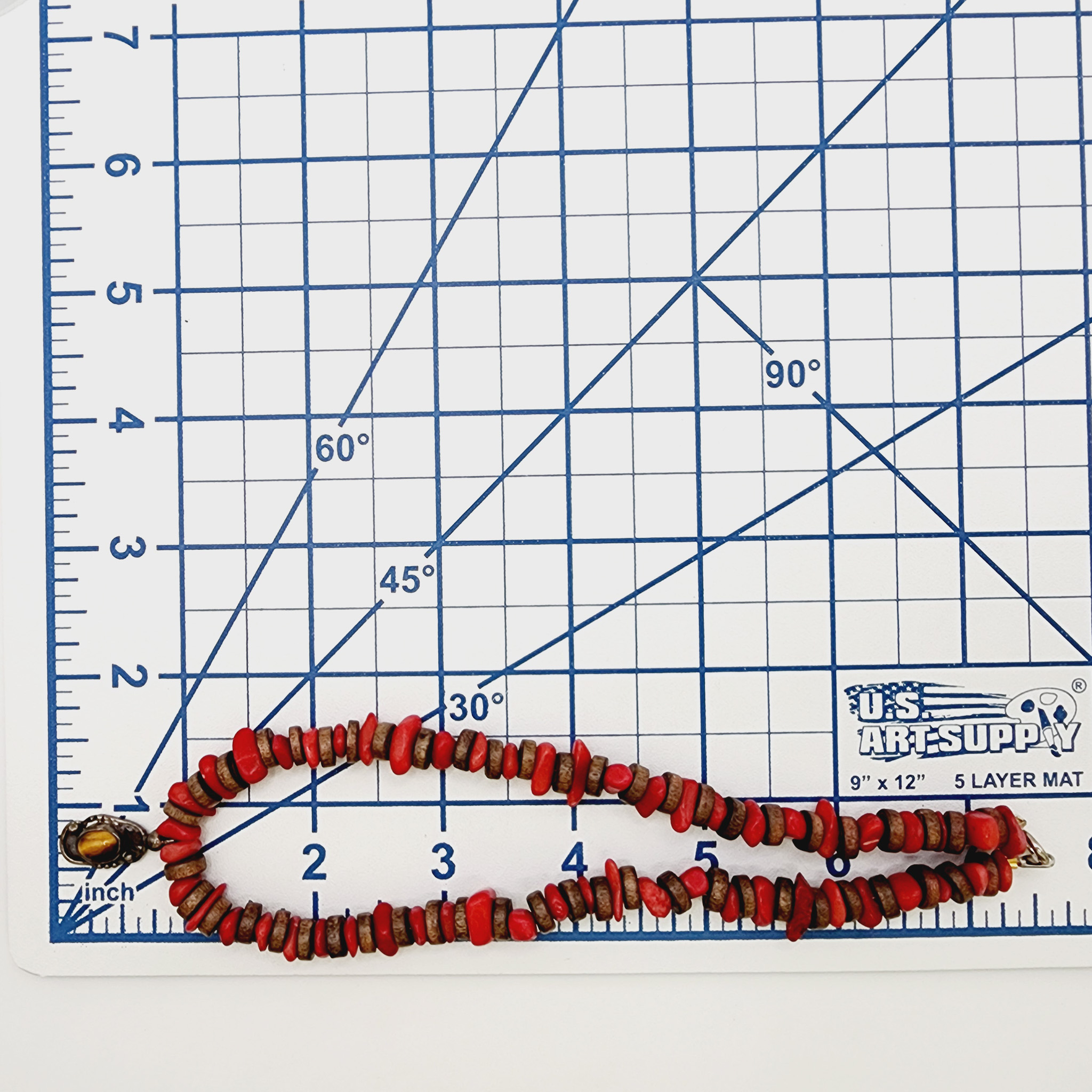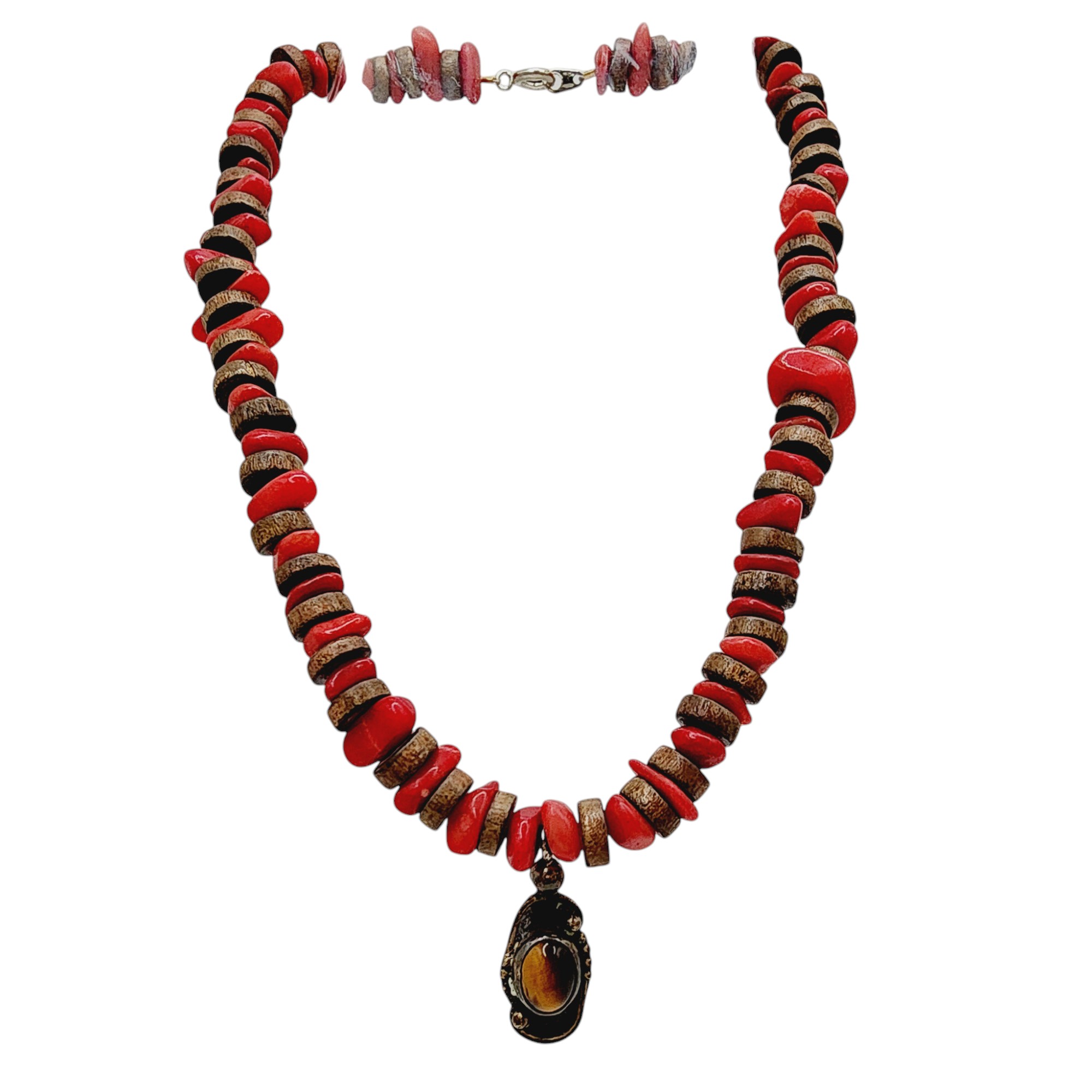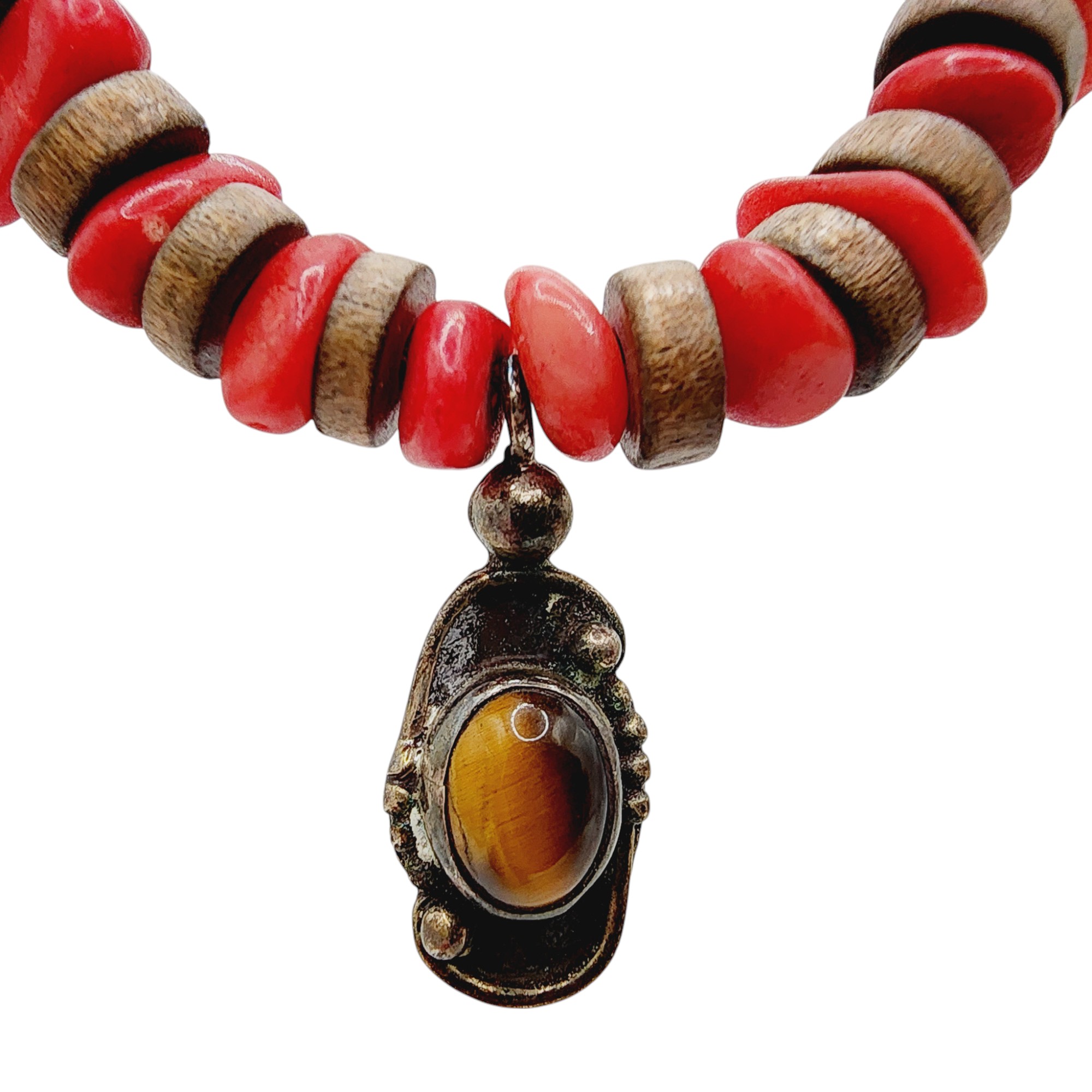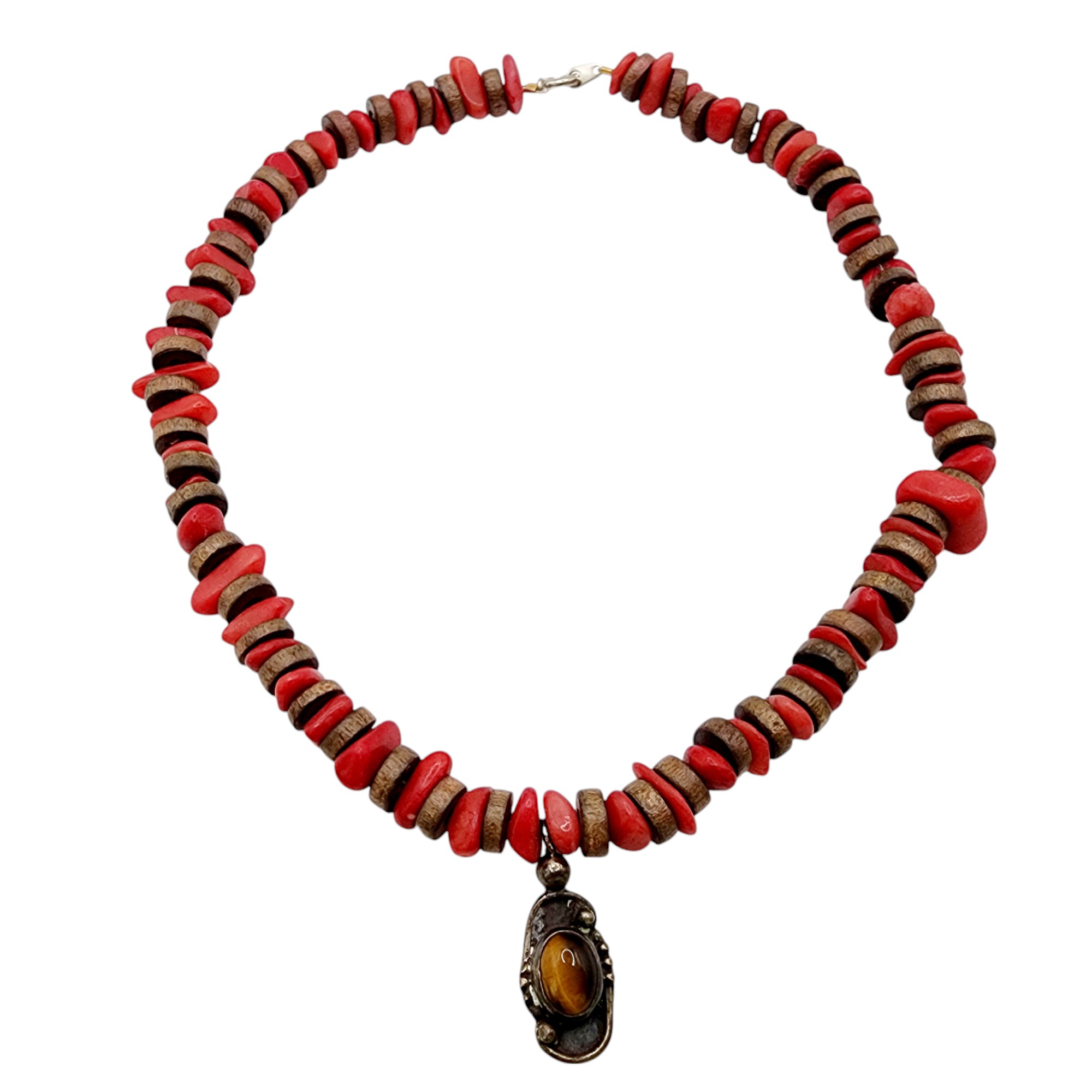 Sterling Heishe Style Coral Chip Tiger Eye Pendant Necklace 23.8g