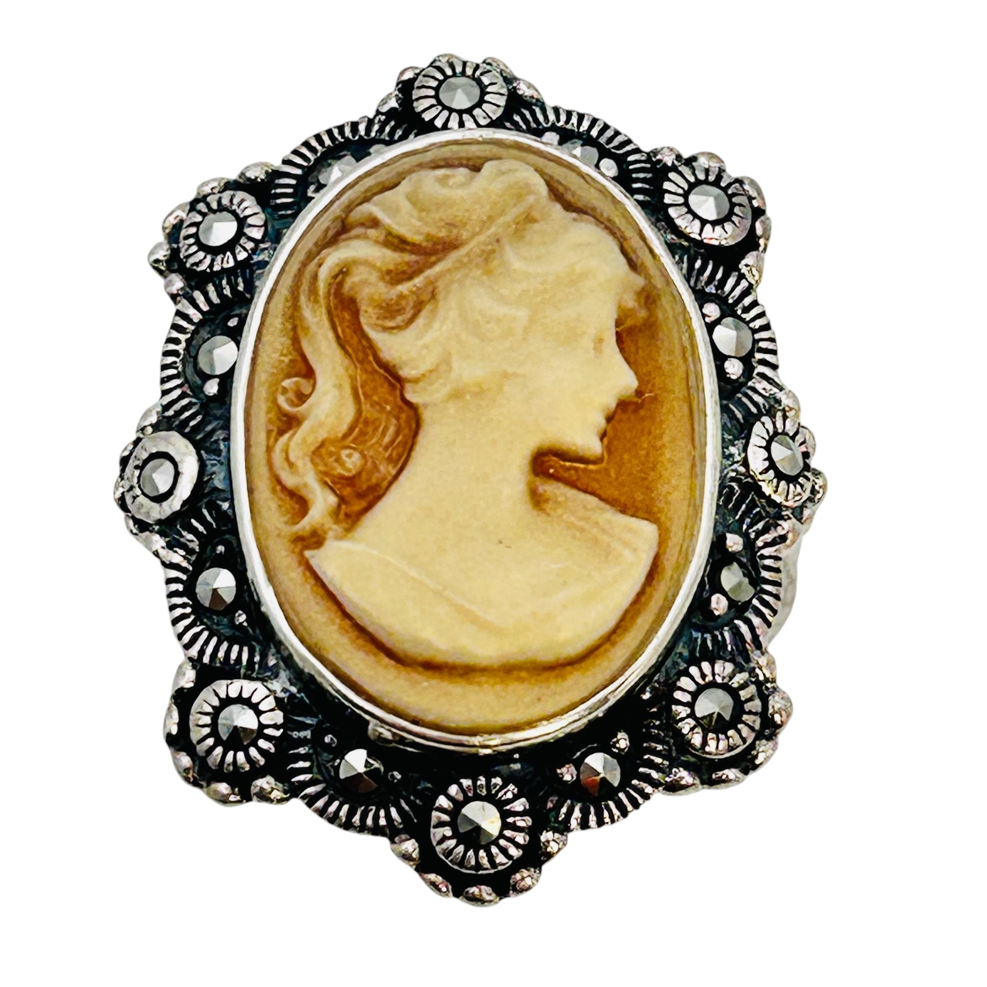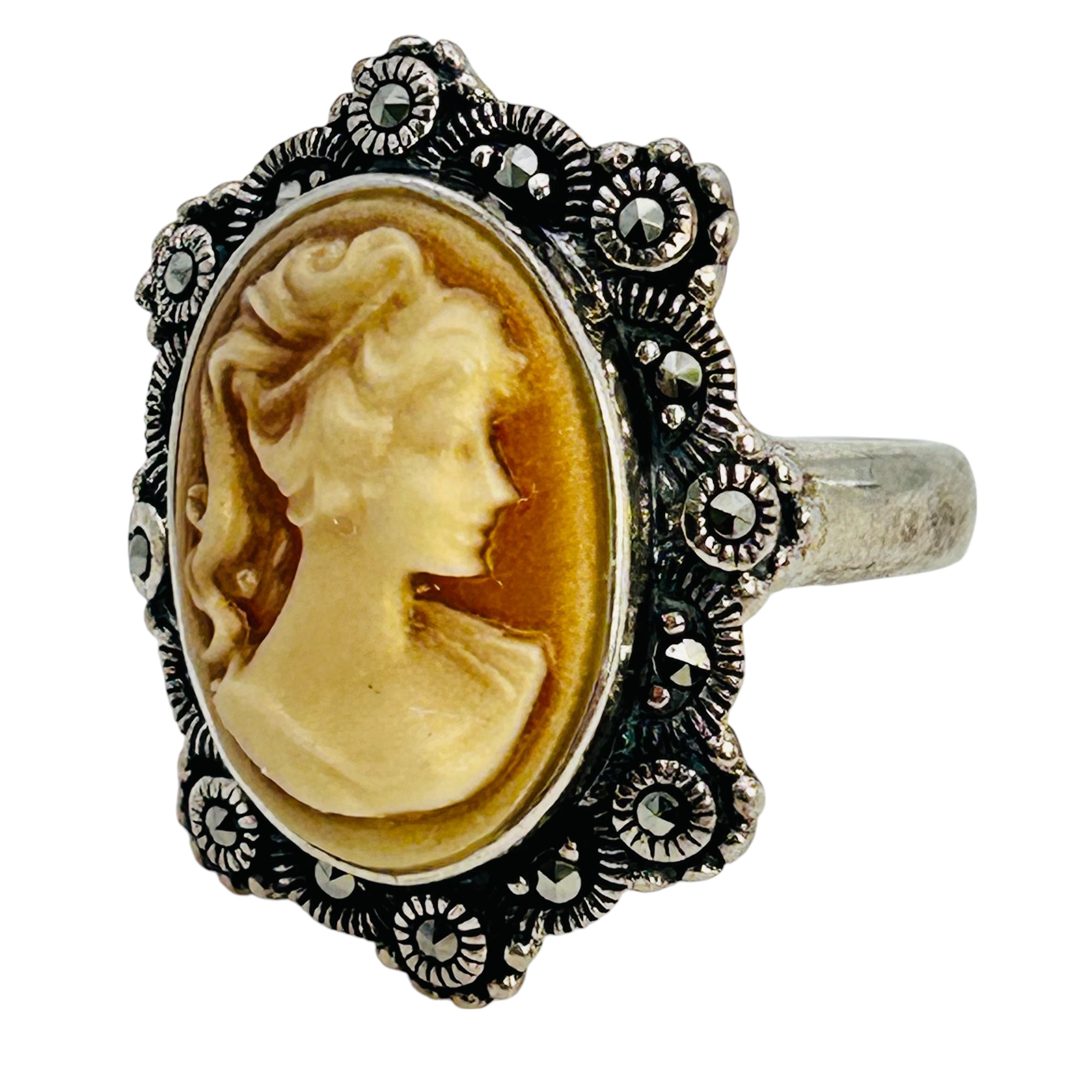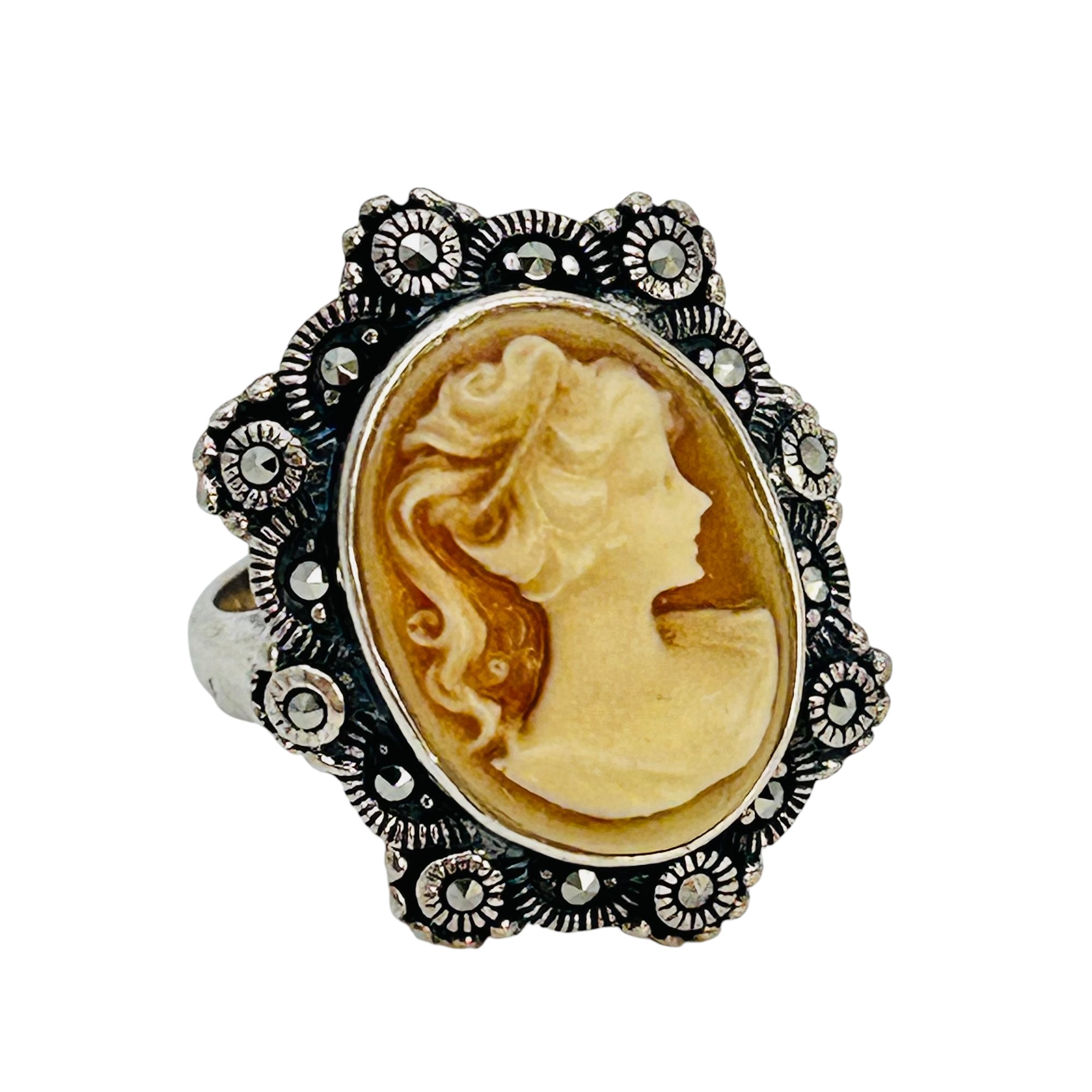 CFJ Shell carved cameo ring MARCASITE detail size 8 6.6 g