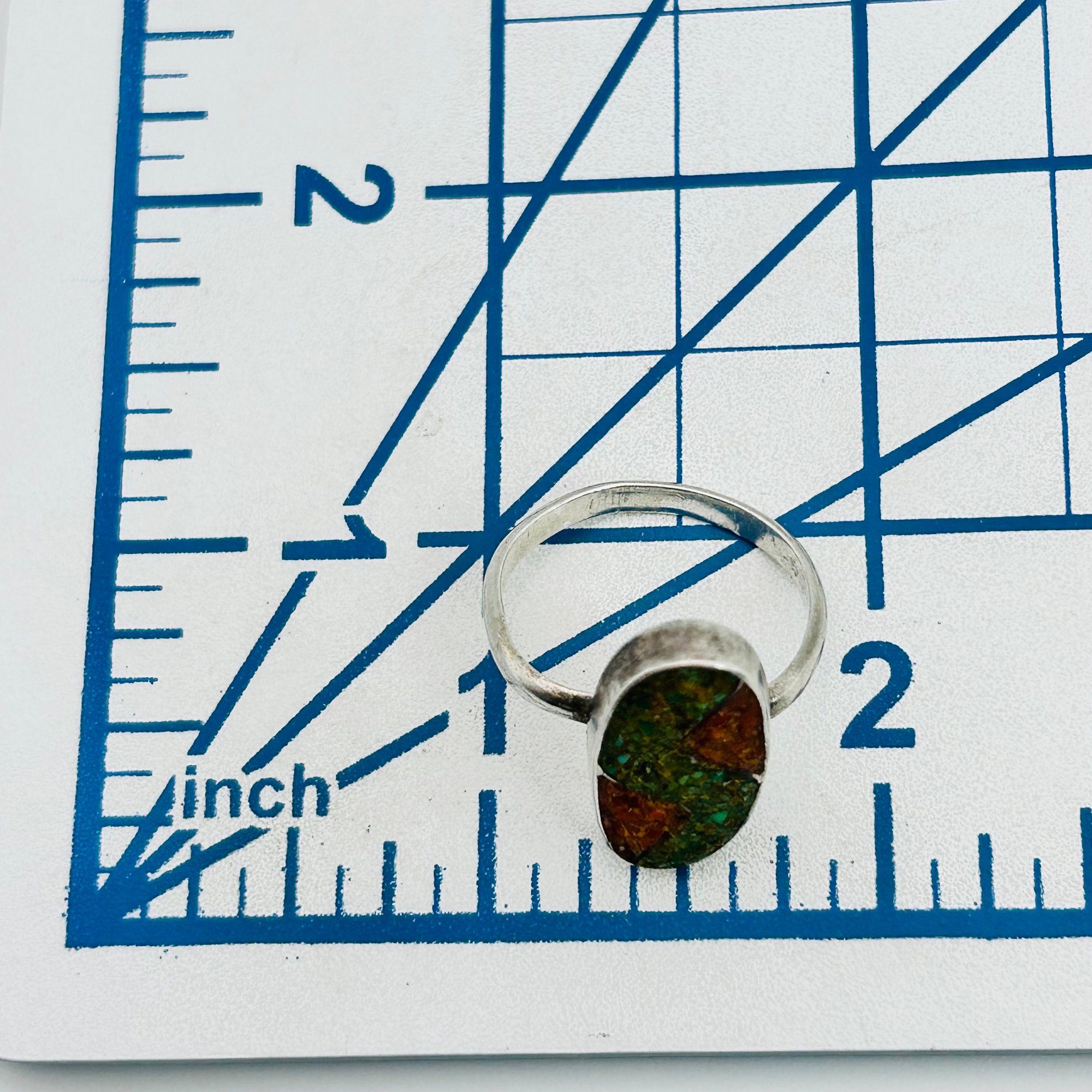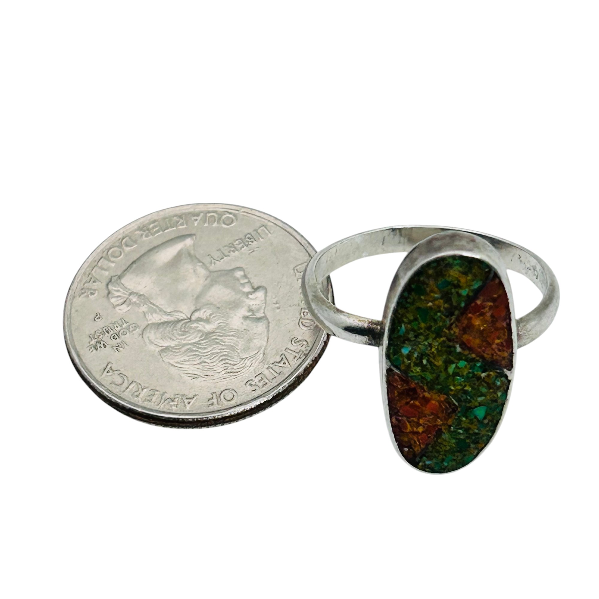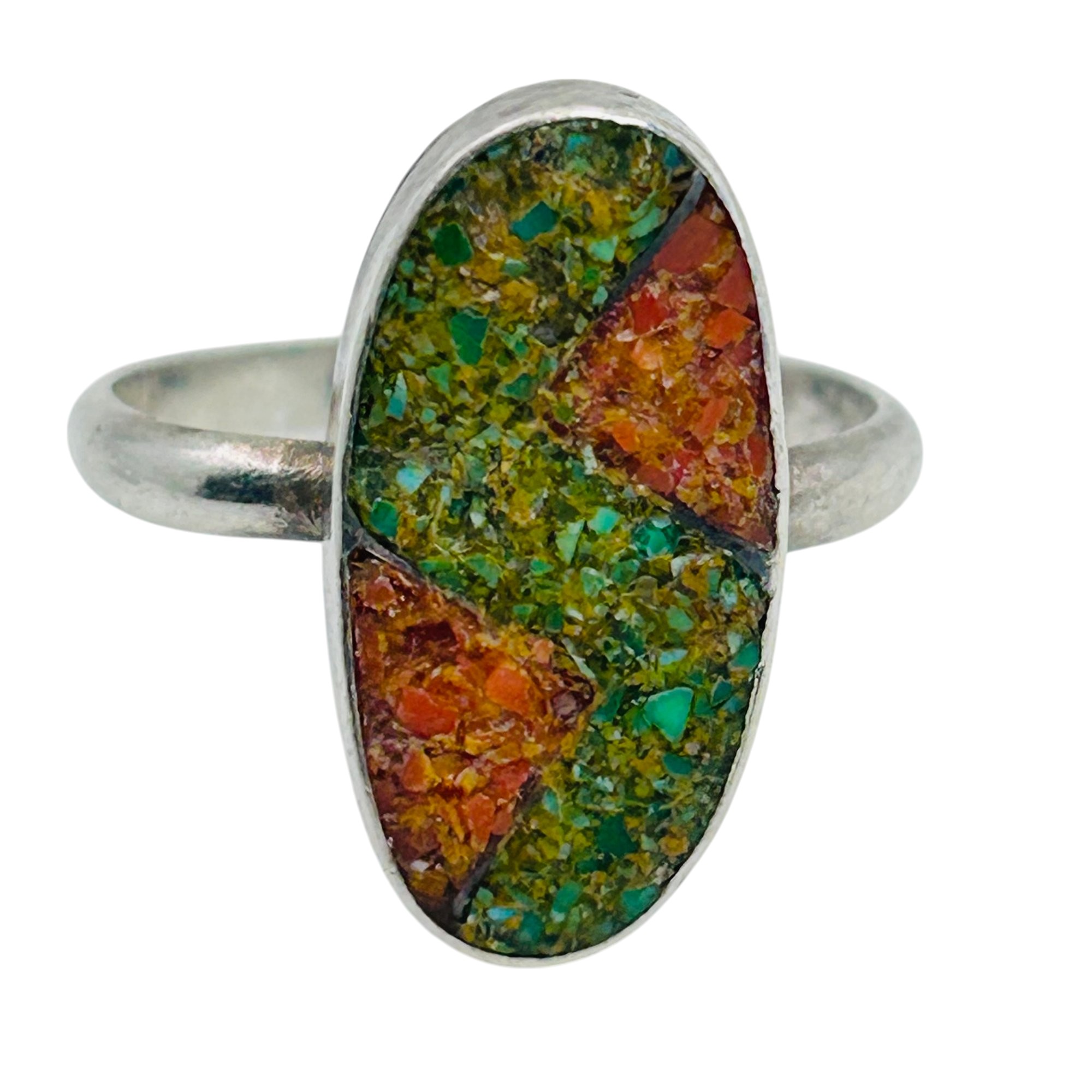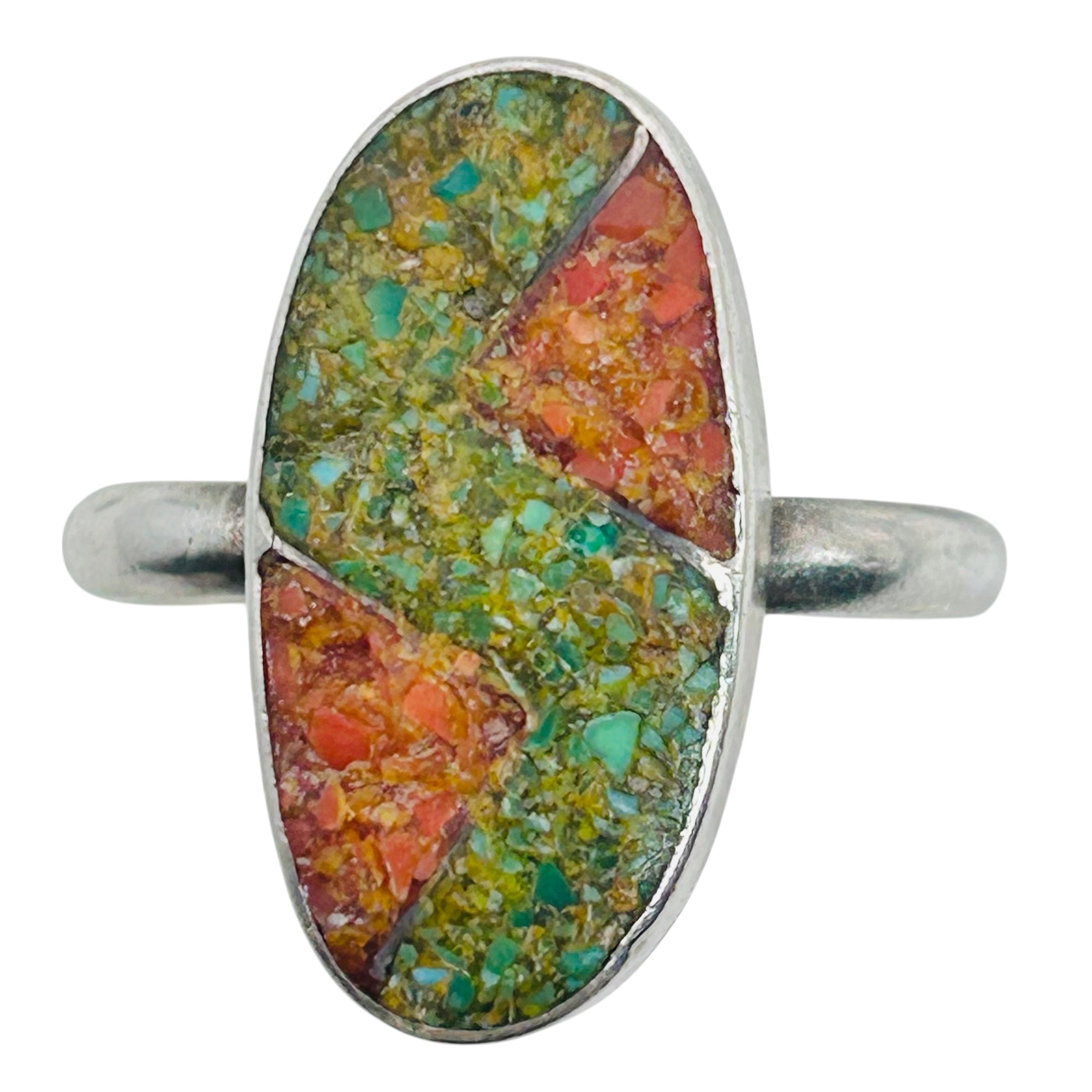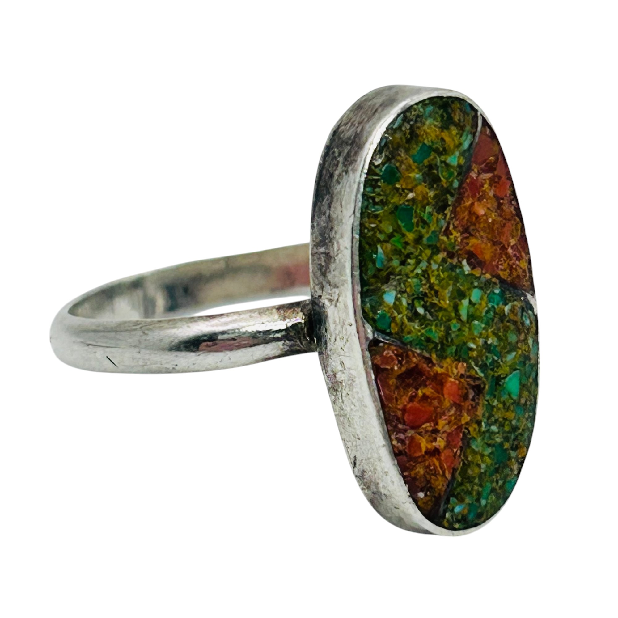 Native American zigzag inlay turquoise and coral oval Sterling ring size 9 3.96 g
