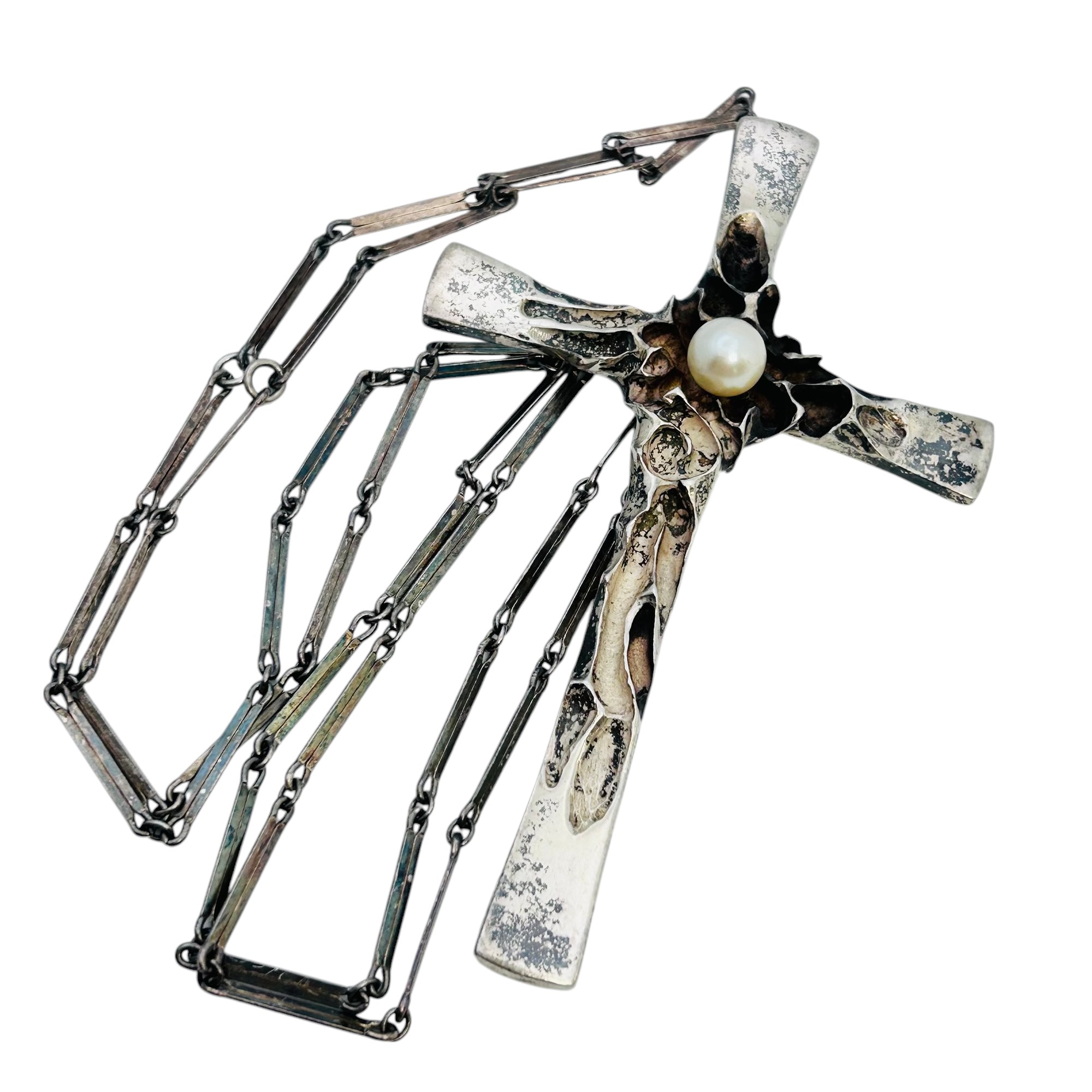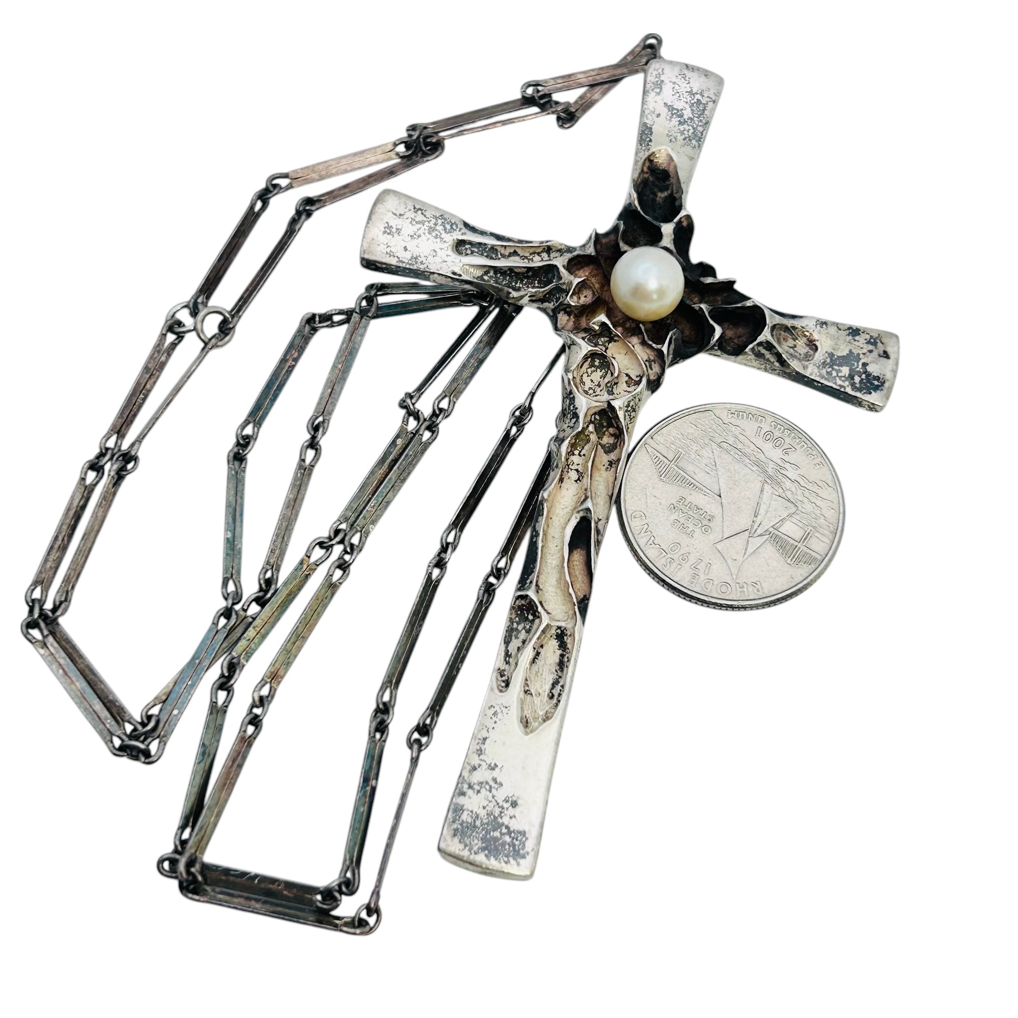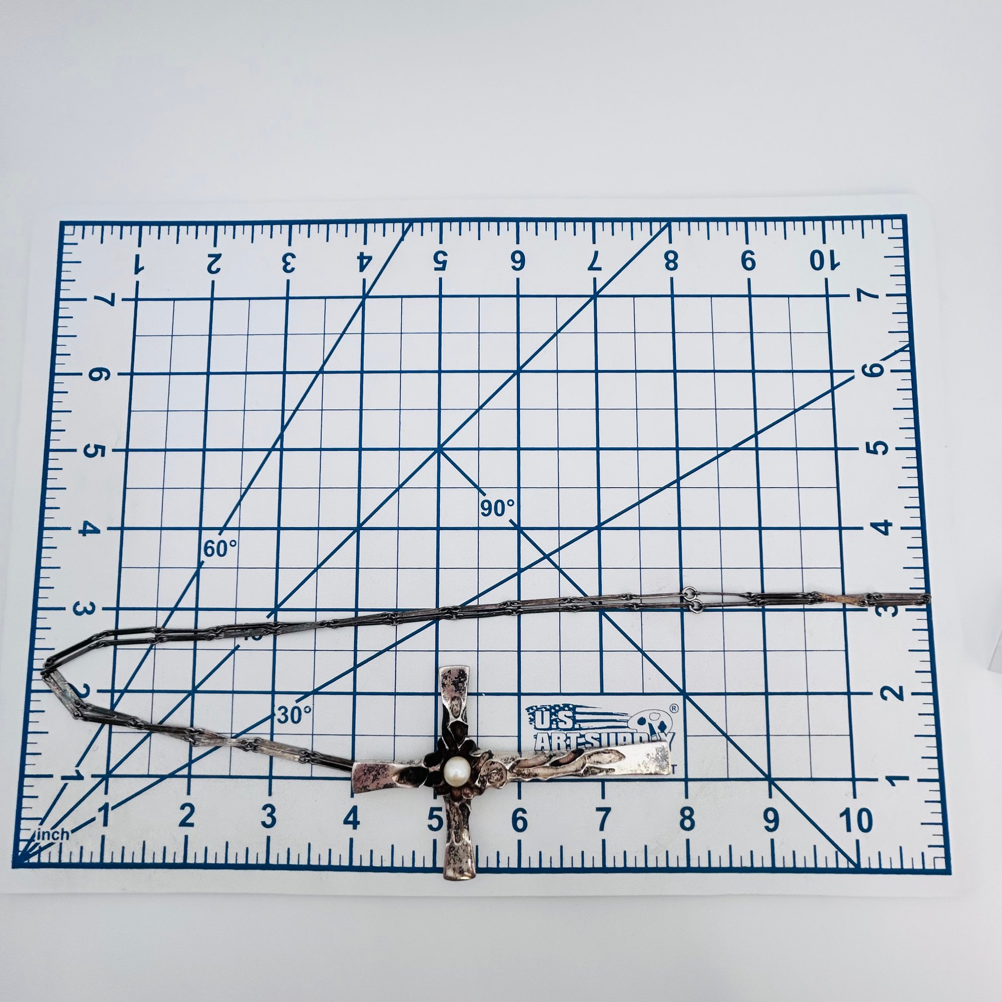 SECREST Sterling solid cross with pearl Sterling bar linked necklace 49.12 g