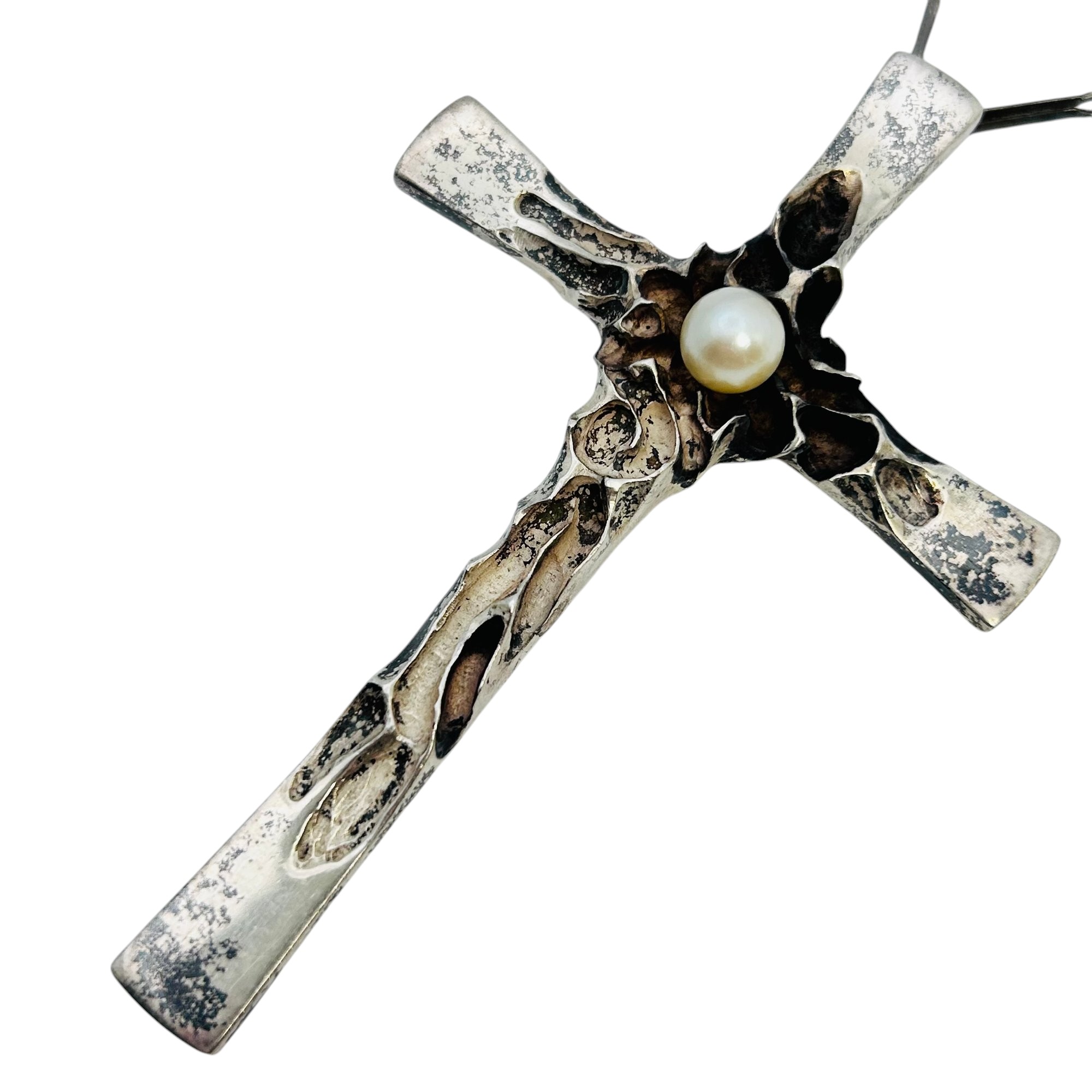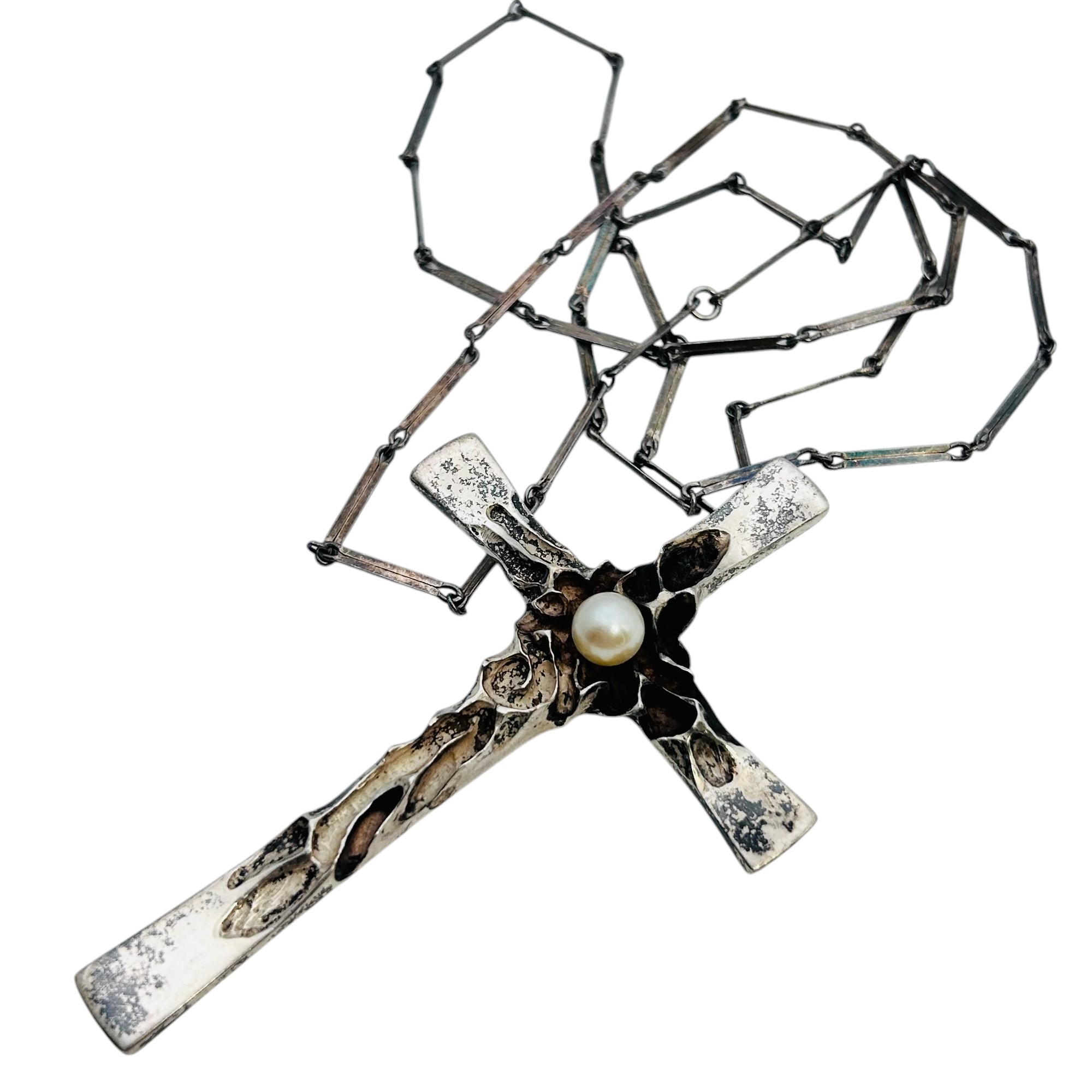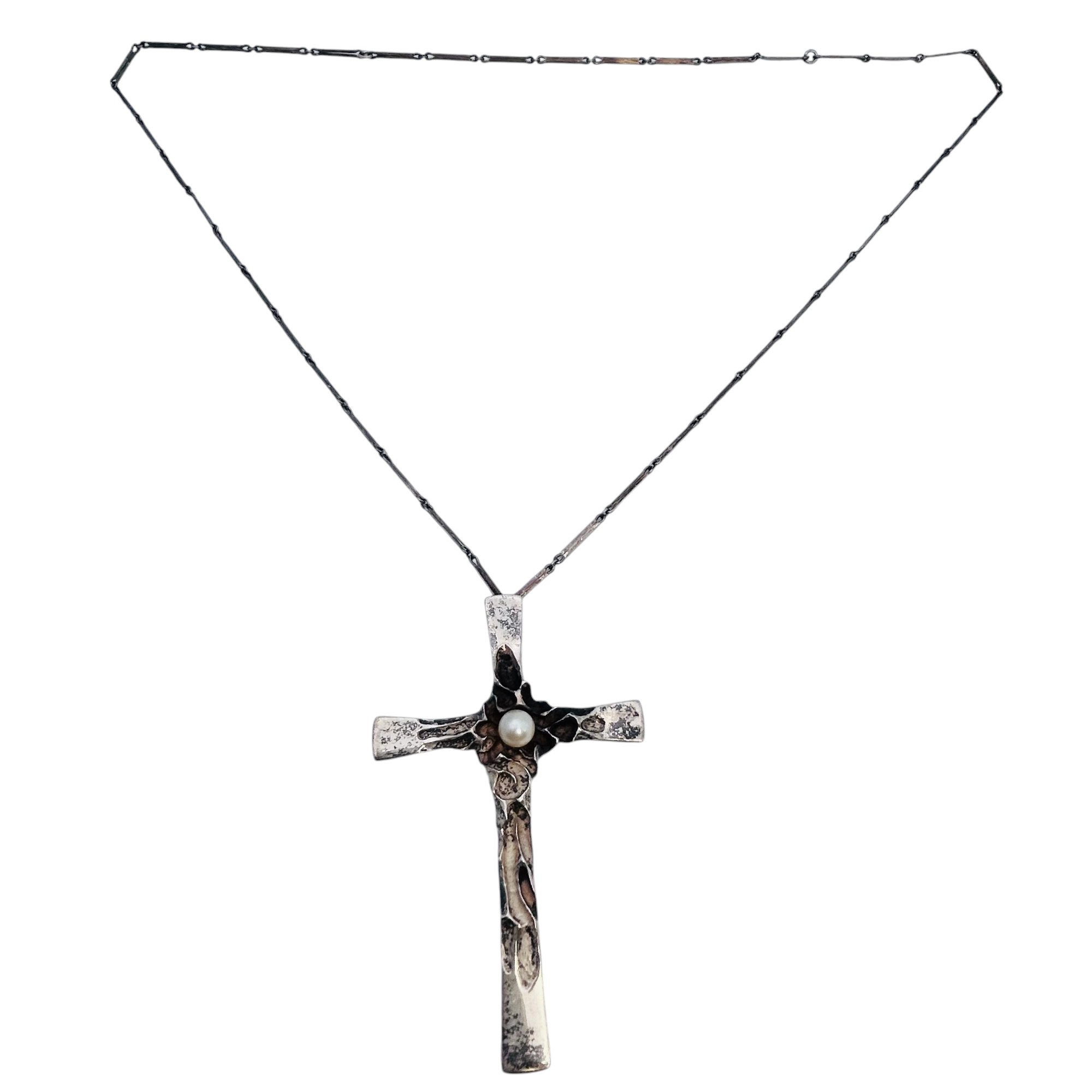 SECREST Sterling solid cross with pearl Sterling bar linked necklace 49.12 g