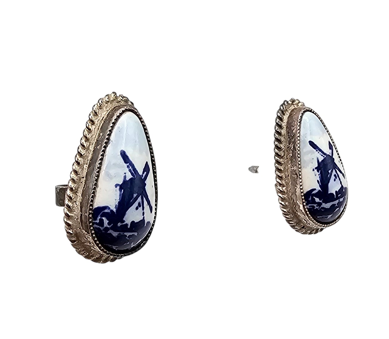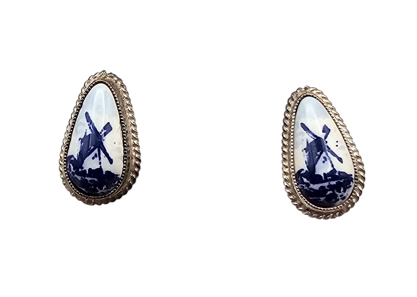 Delft Blue Porcelain Windmill Sterling Silver Earrings 2.7 G