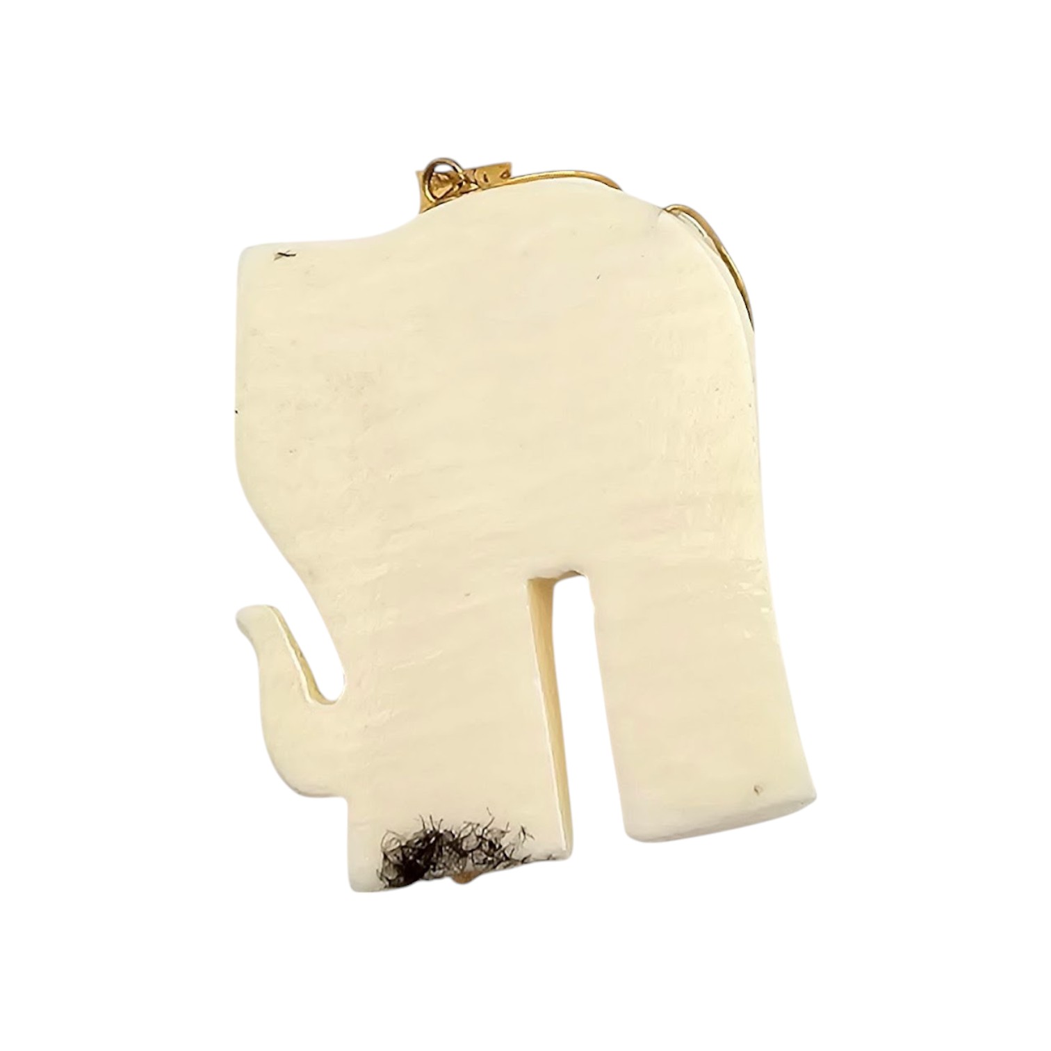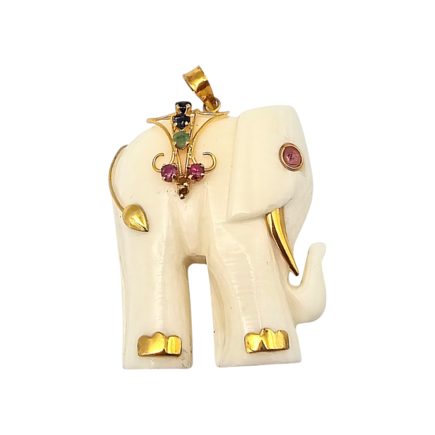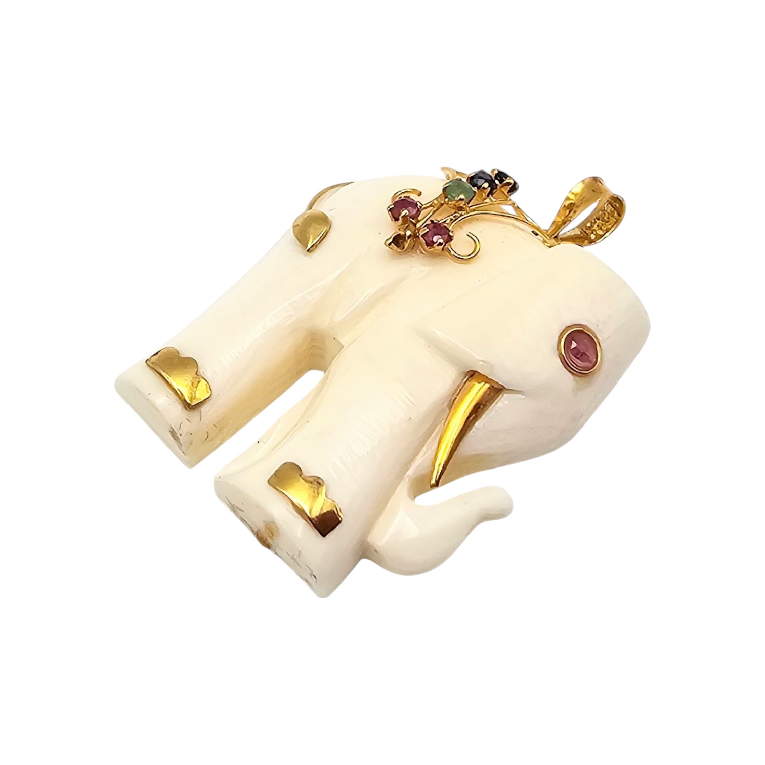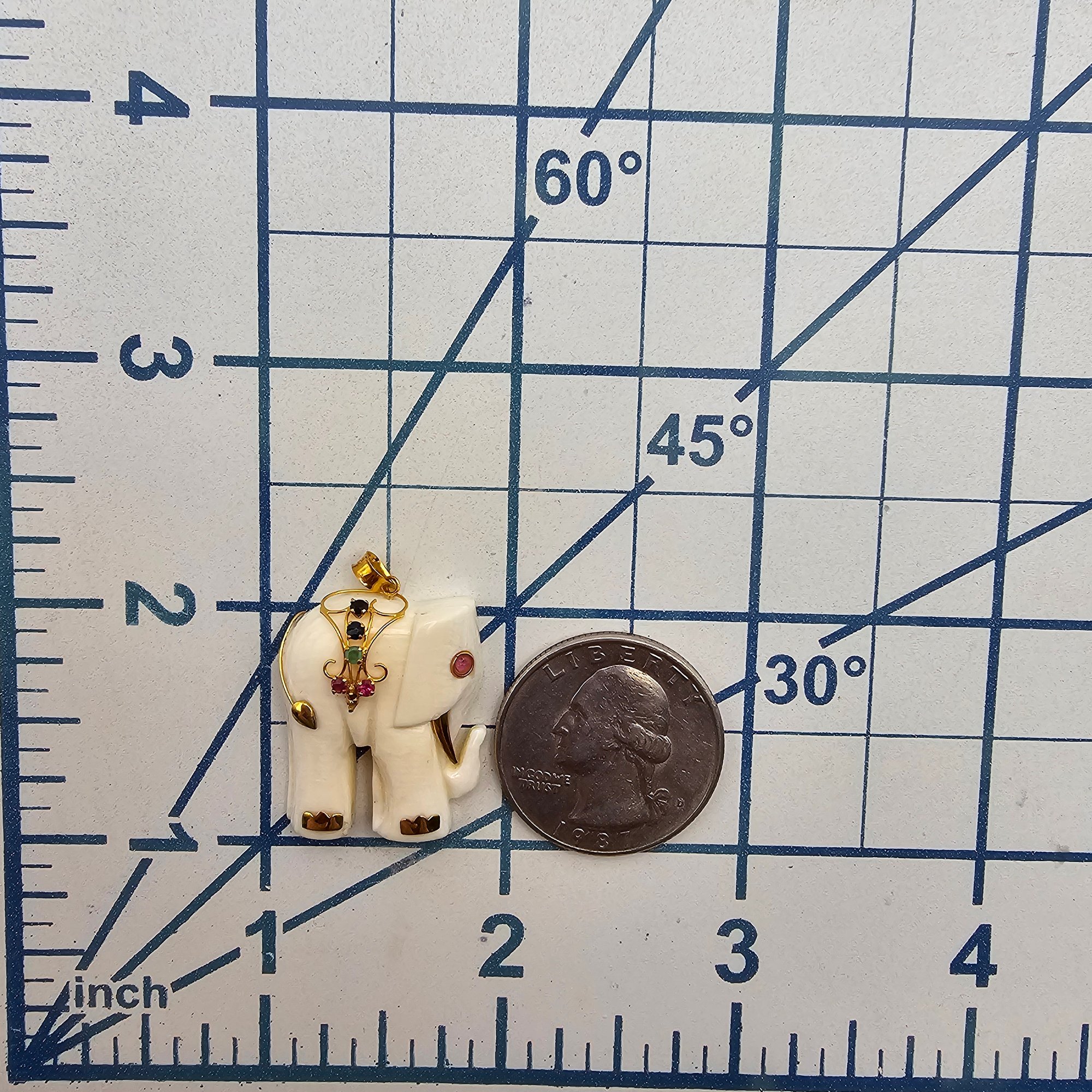 Bone Carved Ruby Emerald Sapphire 14K Gold Elephant Pendant 4.1 G