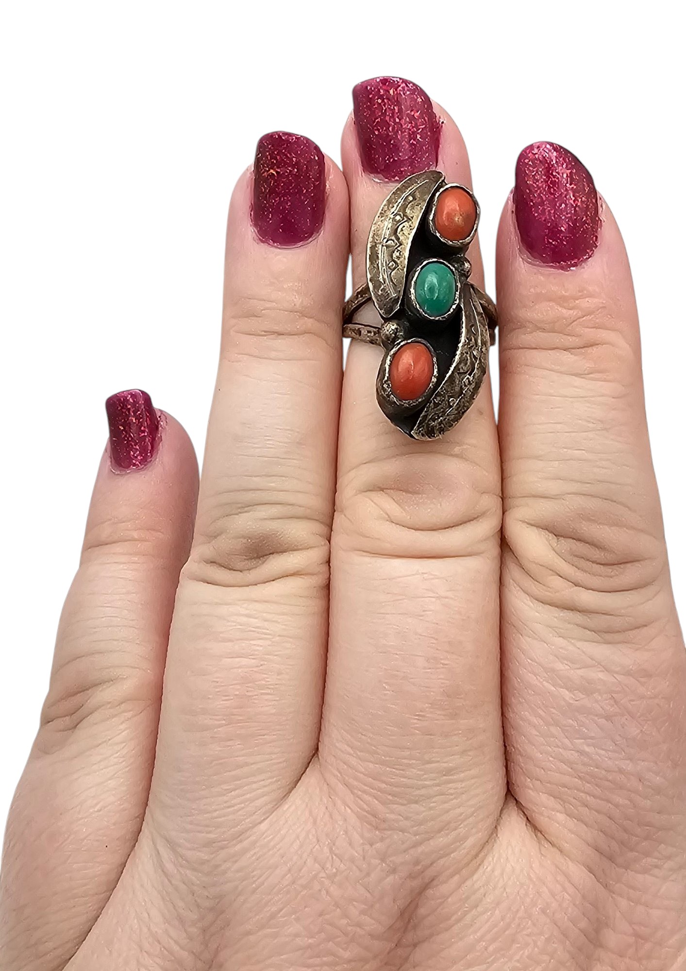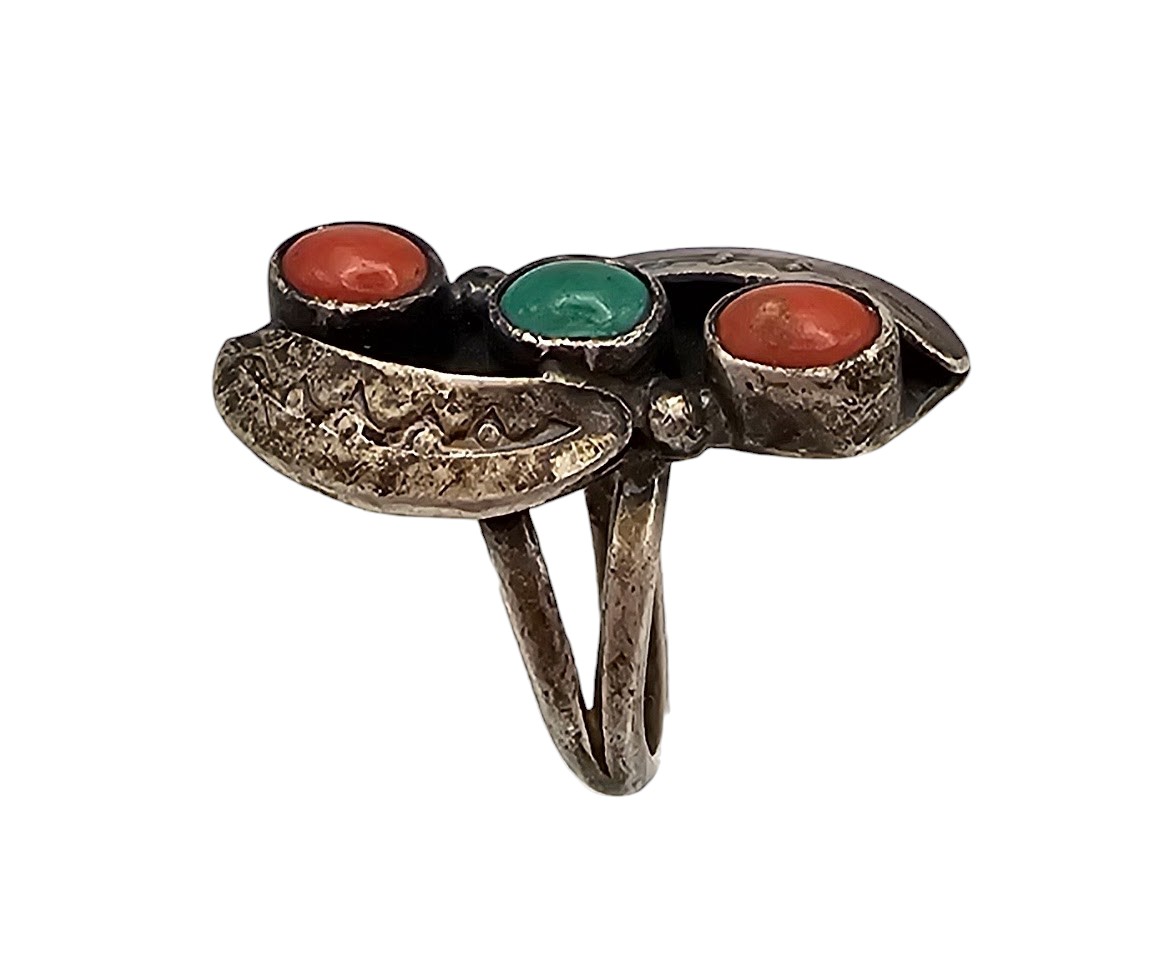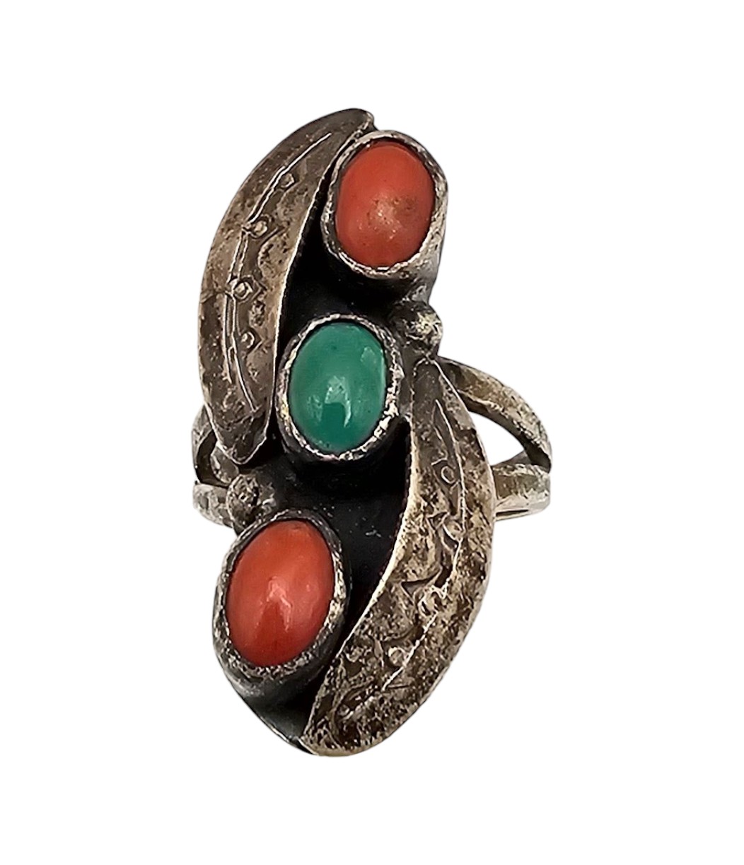 Navajo Double Turquoise Coral Sterling Silver Ring Size 6 6.9 G