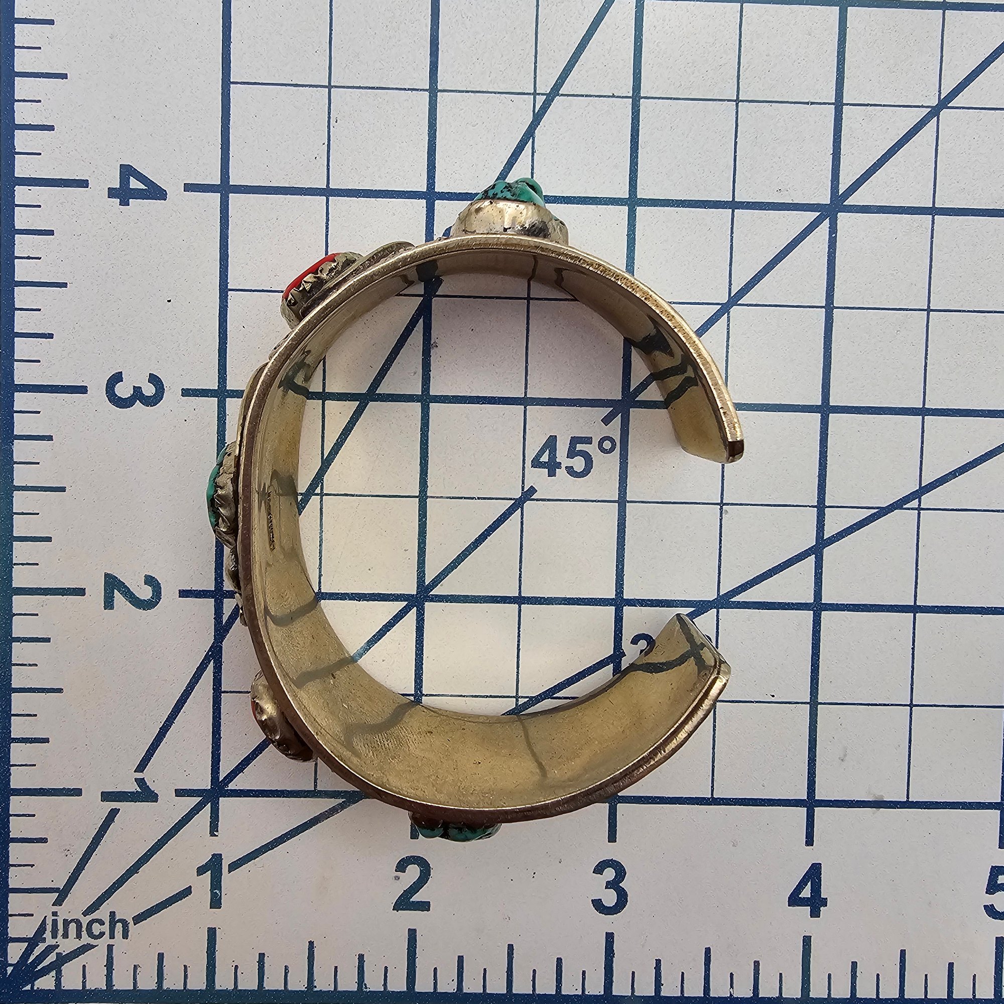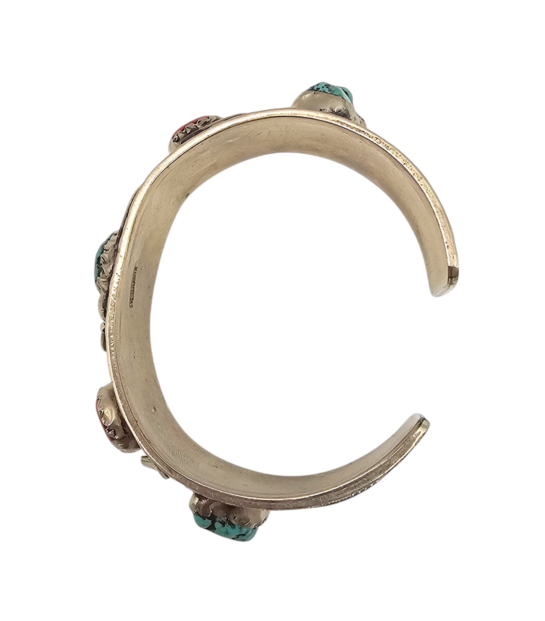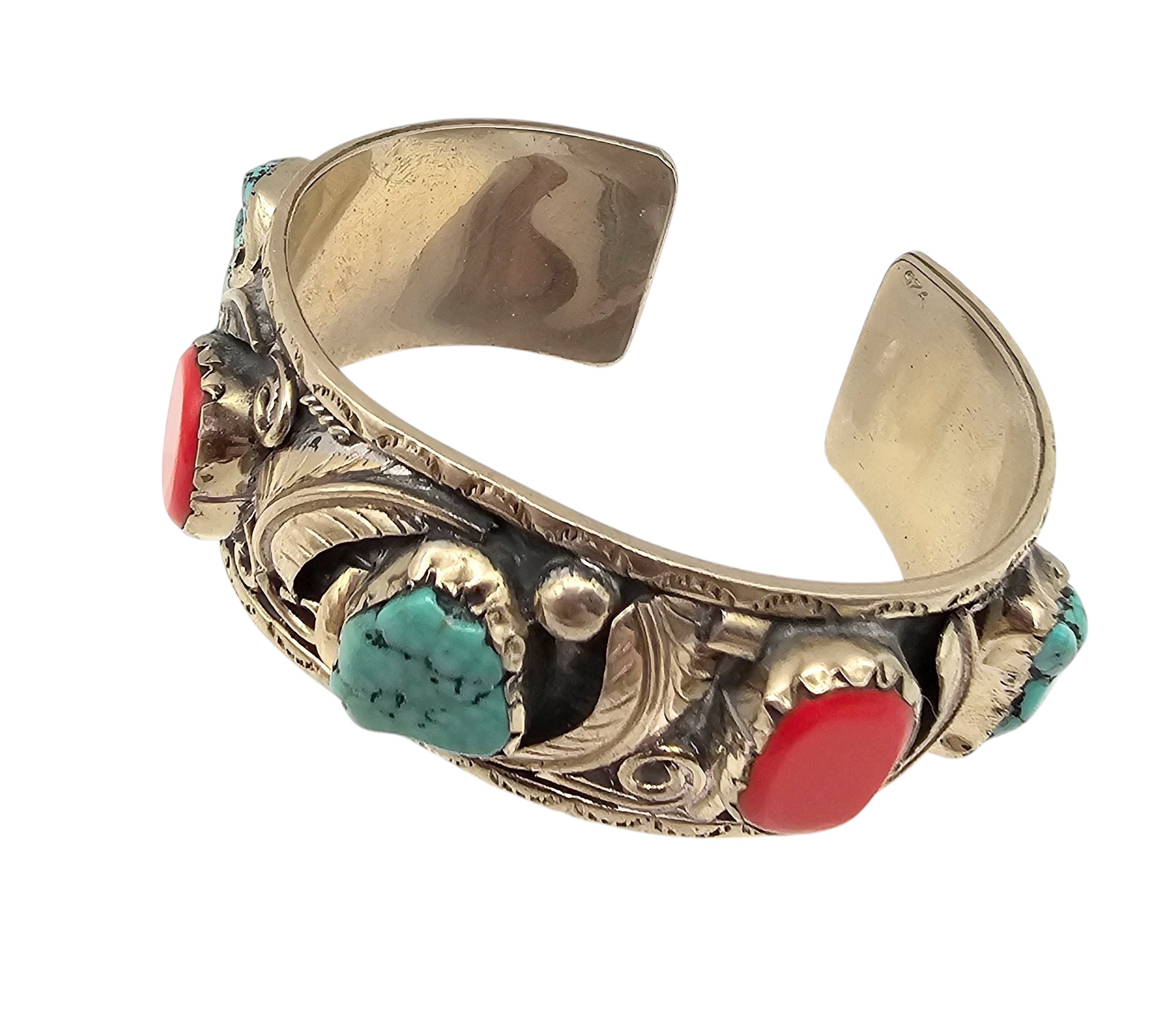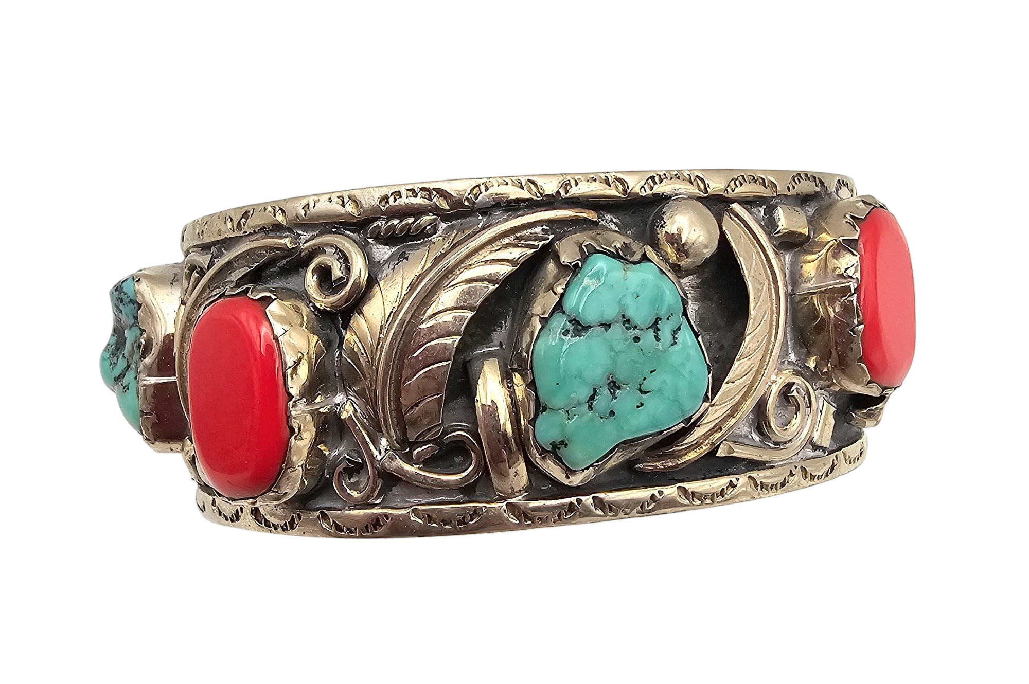 Mexico Coral Turquoise Sterling Silver Leaf Design Chunky Cuff Bracelet 43.2 G