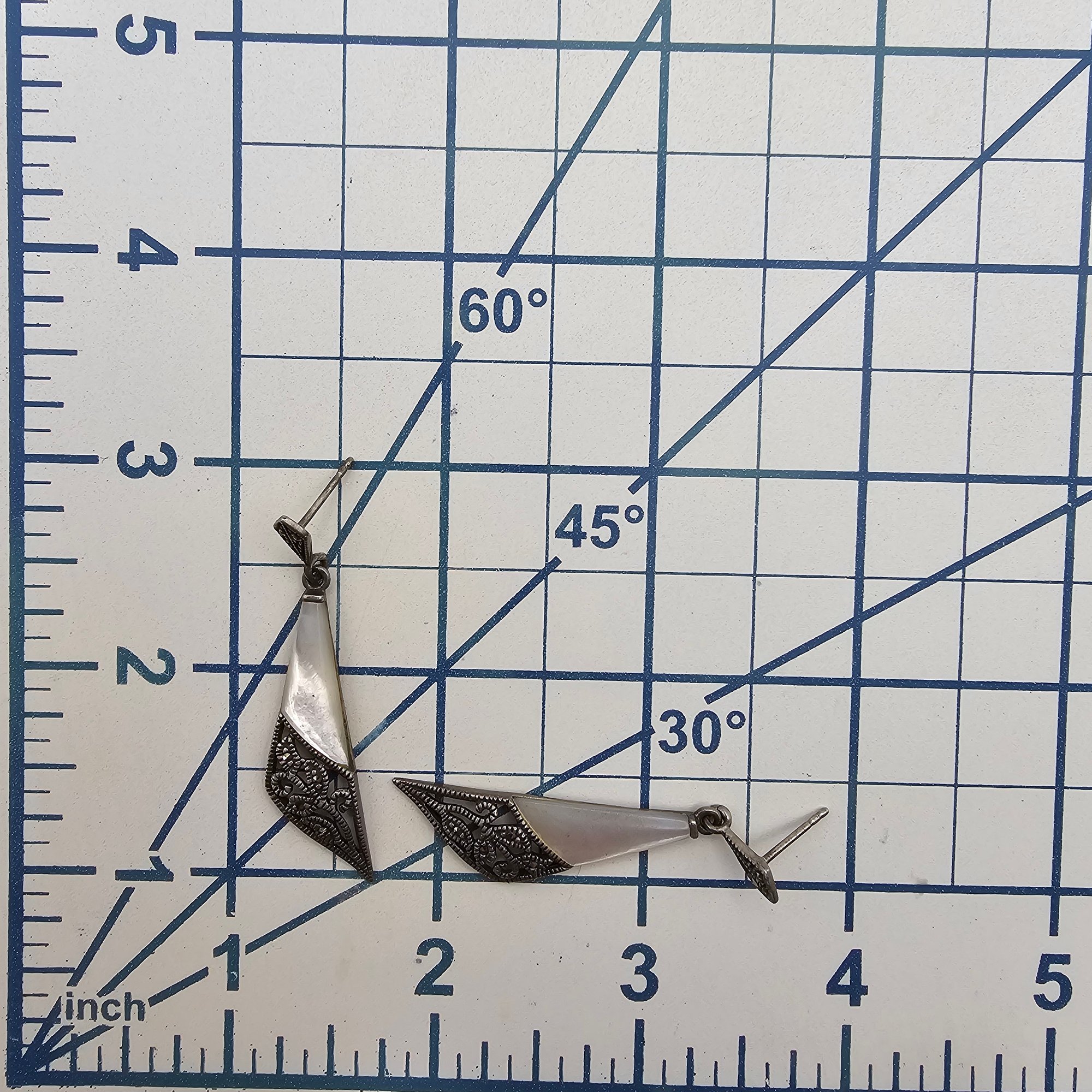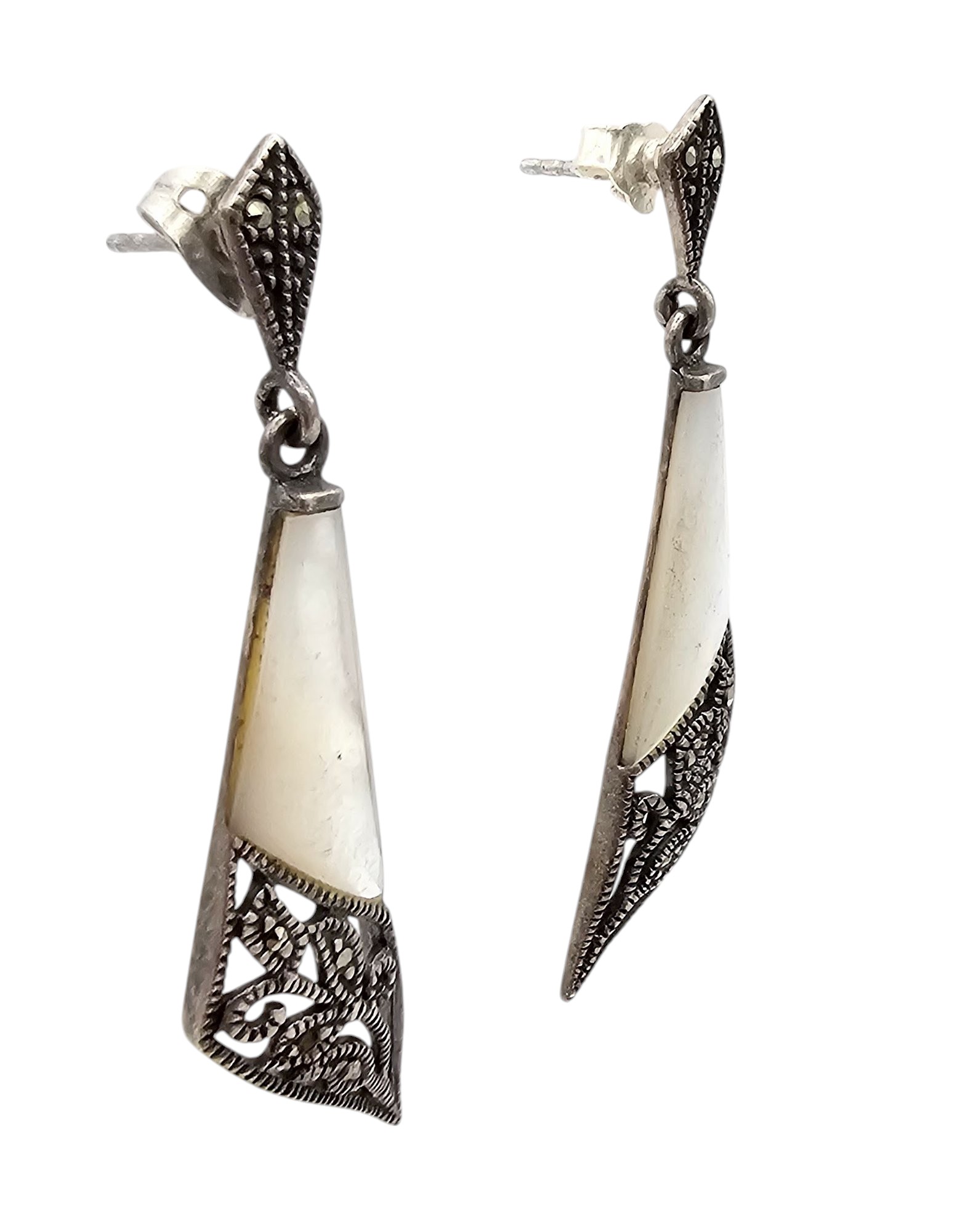 Mexico Mother Of Pearl Marcasite Sterling Silver Drop Dangle Earrings 6.4 G