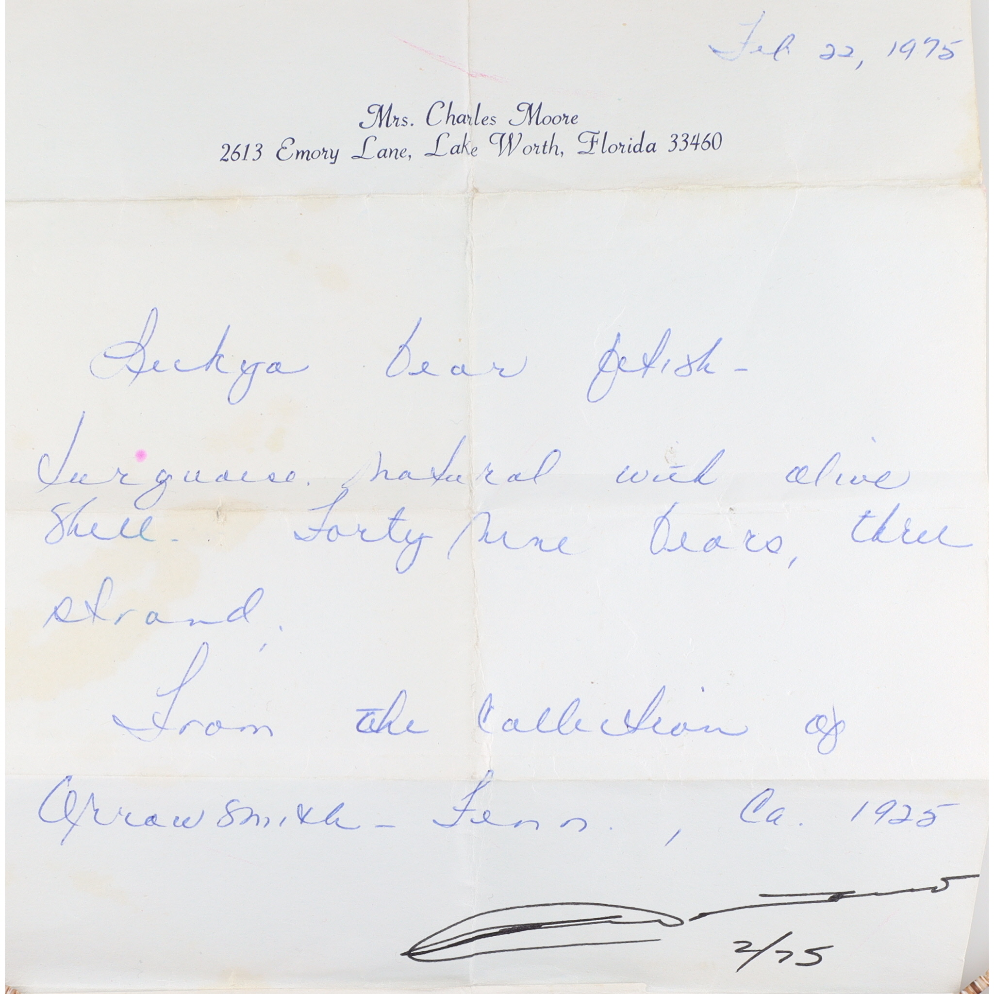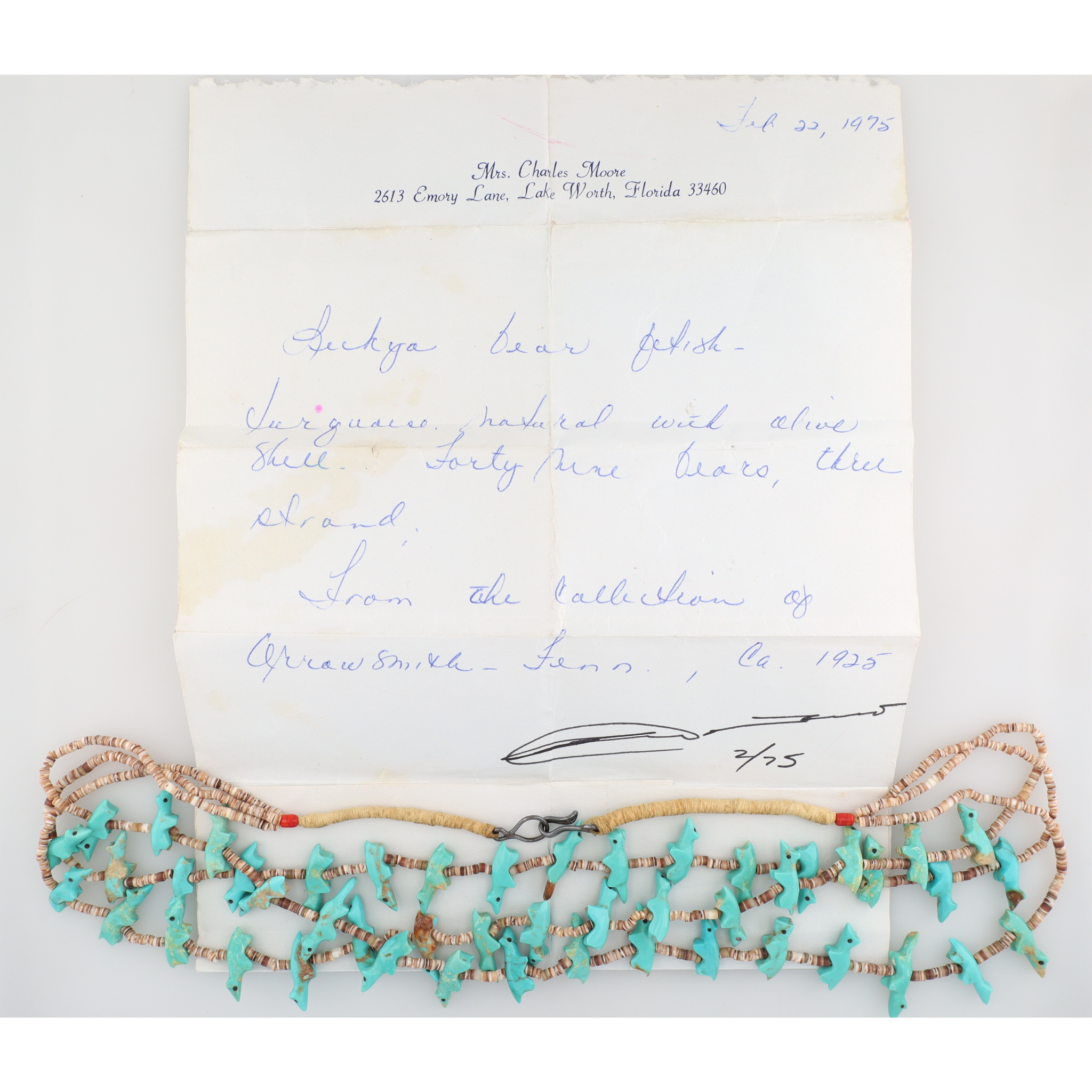 -Note: Leekya Bear Fetish Turquoise Natural With Alive Shell. Forty Mini Bears, Three Strand. From the Collection of Arrowsmith-Fenn. Circa 1925
