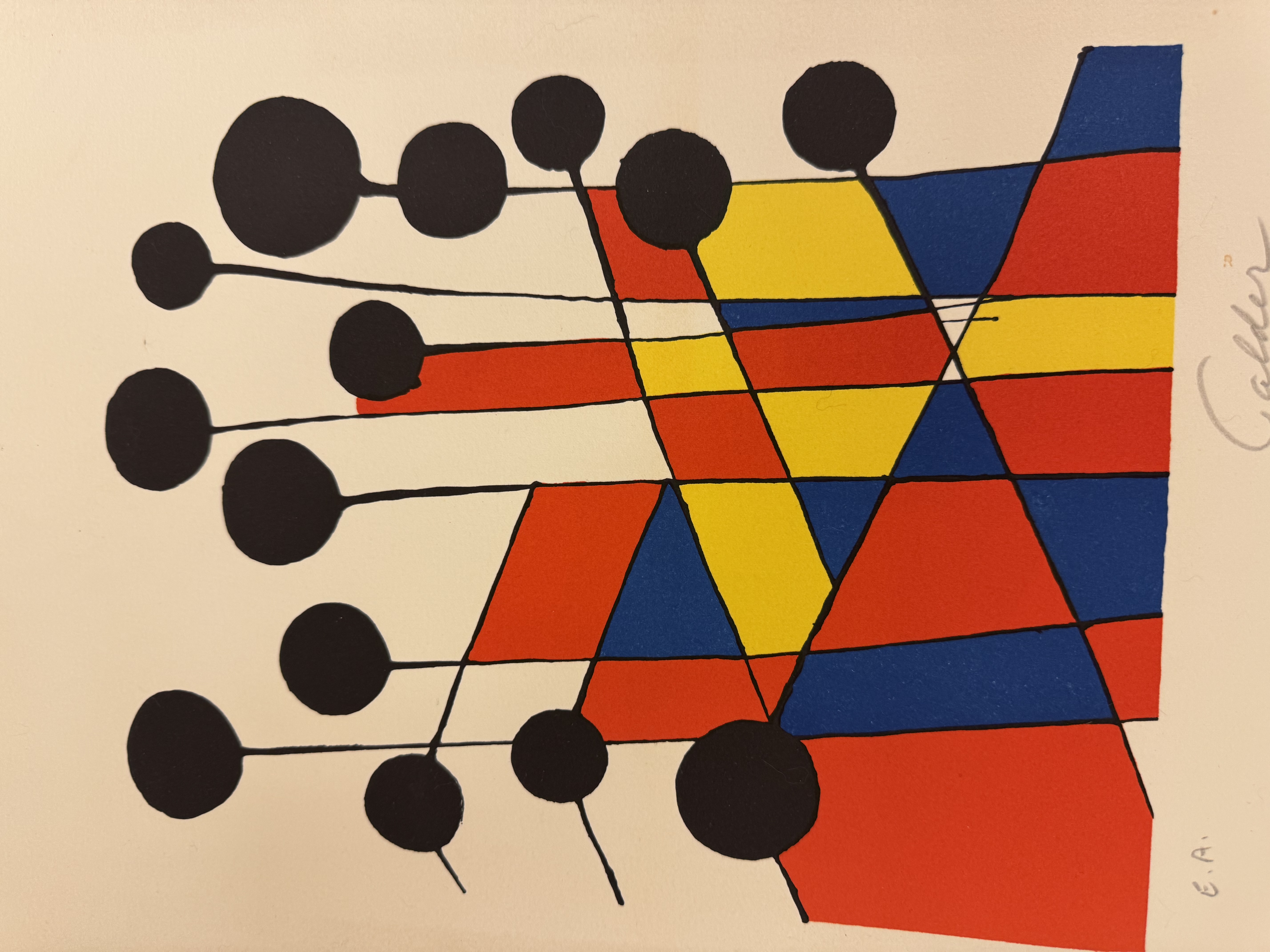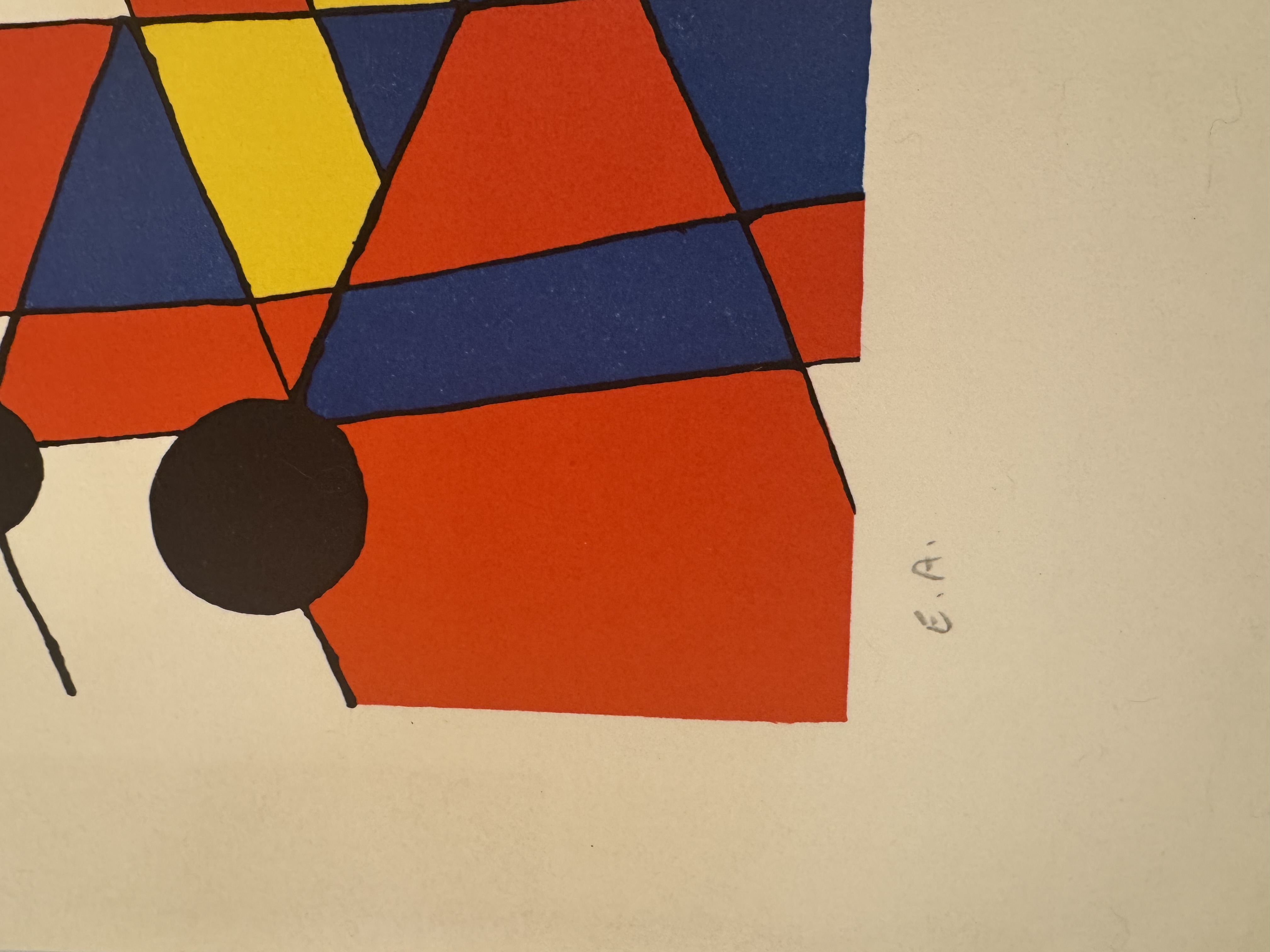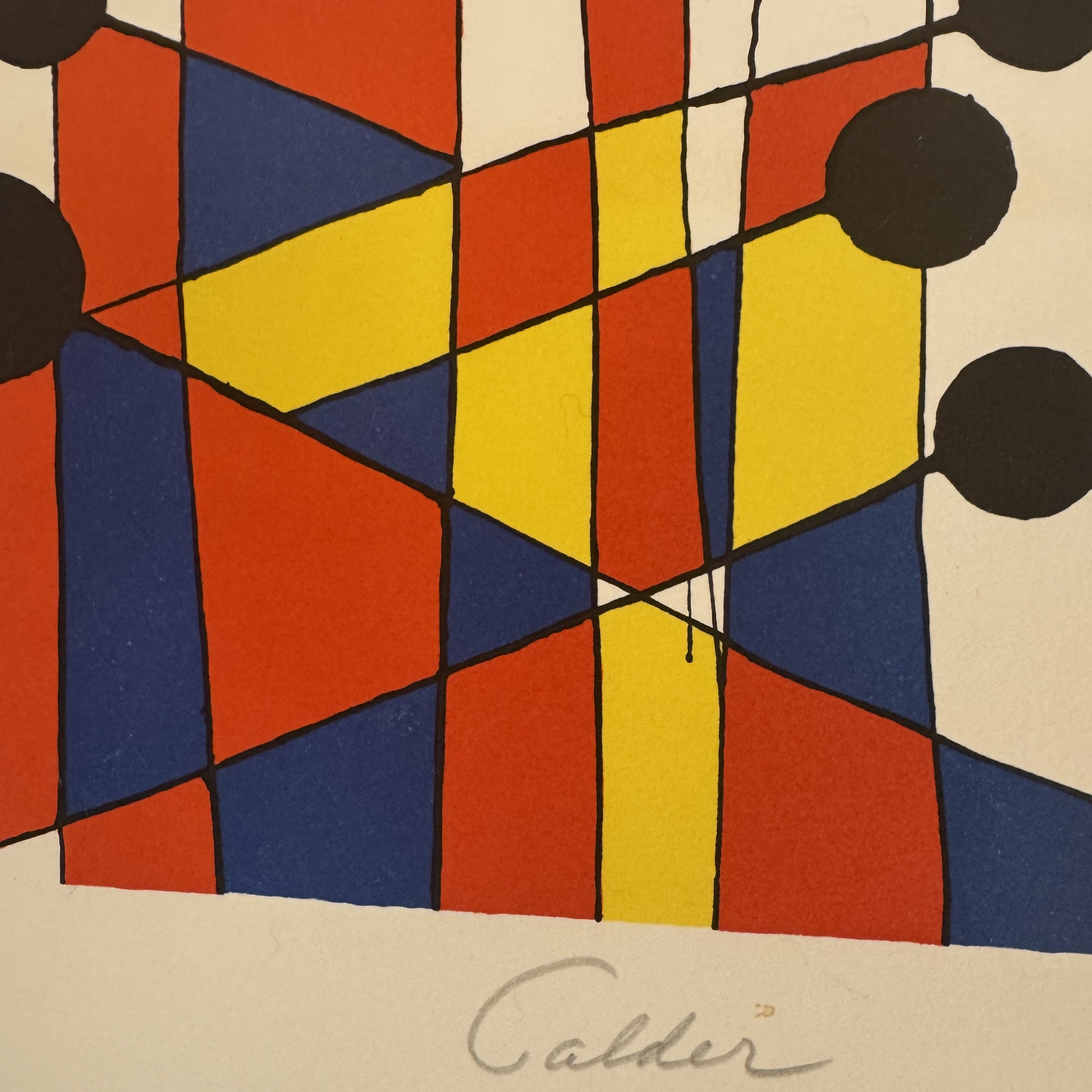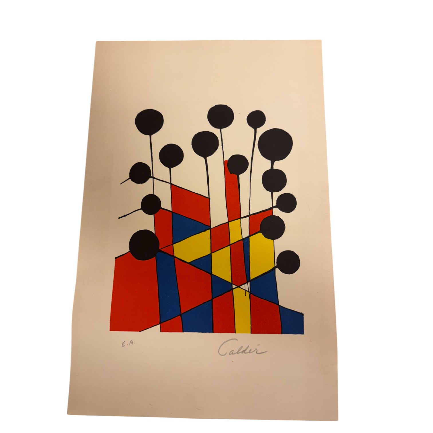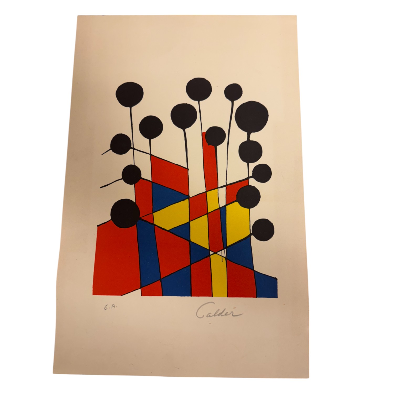 Alexander Calder Signed Artist Proof Lithograph “Balloons” circa 1971 unframed. The measurements of the print surface area are approximately 12.5″x9.25″ and with the mat border 20.75″x14″.