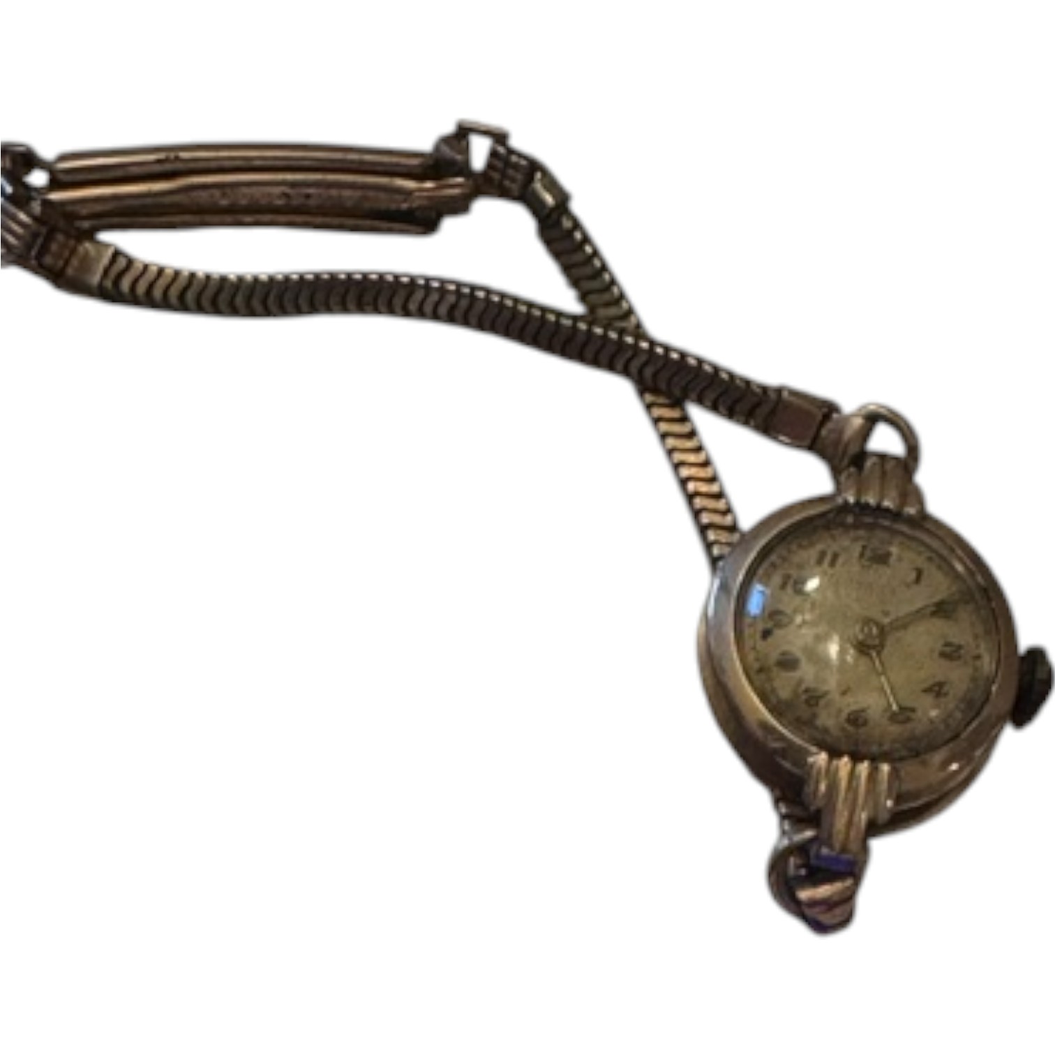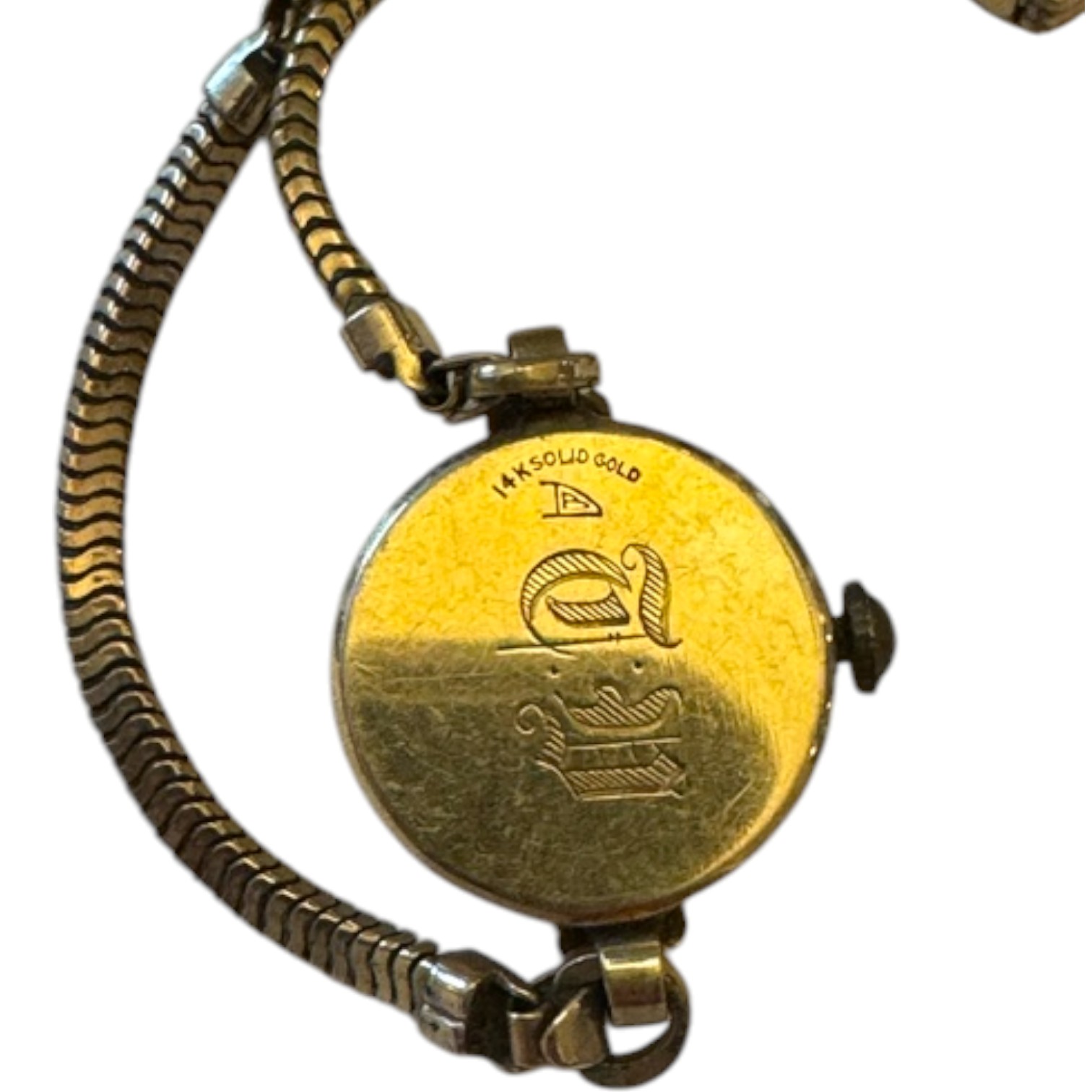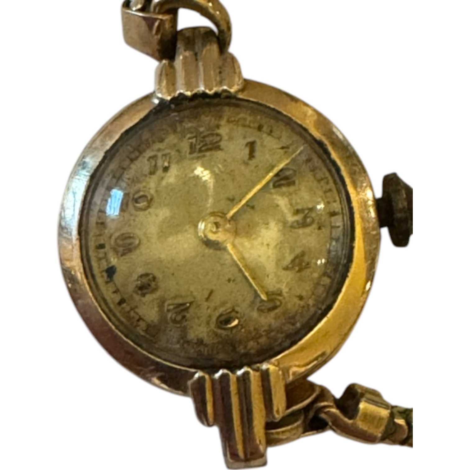 14k Gold Vintage Ladies Watch. Approximately Small watch 1 and 1/8” inches tall by 7/8” inches wide(not including the winder. Depth is a little over 1/8 inches. No writing on the face which is dirty, commensurate with watches this age. Writing on band illegible but confirming 14k throughout. Total weight including the movement is approximately 12 grams. Excluding movement, but bezel intact, 7.9 grams. Does wind – does not seem to be running.