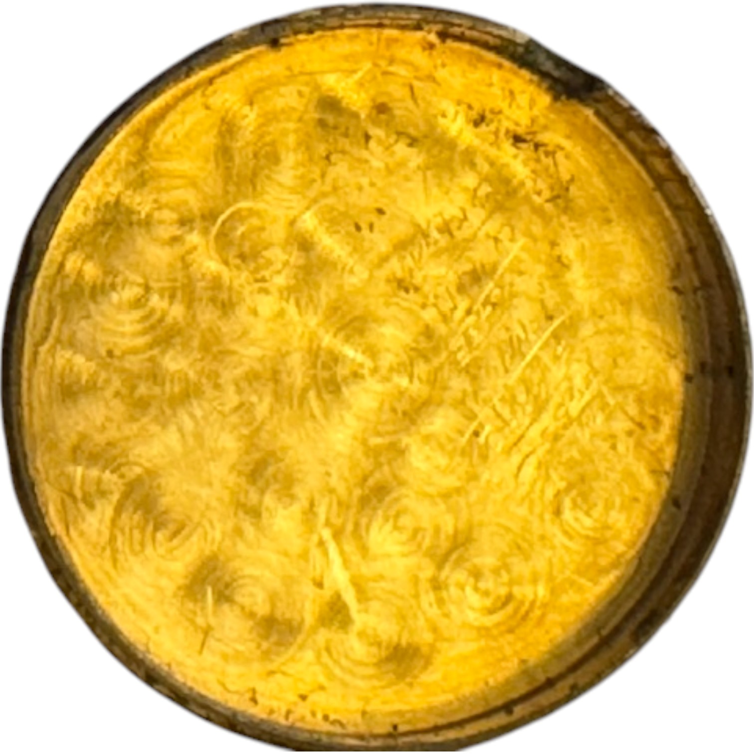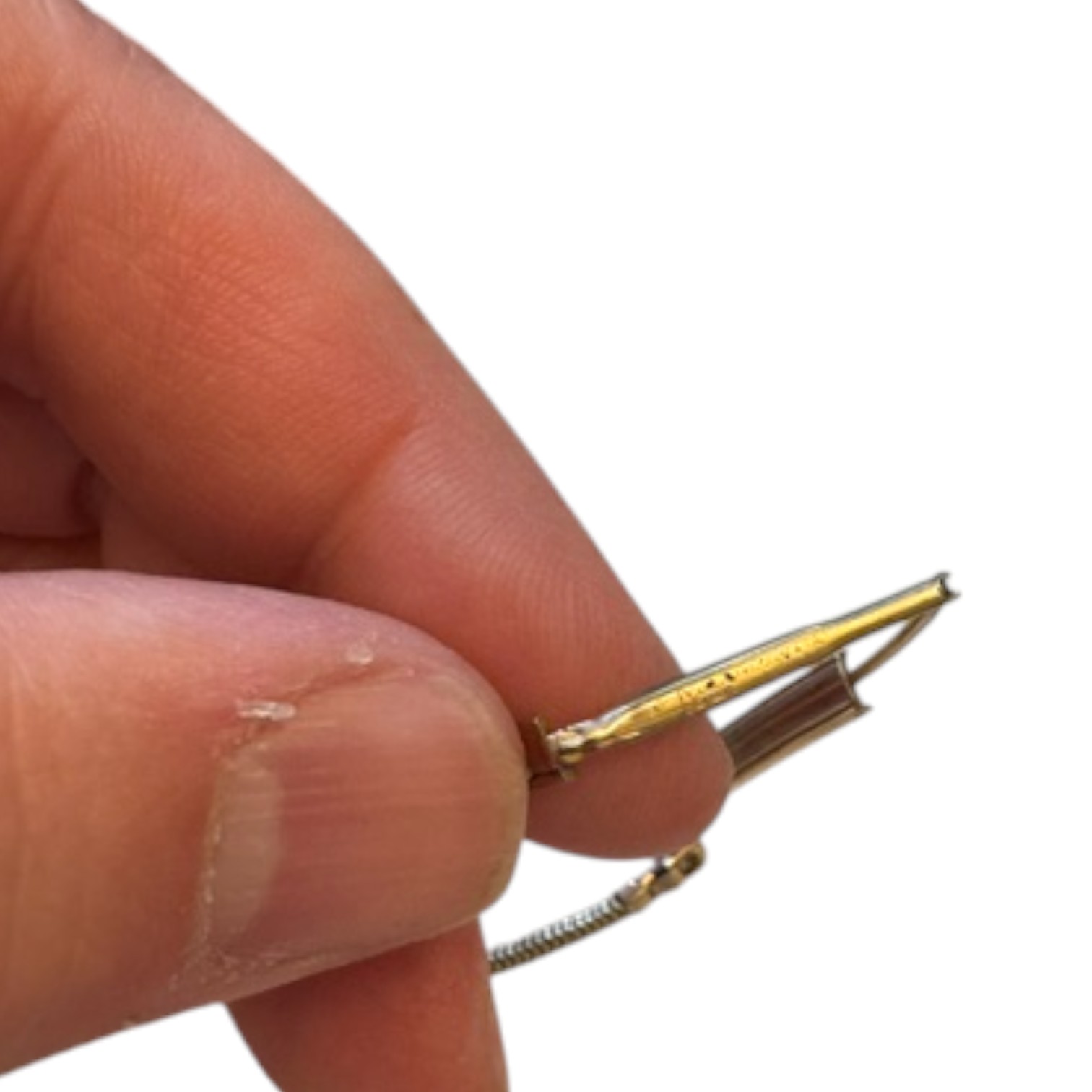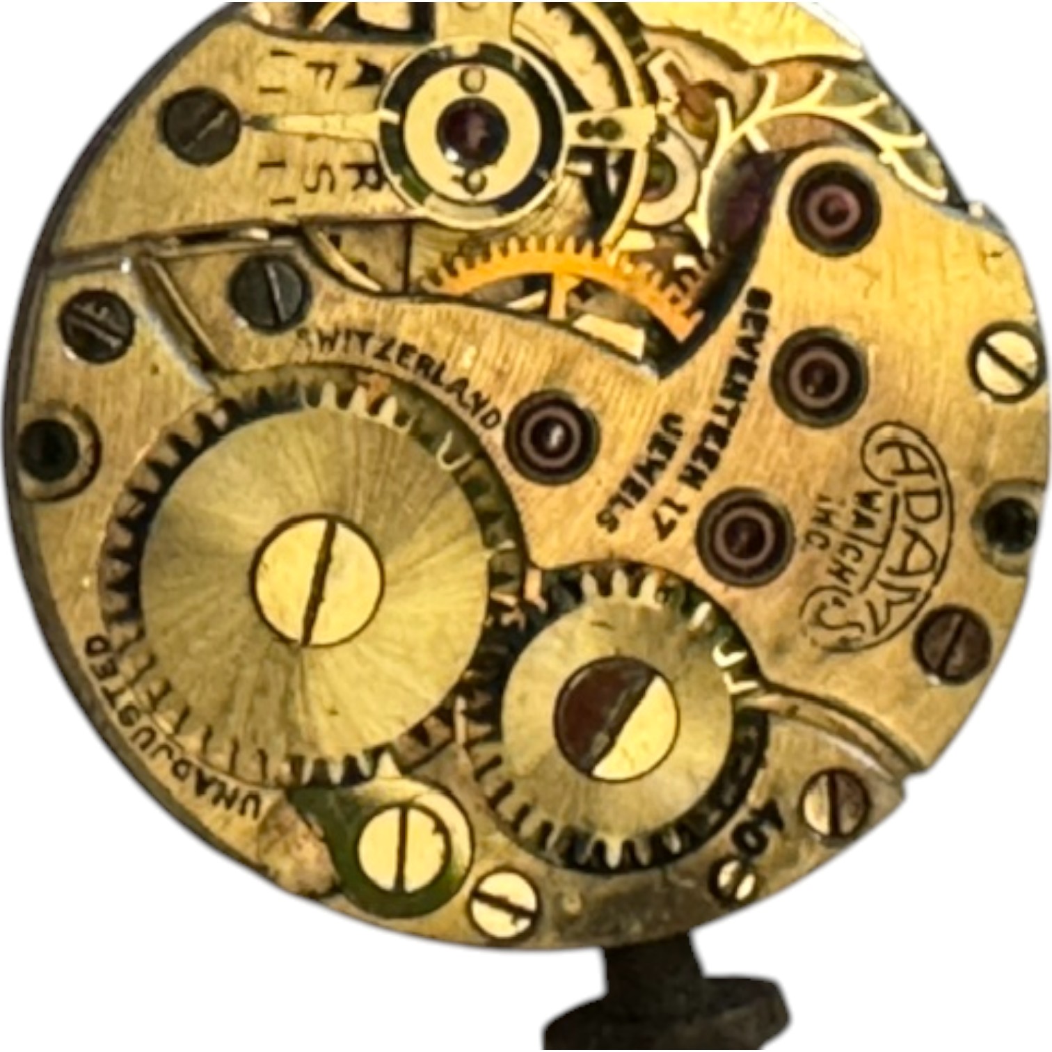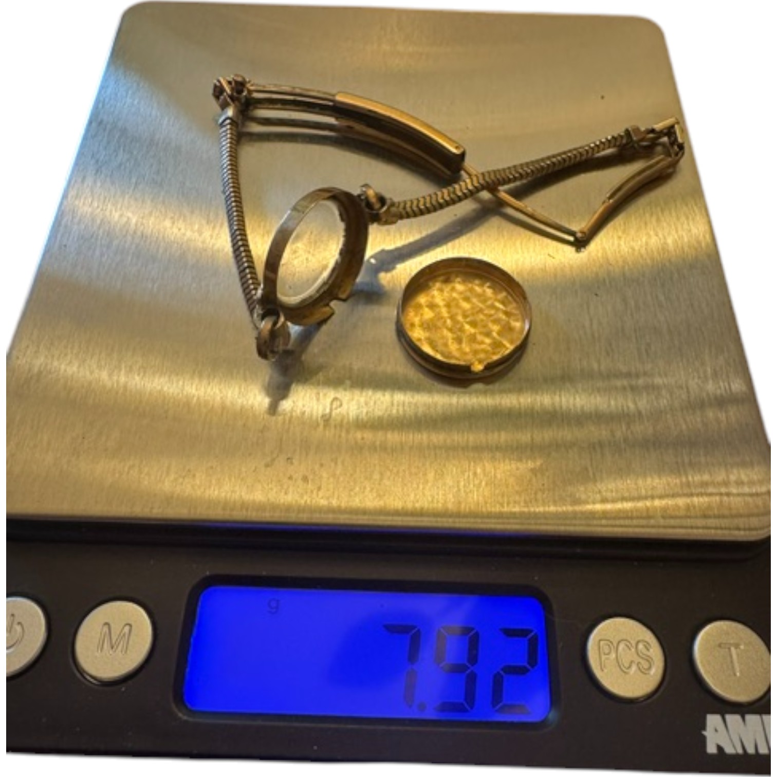 14k Gold Vintage Ladies Watch. Approximately Small watch 1 and 1/8” inches tall by 7/8” inches wide(not including the winder. Depth is a little over 1/8 inches. No writing on the face which is dirty, commensurate with watches this age. Writing on band illegible but confirming 14k throughout. Total weight including the movement is approximately 12 grams. Excluding movement, but bezel intact, 7.9 grams. Does wind – does not seem to be running.