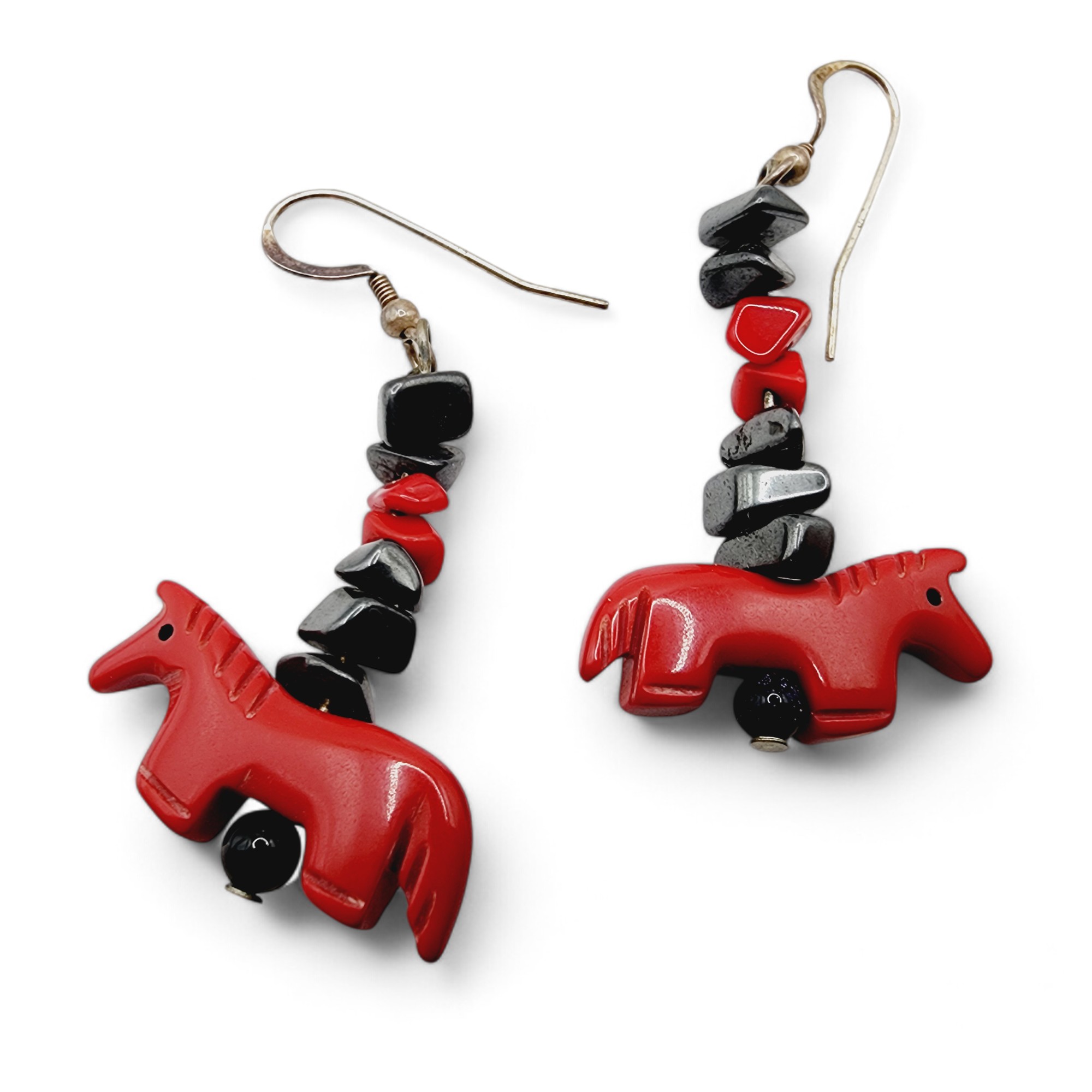 Sterling Coral Hematite Horse Fetish Earrings 7.5g
