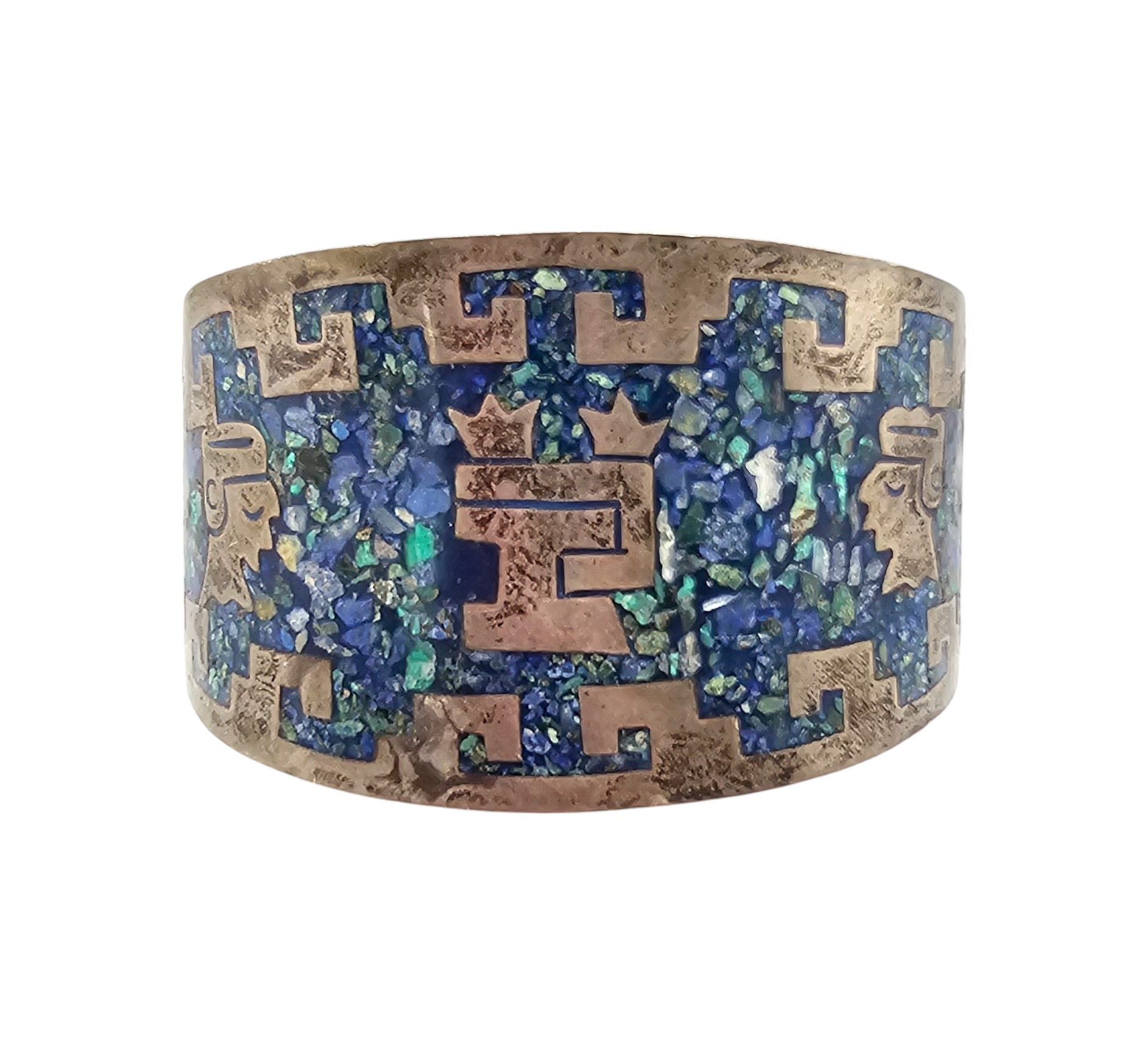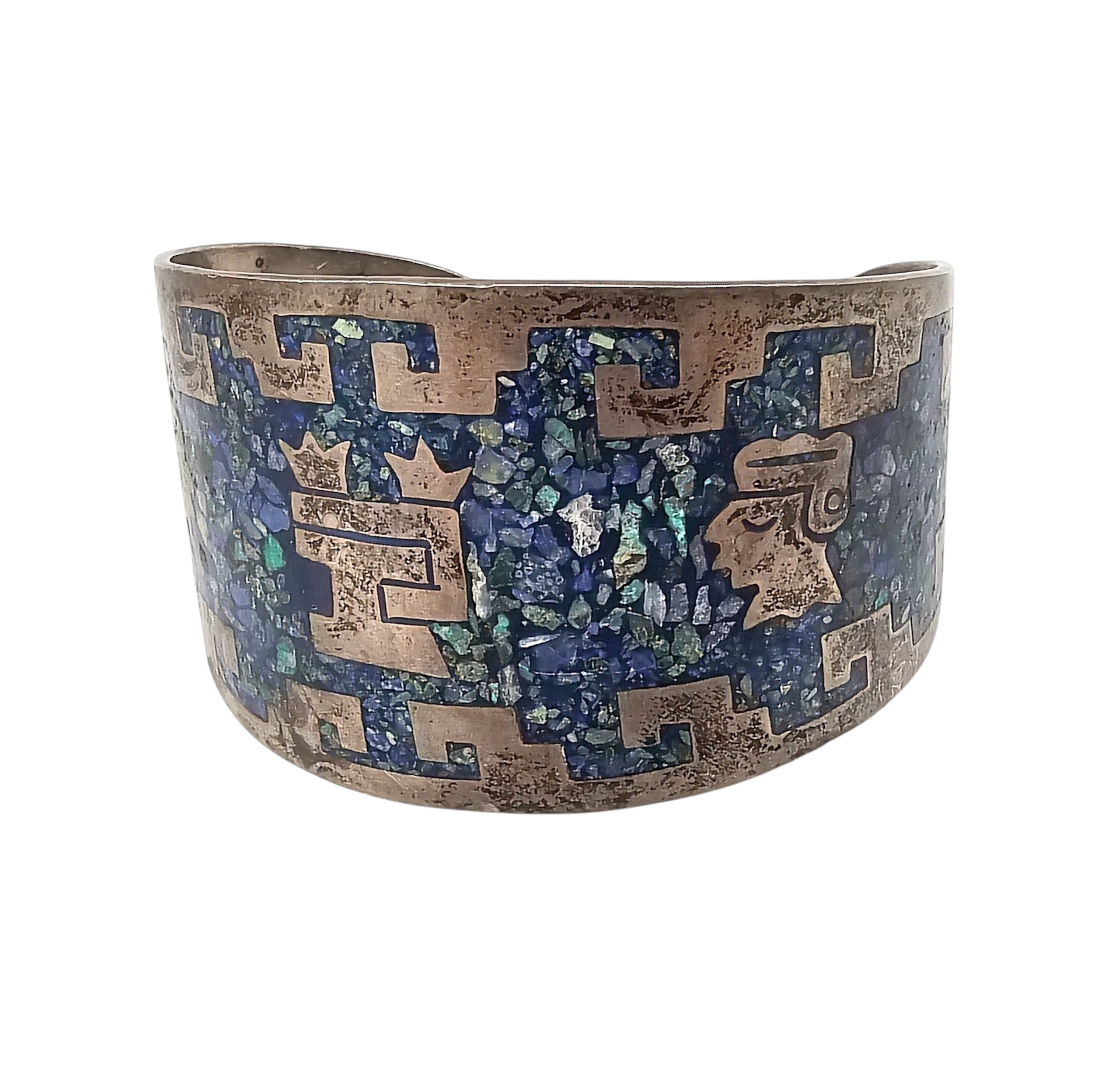 Signed HMP Mexico Sterling Crushed Turquoise Lapis Aztec/Mayan Style Cuff Bracelet 43.4 G