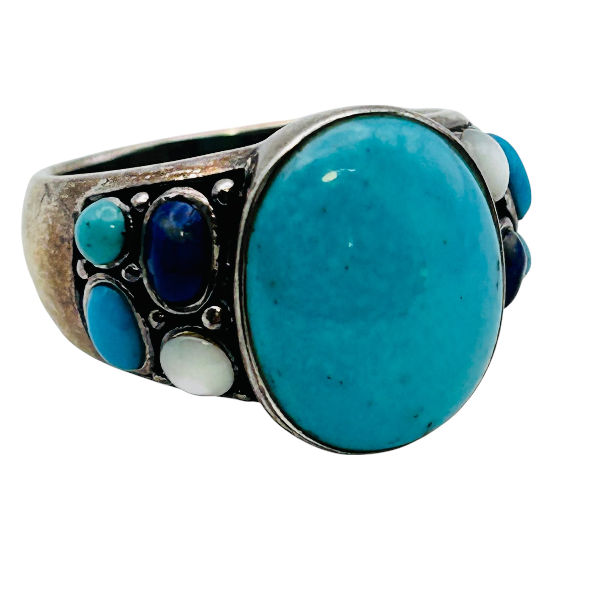 Turquoise mother of pearl lapis lazuli sterling statement ring size 9 8.54 g