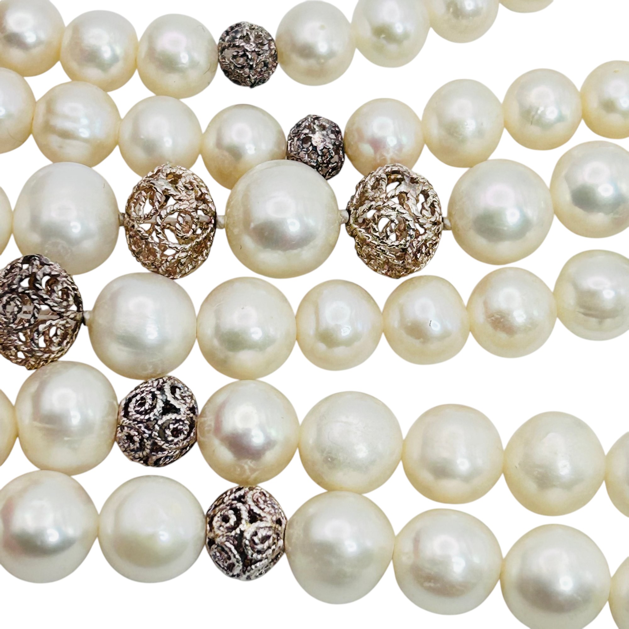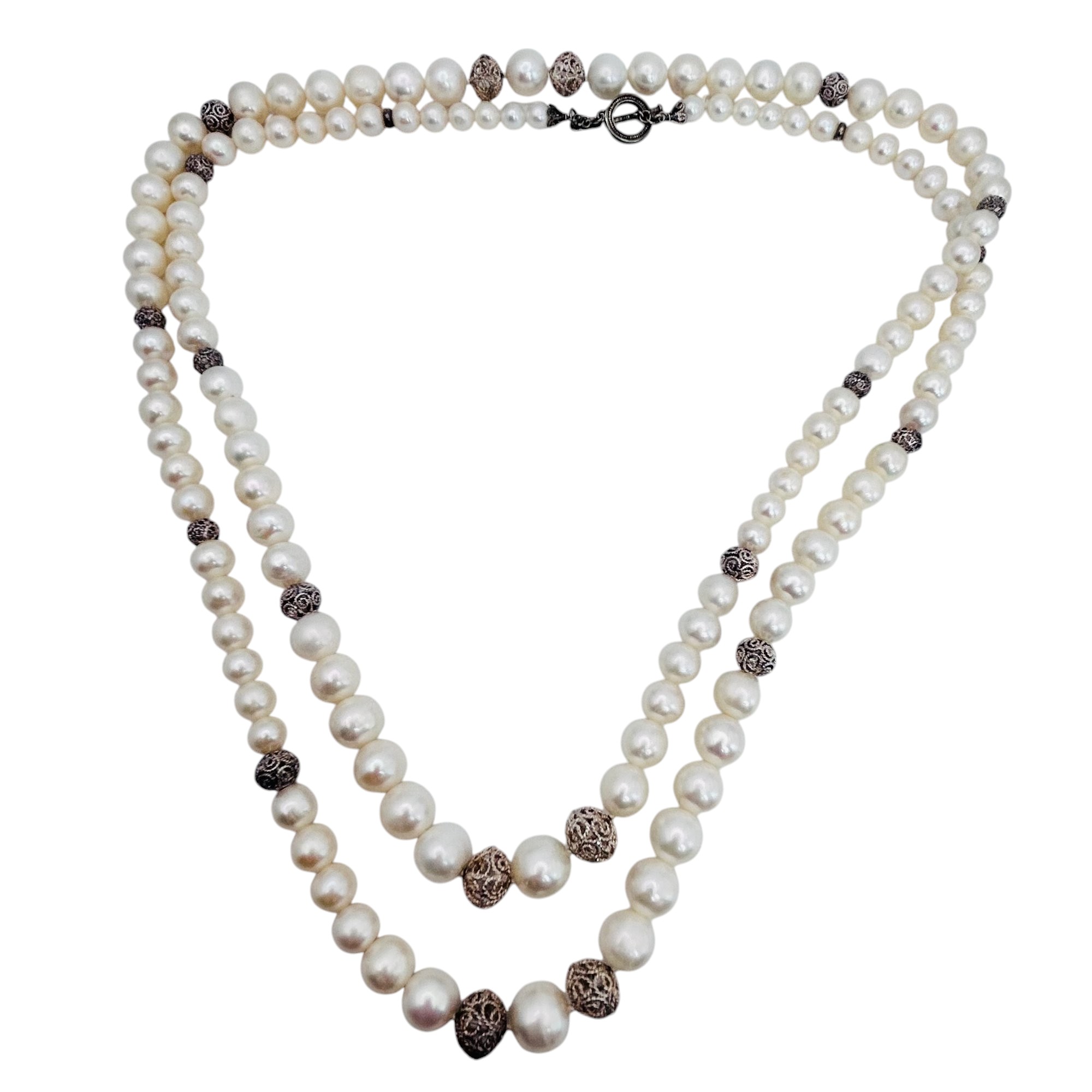 BJ Sterling Long pearl and Sterling filigree bead necklace 108 g