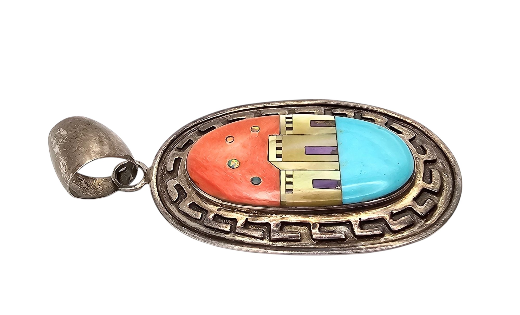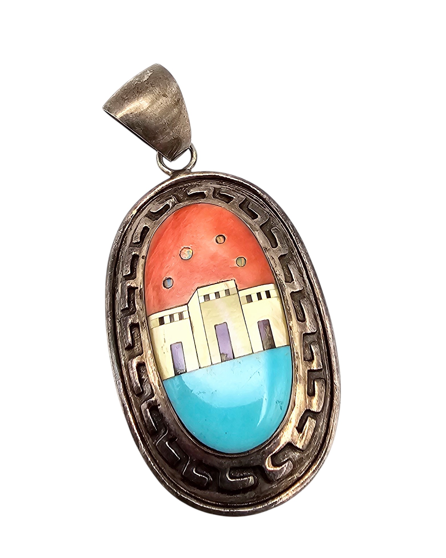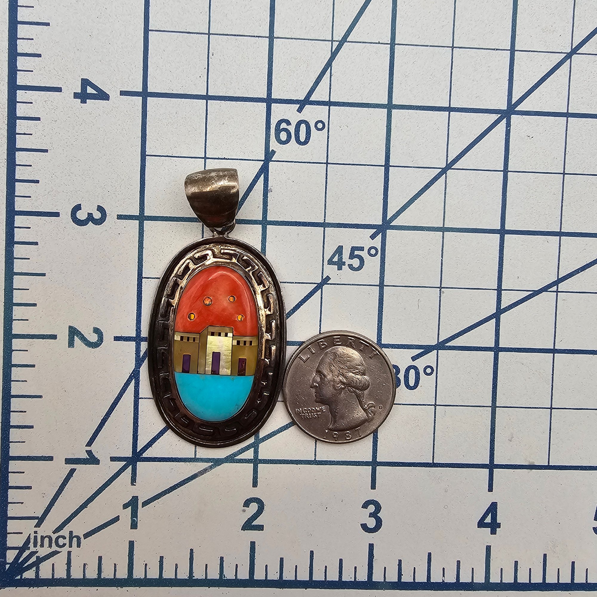 Southwestern Style Turquoise Mother Of Pearl Abalone Sterling Silver Inlay Adobe Scene Pendant 10.7 G Philippines