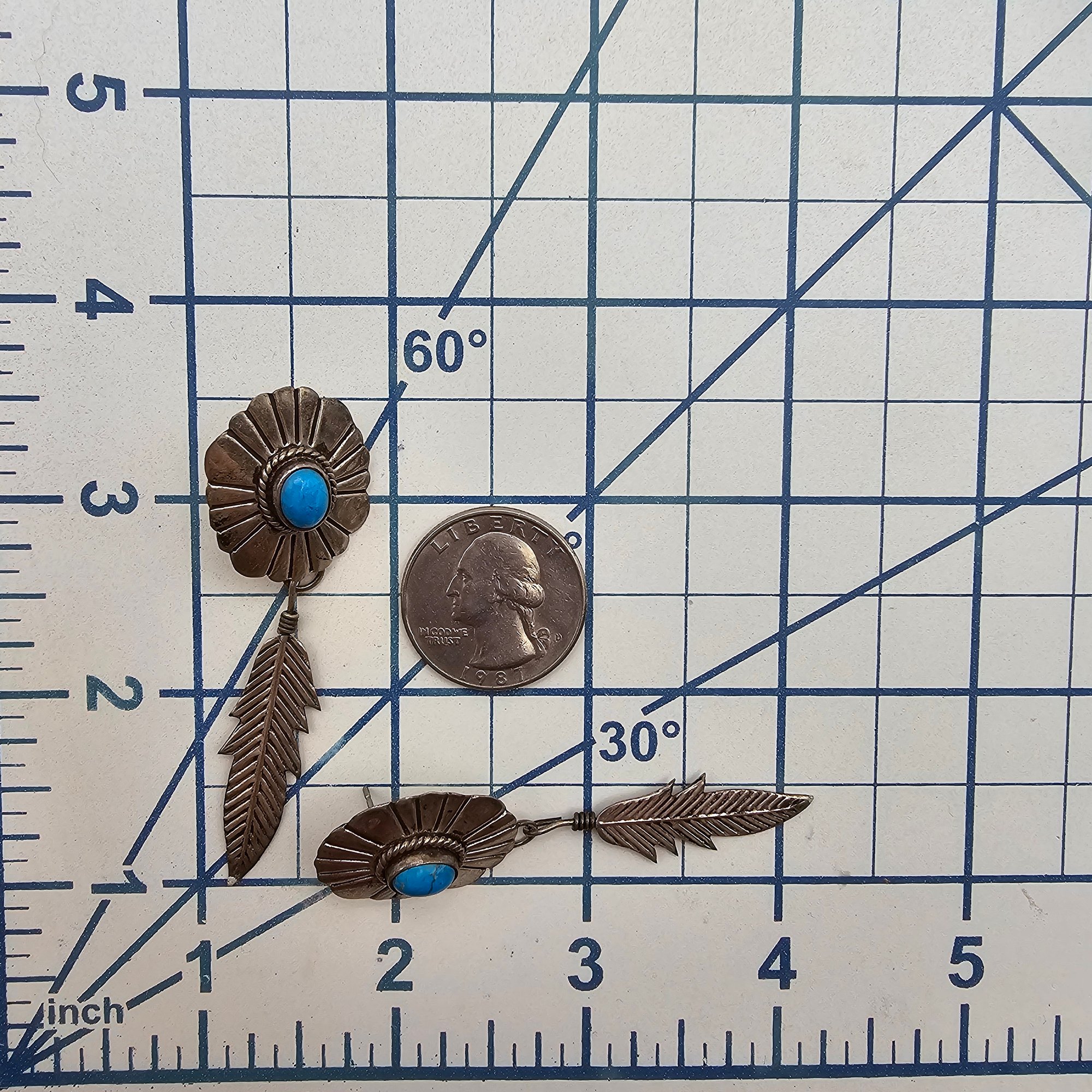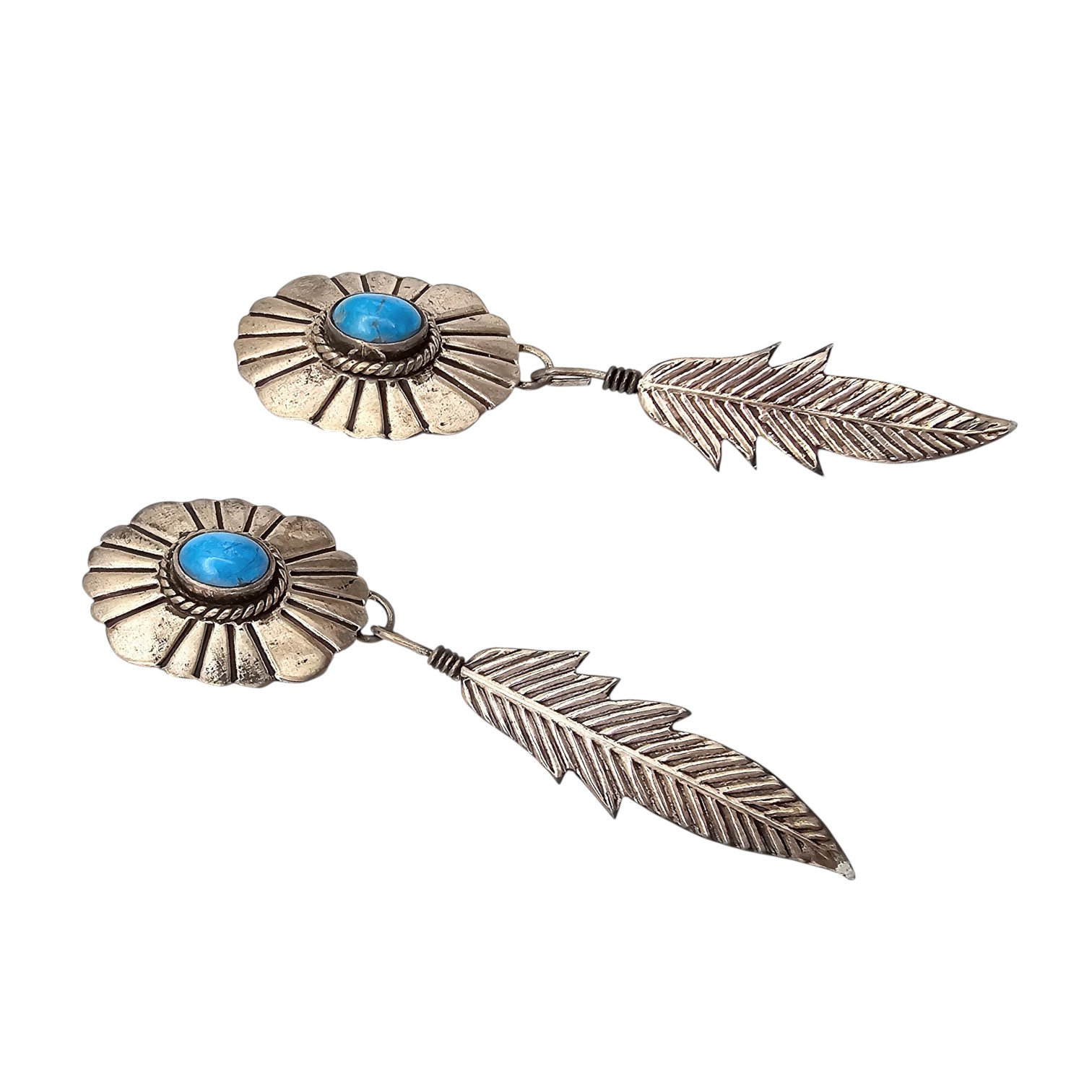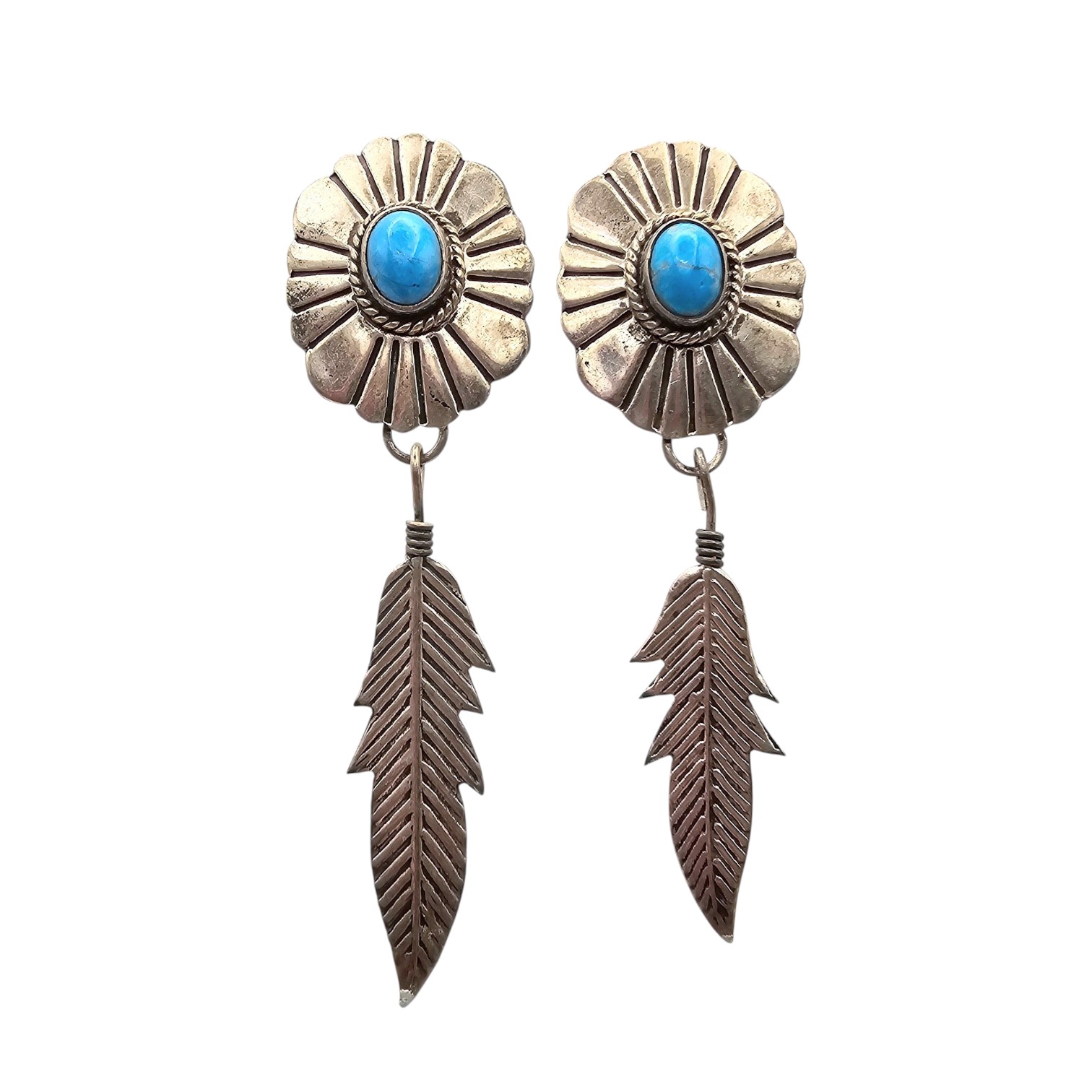 Navajo Turquoise Sterling Silver Feather Dangle Earrings 7.6 G