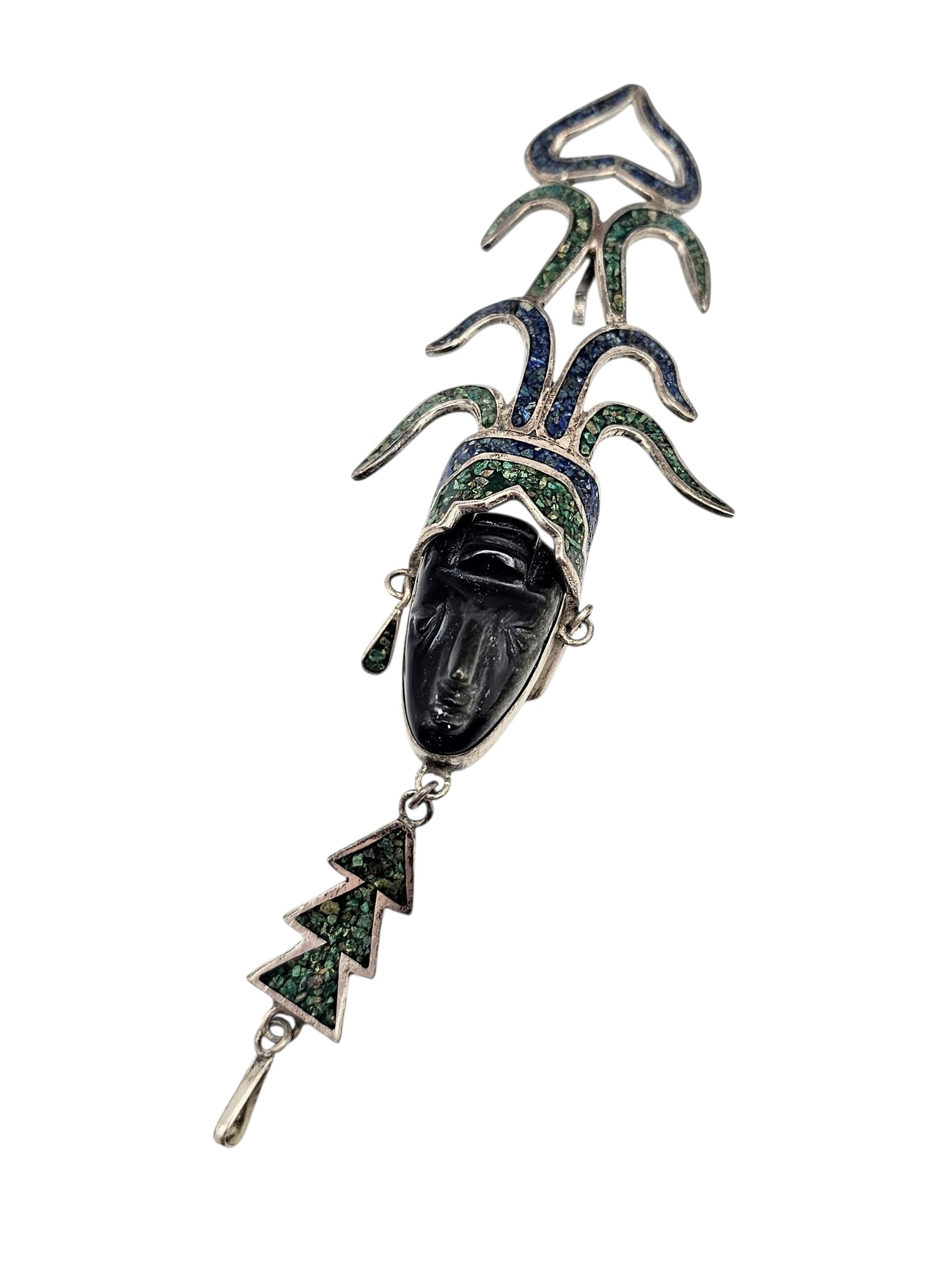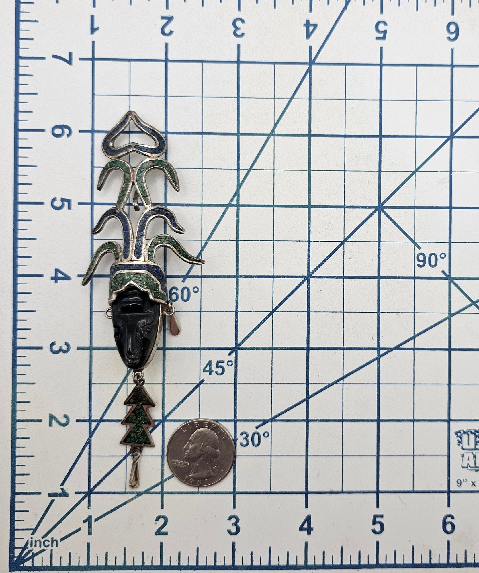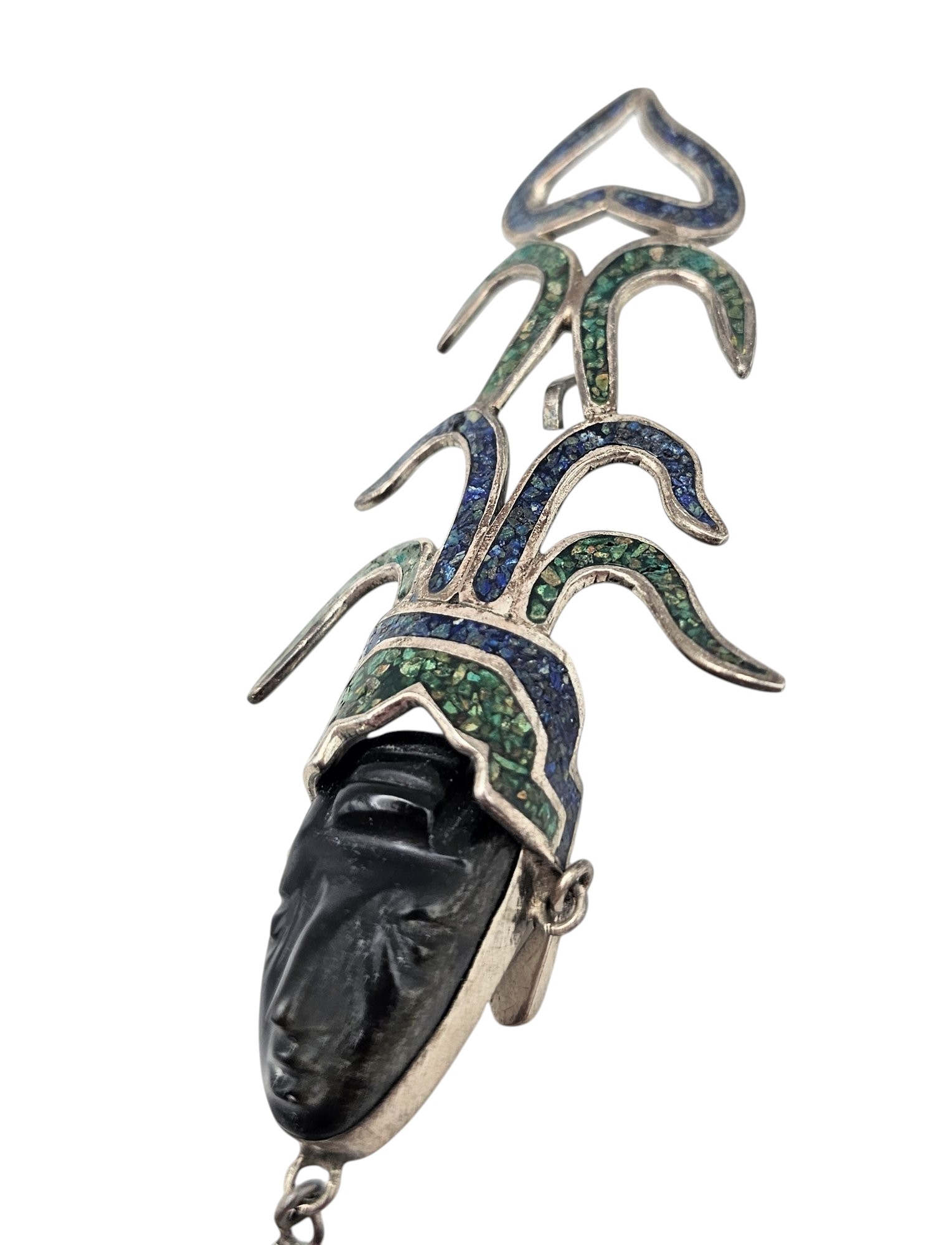 Mexico TS-75 Crushed Lapis Malachite Sterling Silver Onyx Sterling Silver Carved Face Chieftain Brooch 23.6 G as is missing stone in the very bottom droplet