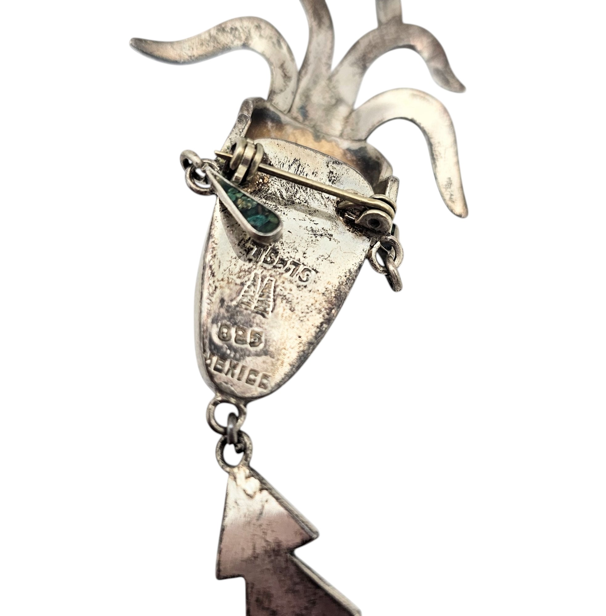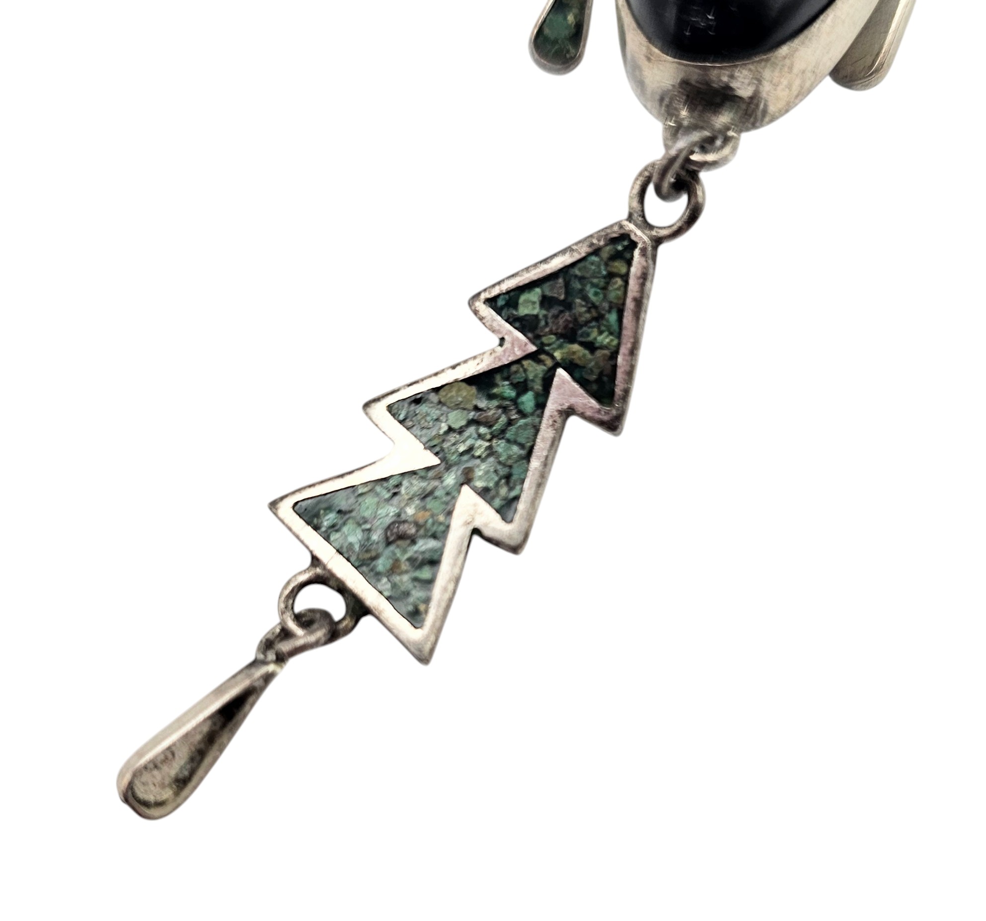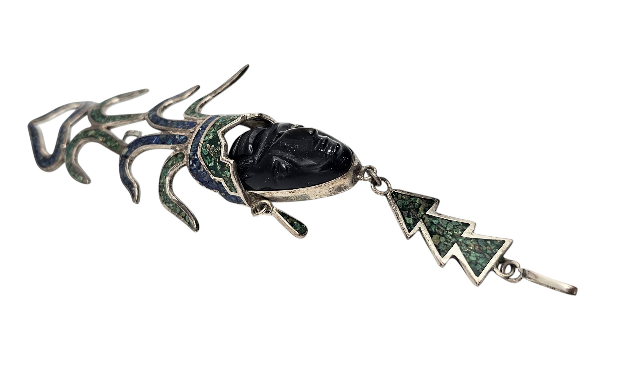 Mexico TS-75 Crushed Lapis Malachite Sterling Silver Onyx Sterling Silver Carved Face Chieftain Brooch 23.6 G as is missing stone in the very bottom droplet