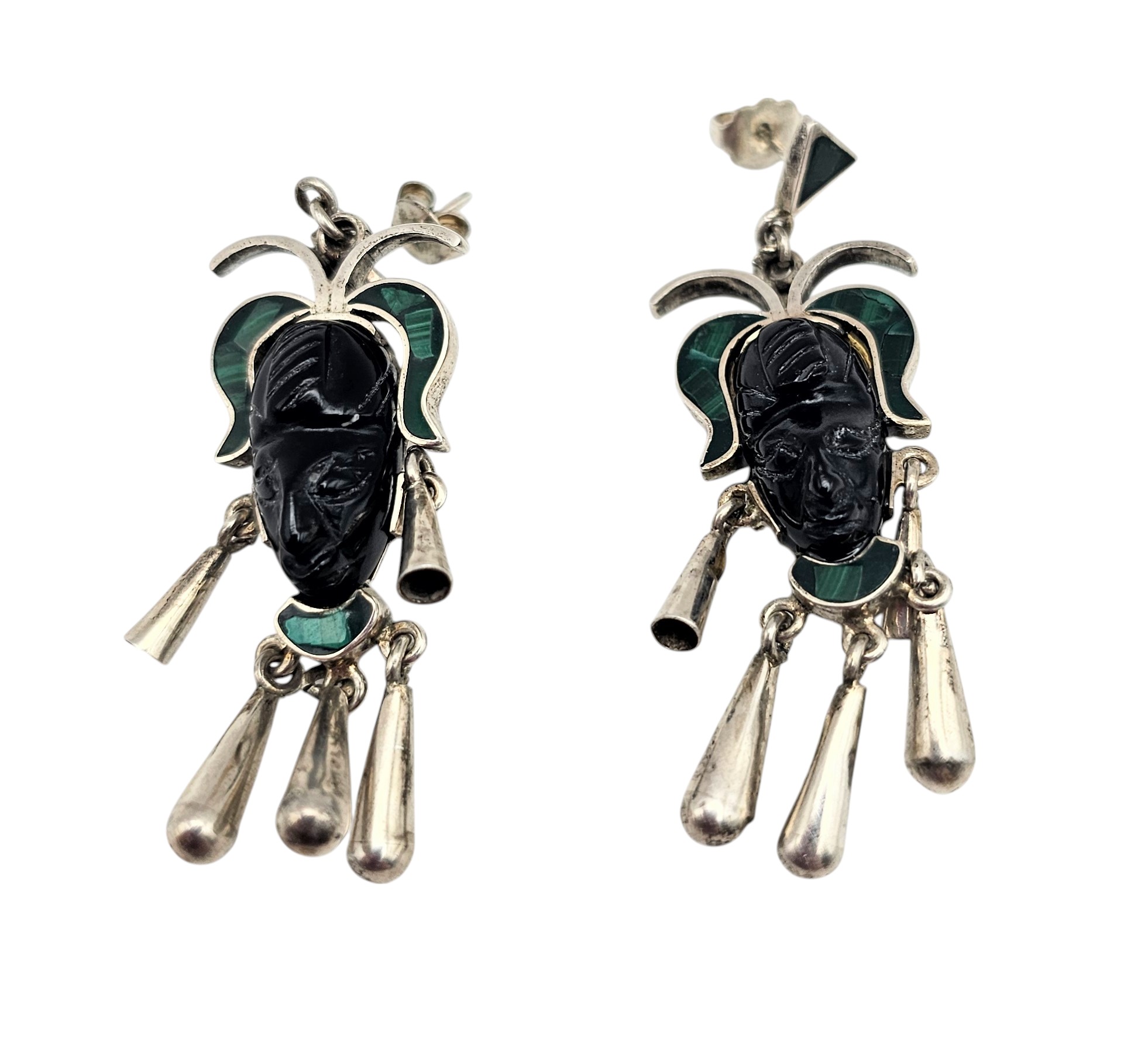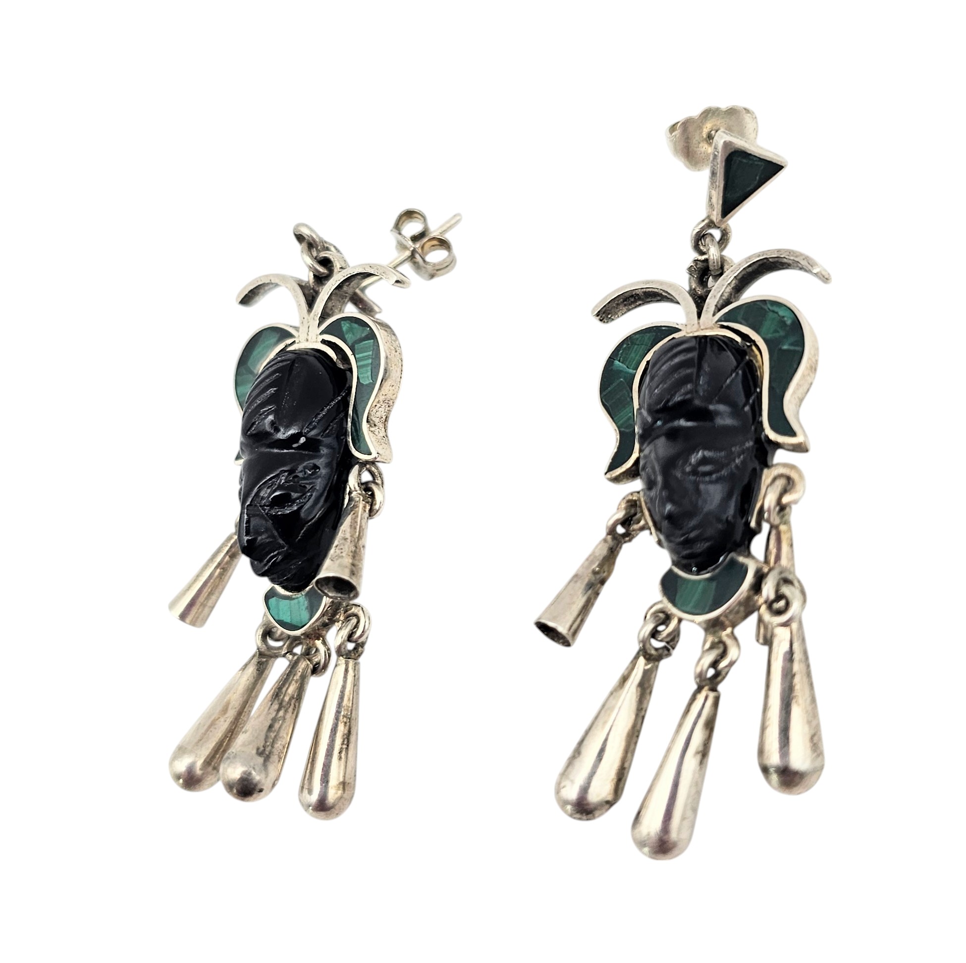 TM-65 Mexico Crushed Malachite Onyx Sterling Silver Carved Face Dangle Earrings 11.6 G