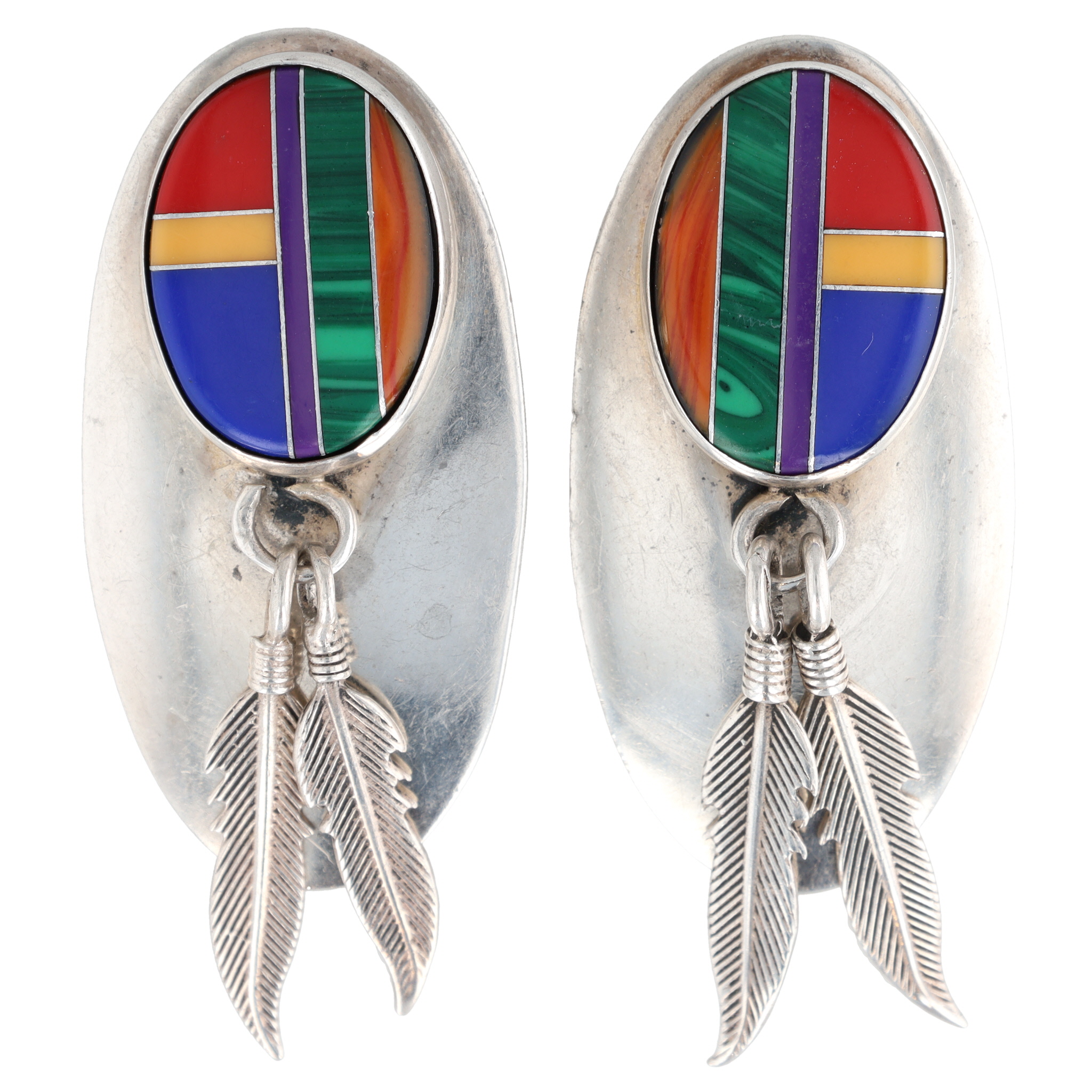 Vintage Navajo Sterling Multi Stone Inlay Dangle Earrings 13g
