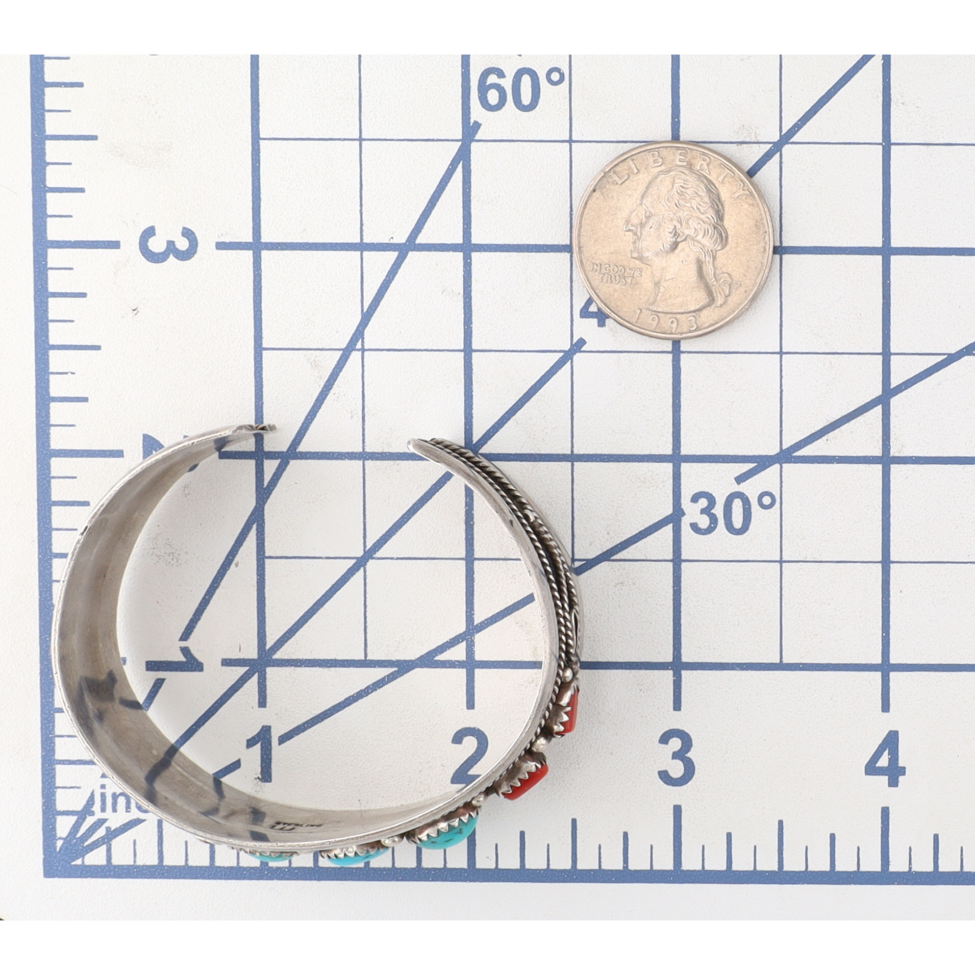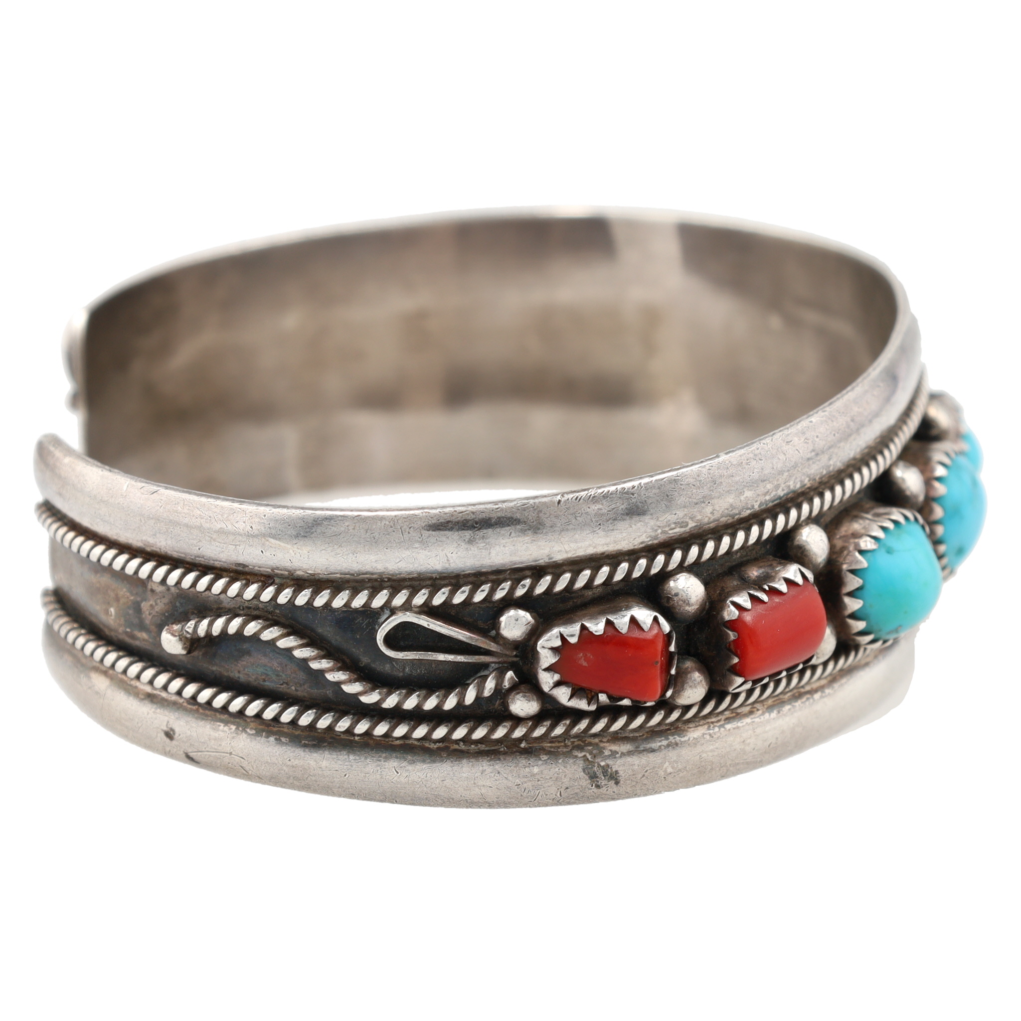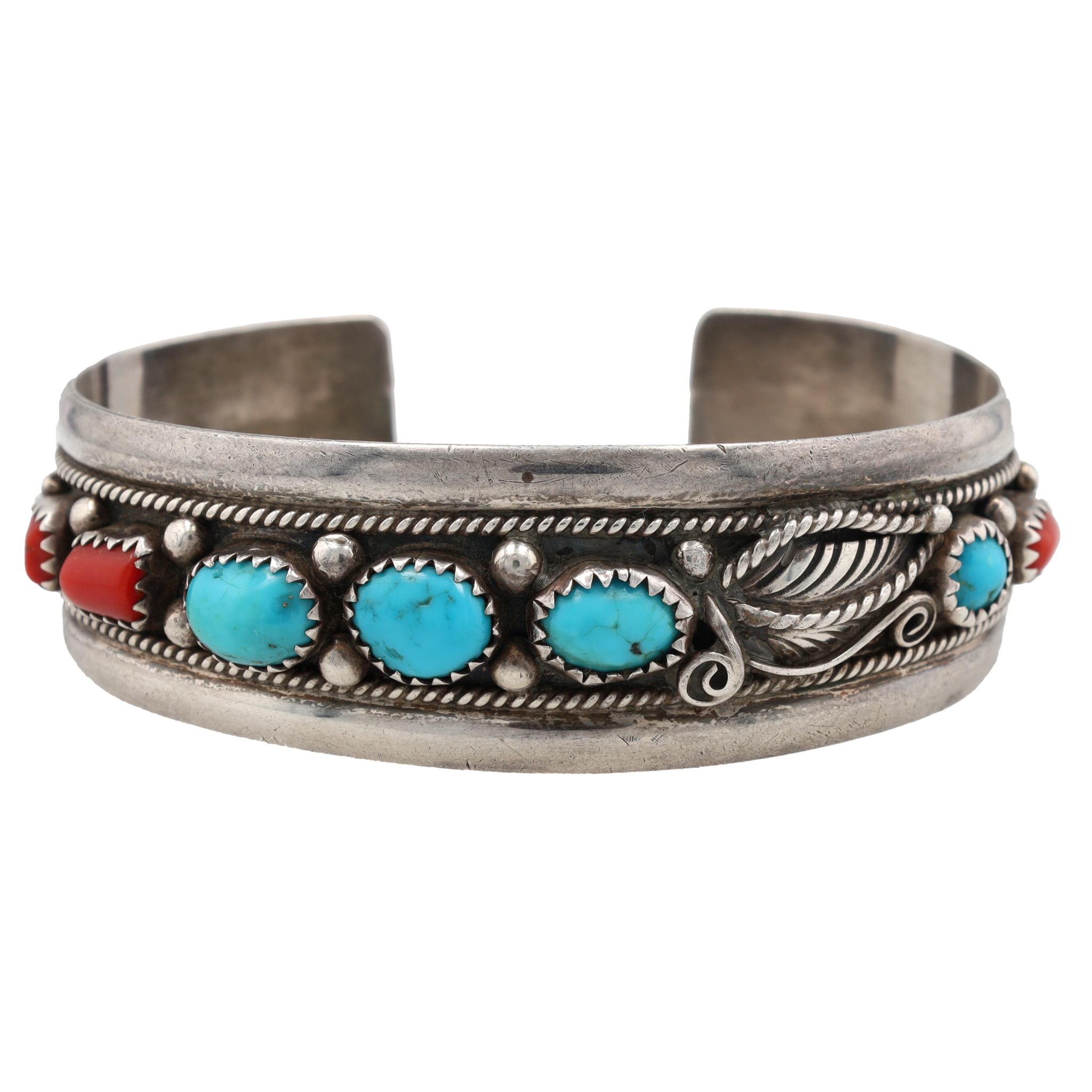 Signed W Navajo Sterling Turquoise Coral Cuff Bracelet 26g