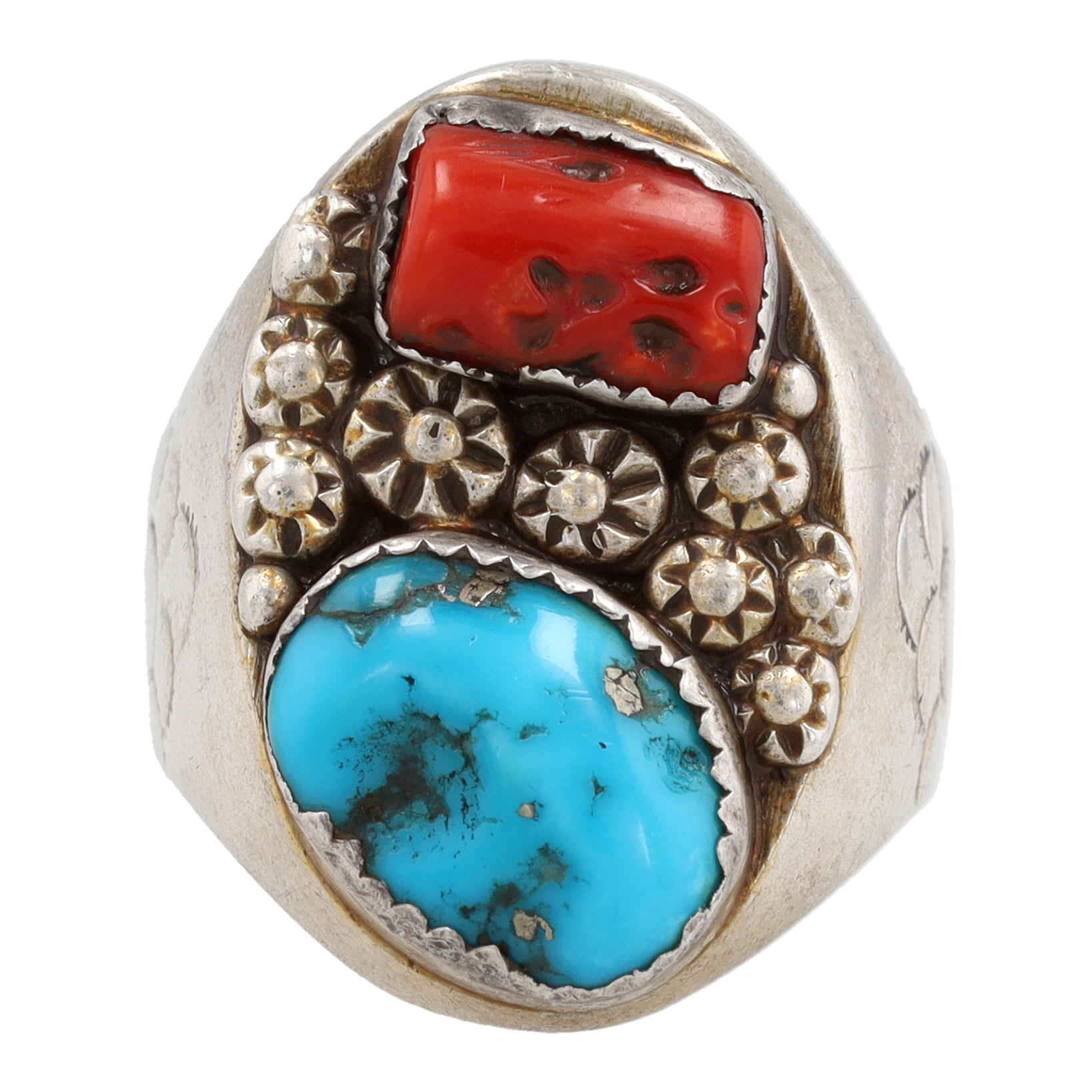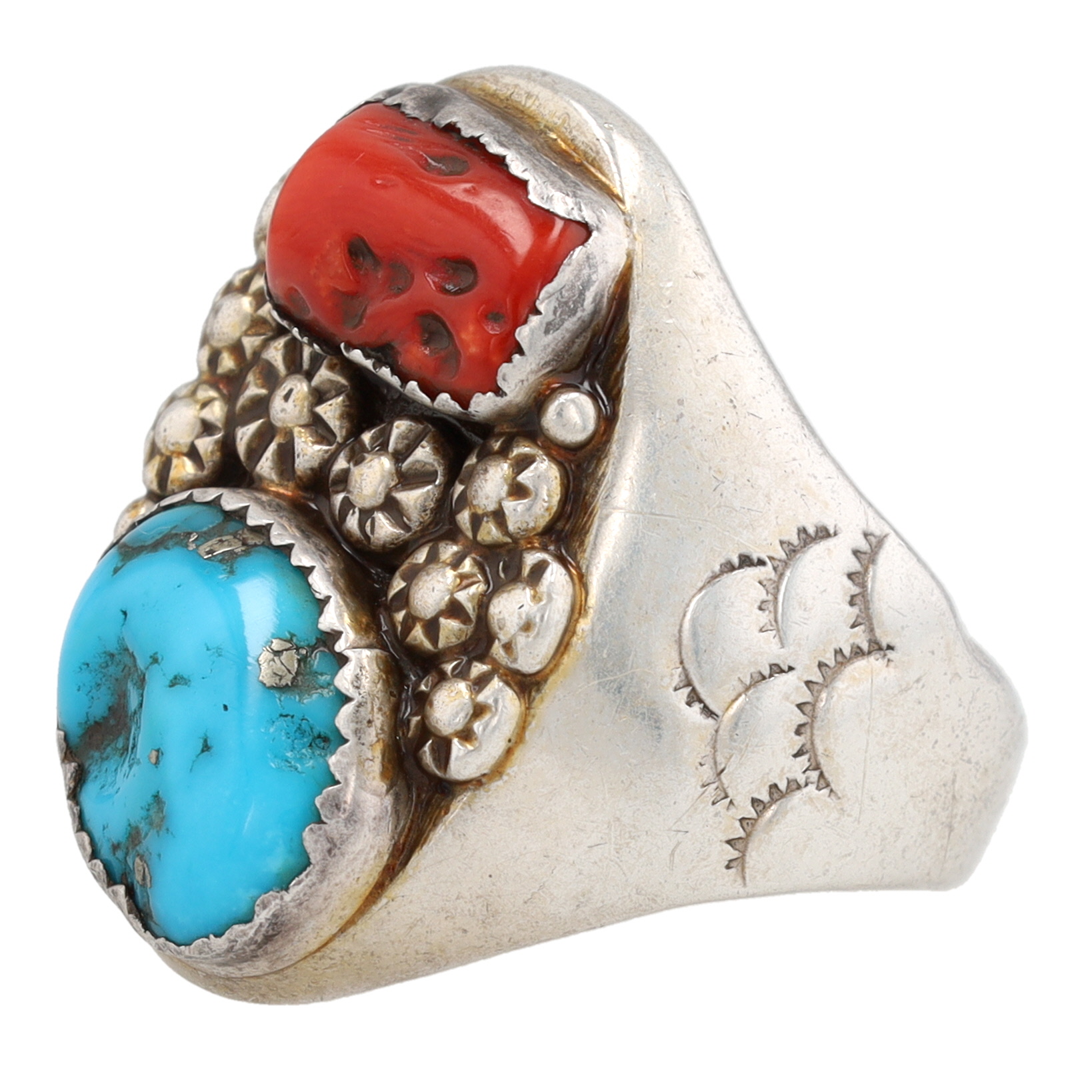Vintage Navajo Sterling Coral Turquoise Ring Sz. 11, 20.5g