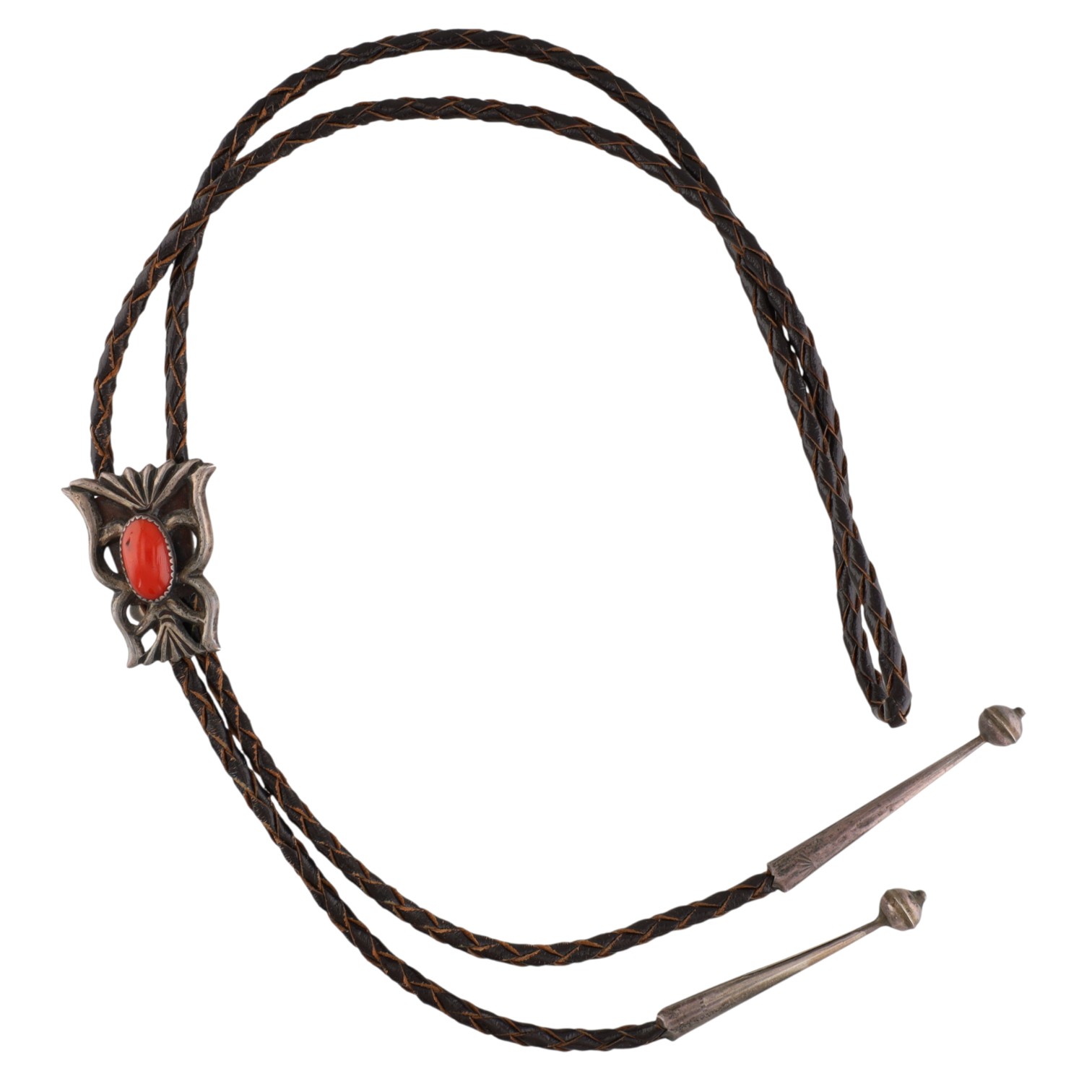Signed JT Navajo Sterling Coral Bolo Tie 26g