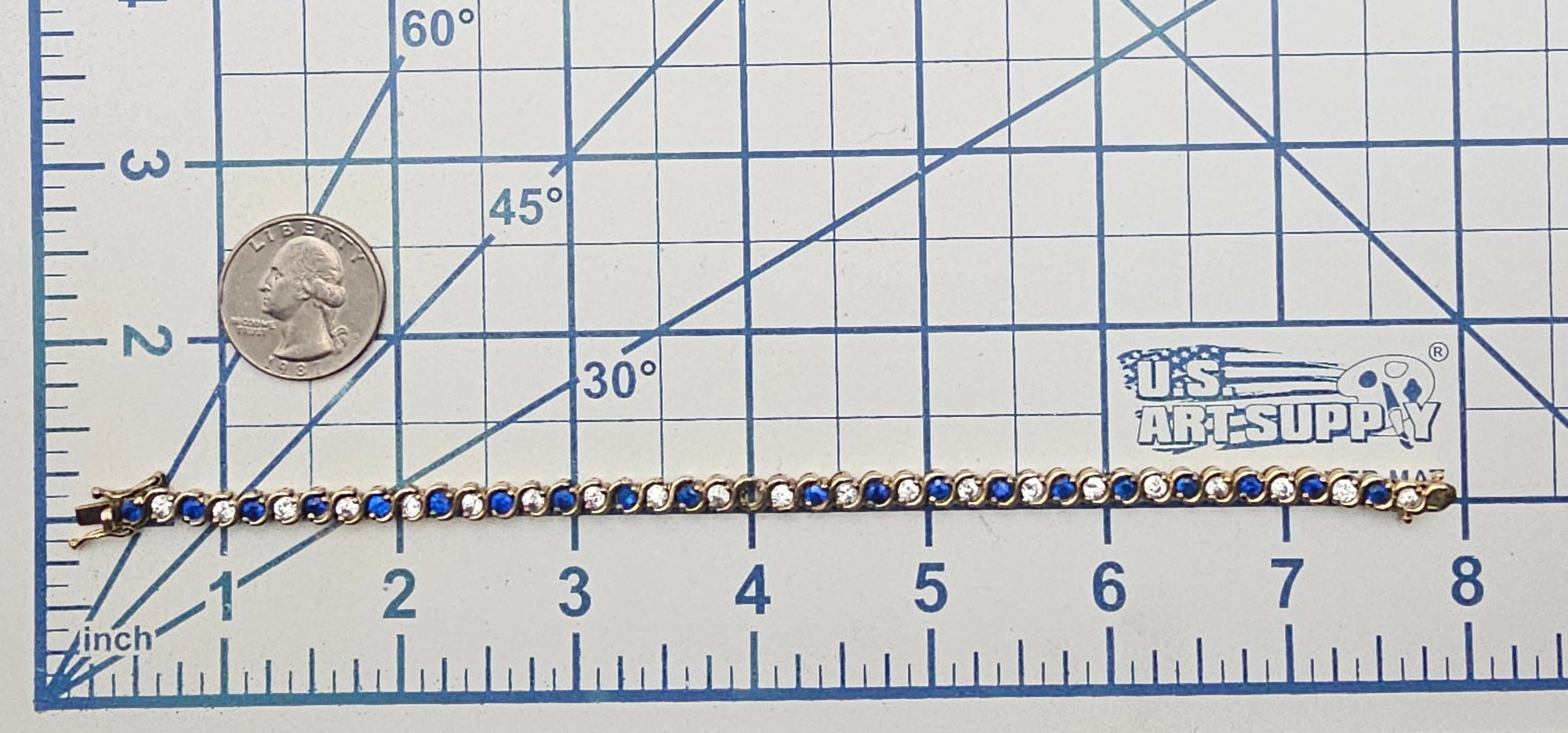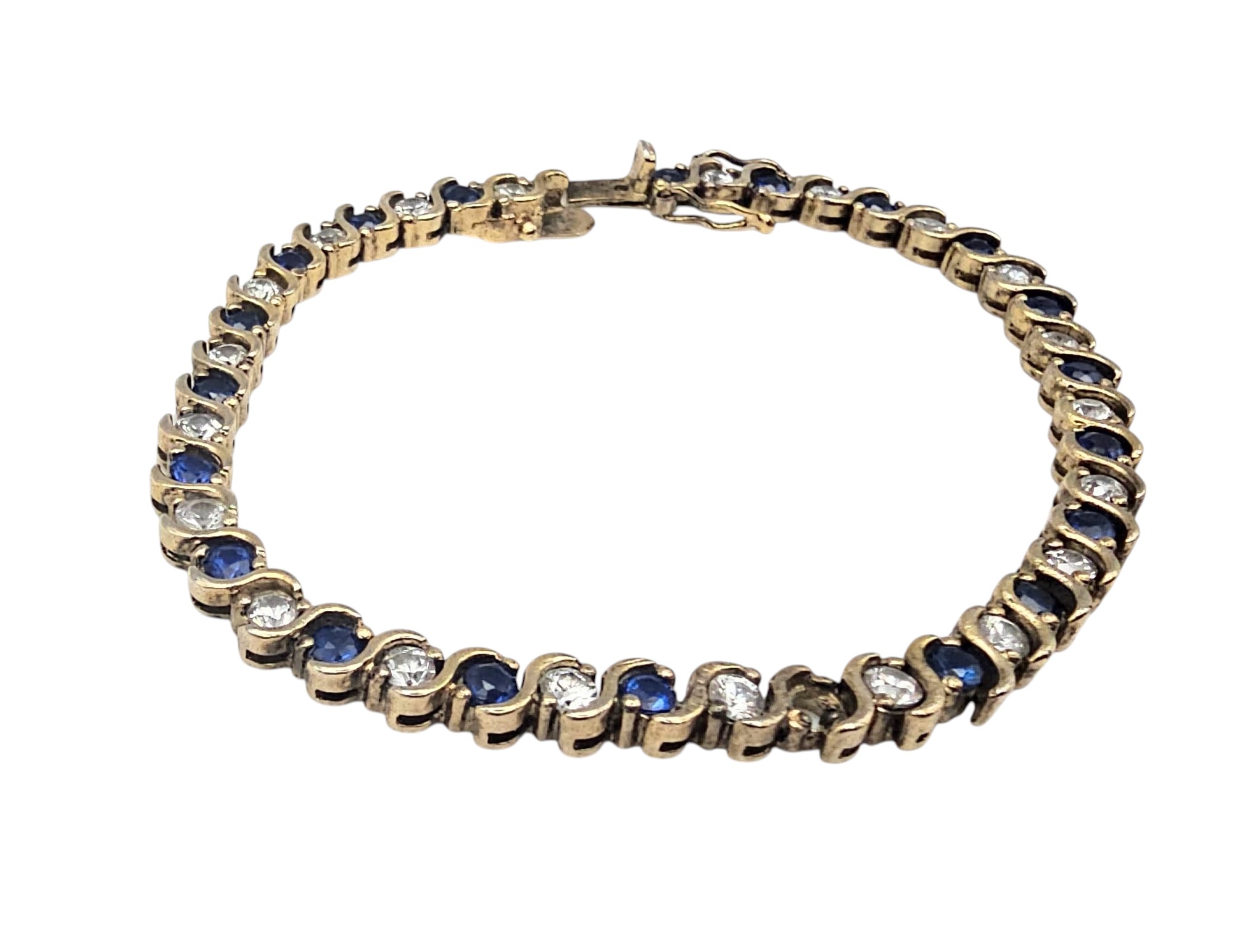 Blue White Rhinestone Gold Over Sterling Silver Tennis bracelet 15.2 G as is missing stone