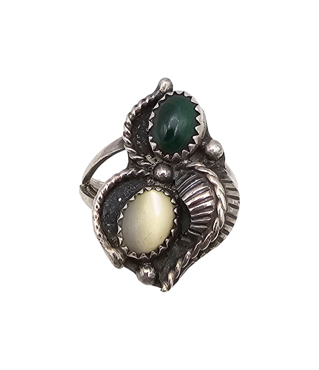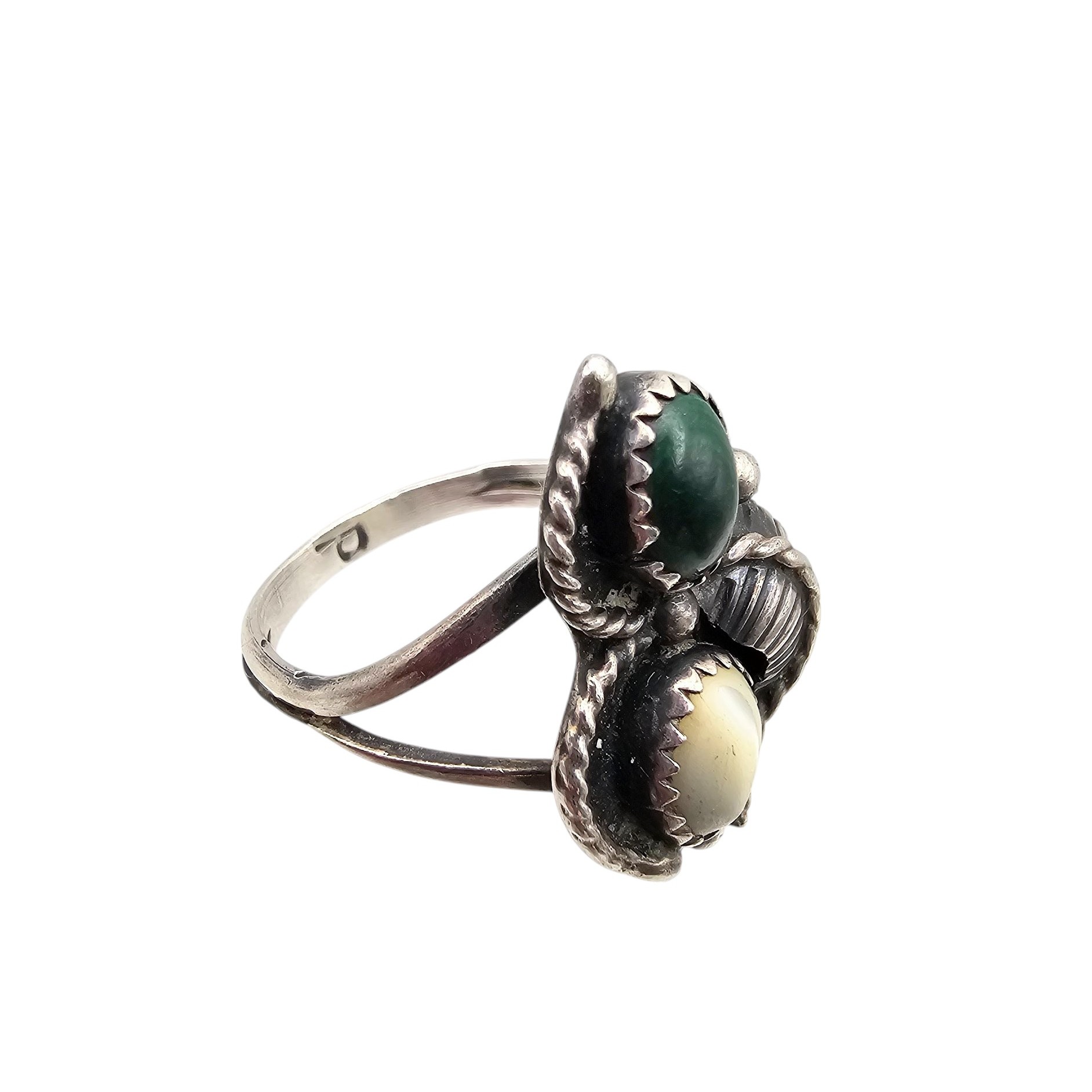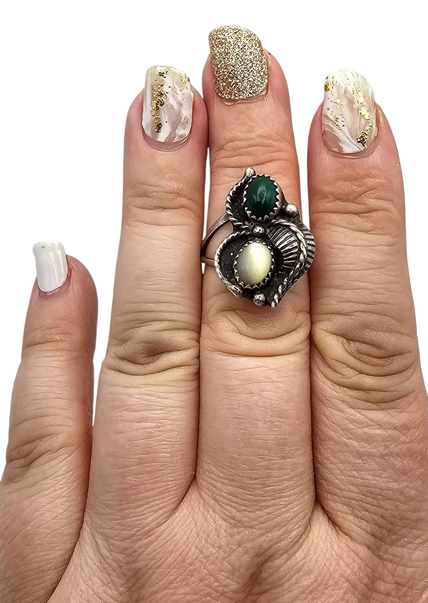 Signed D Navajo Mother of Pearl Malachite Sterling Silver Ring Size 7.5 4.5 G