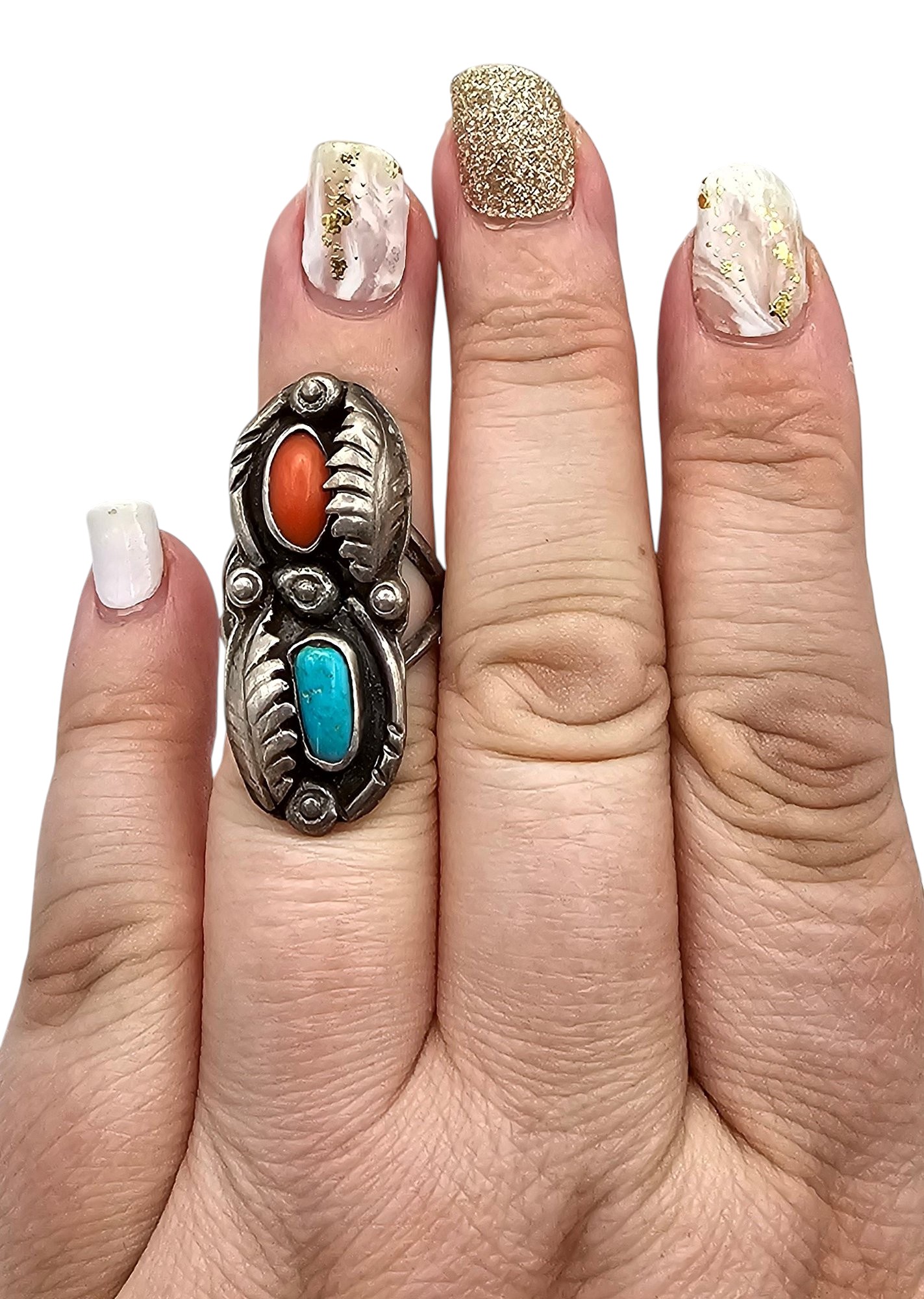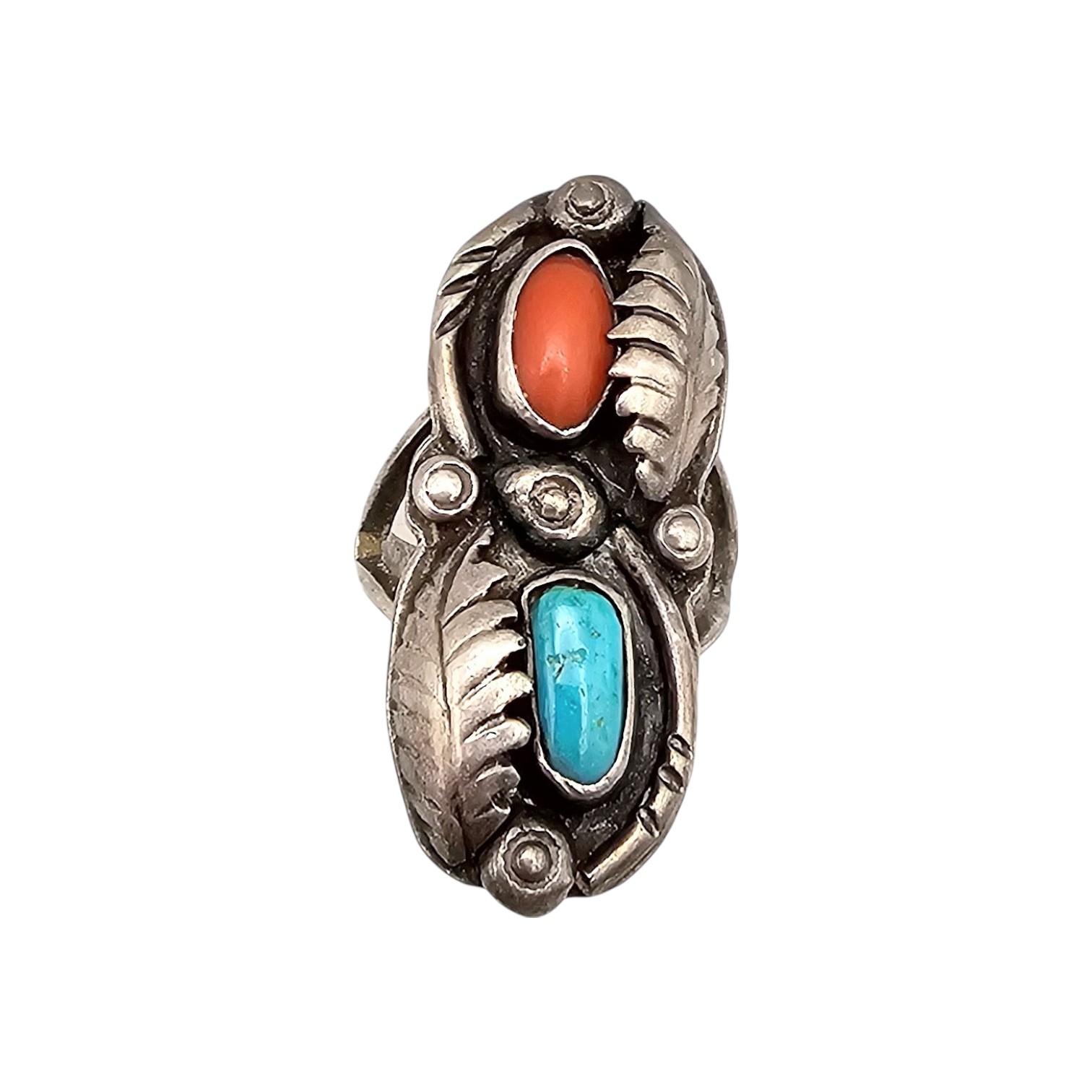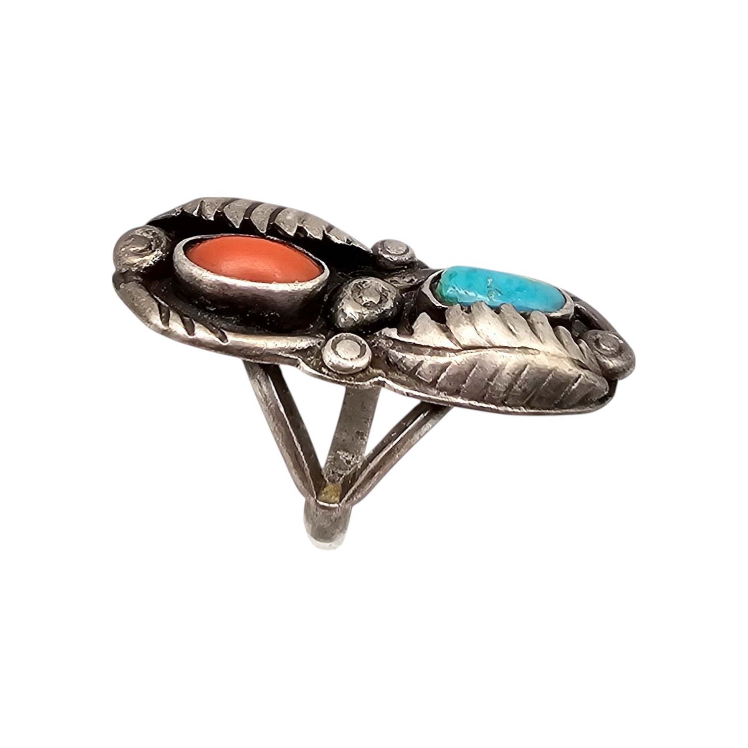 Navajo Turquoise Coral Sterling Silver Ring Size 5.25 8.5 G