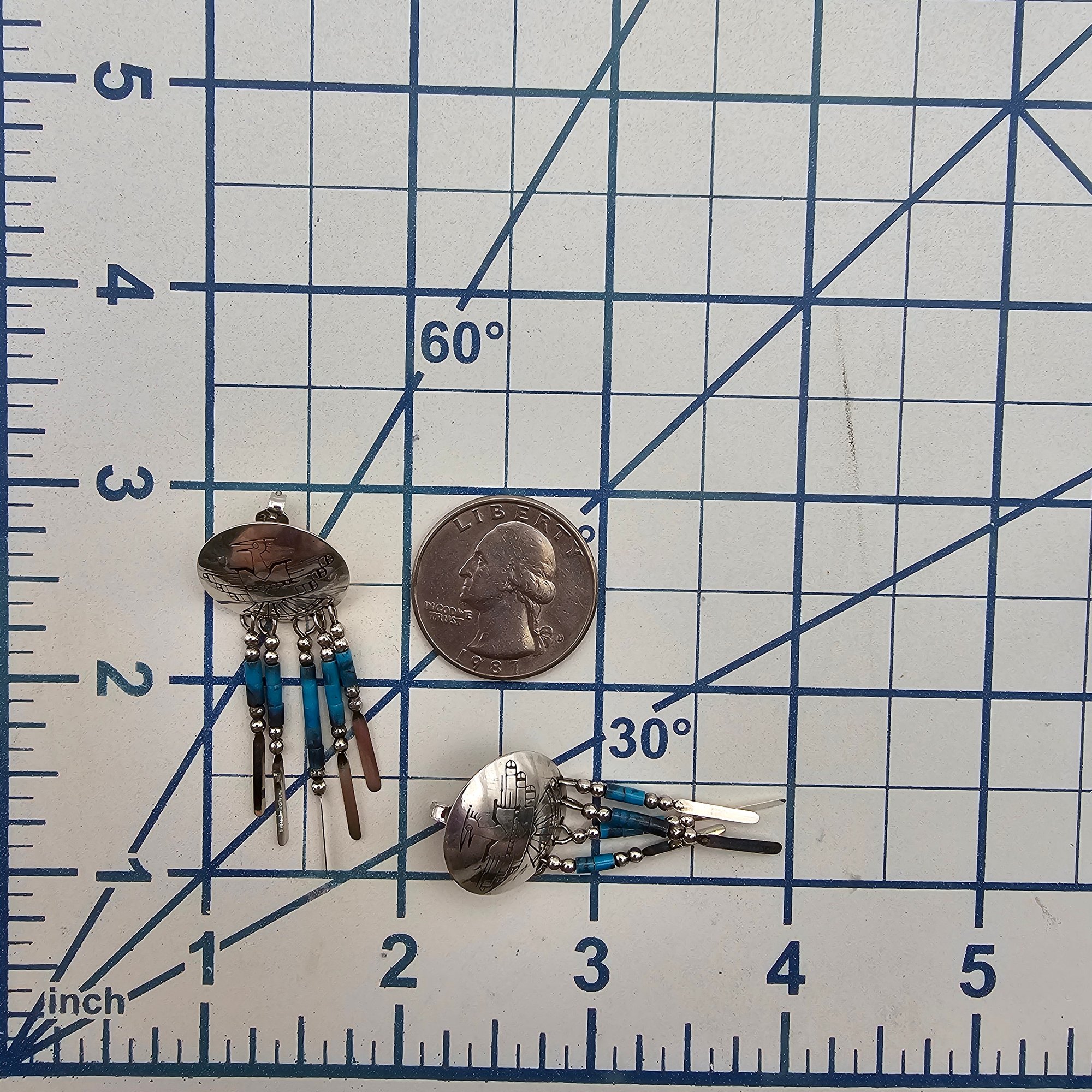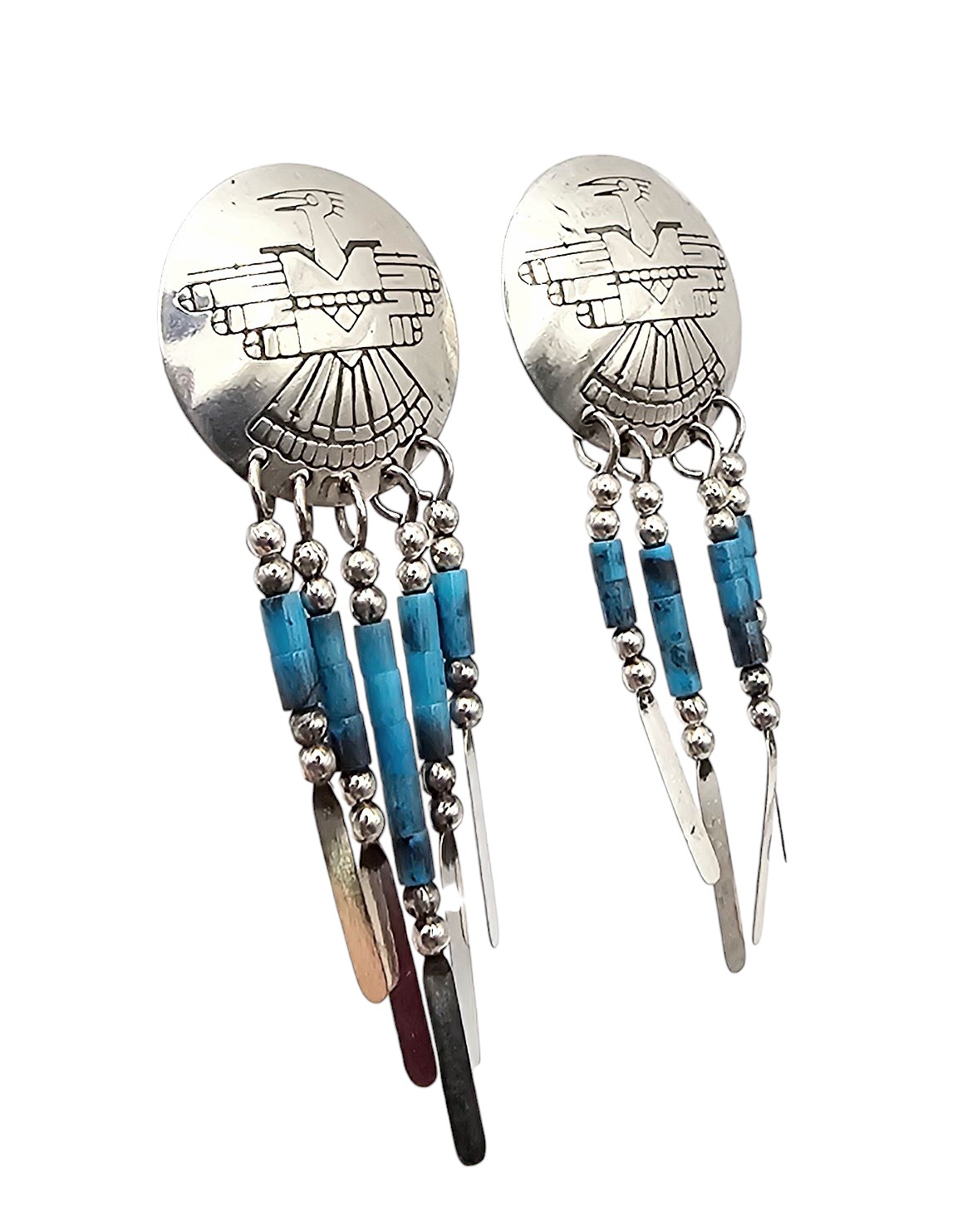 Native Turquoise Sterling Silver Thunderbird Fringe Dangle Earrings 5 G as is missing one Fringe