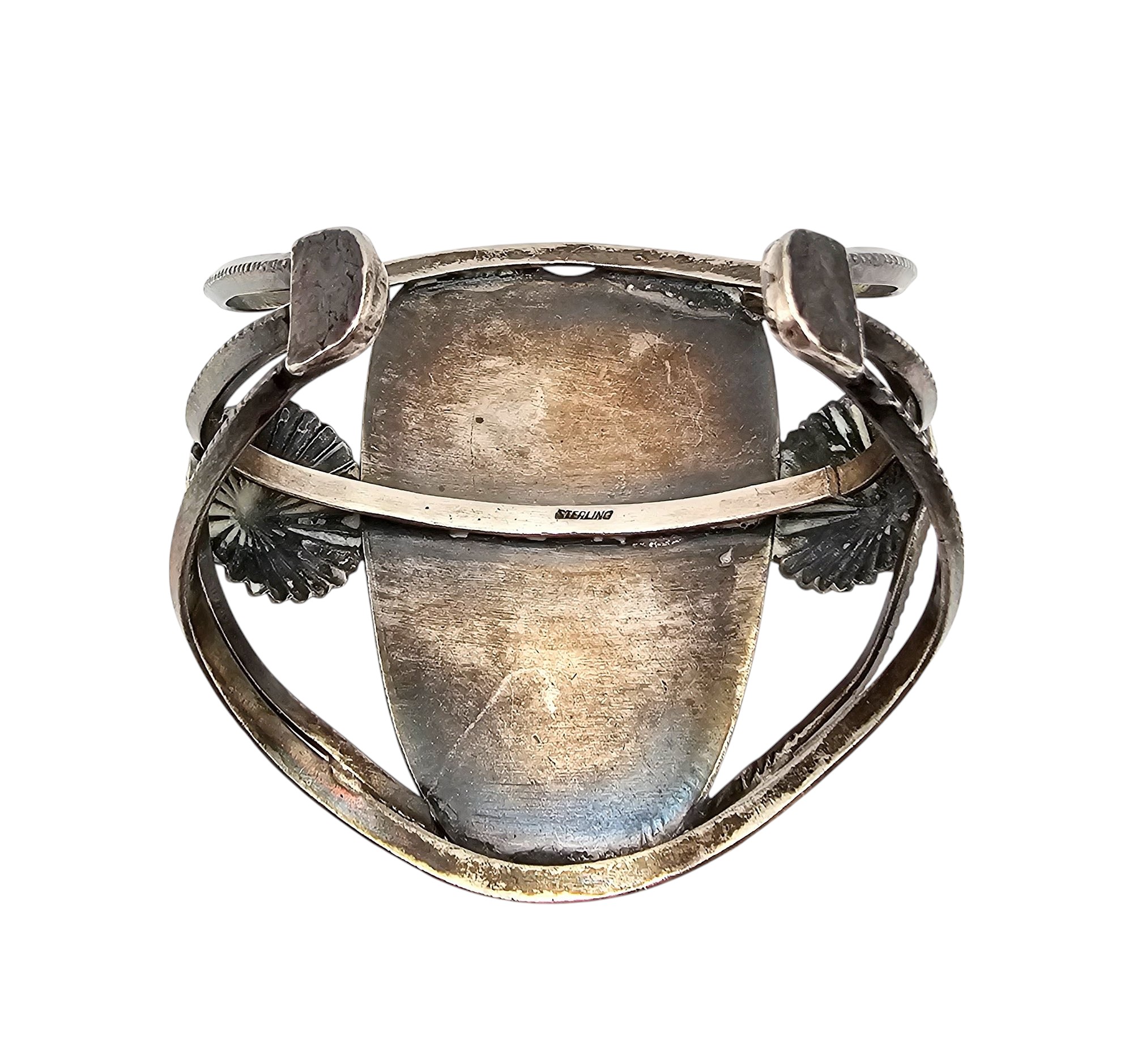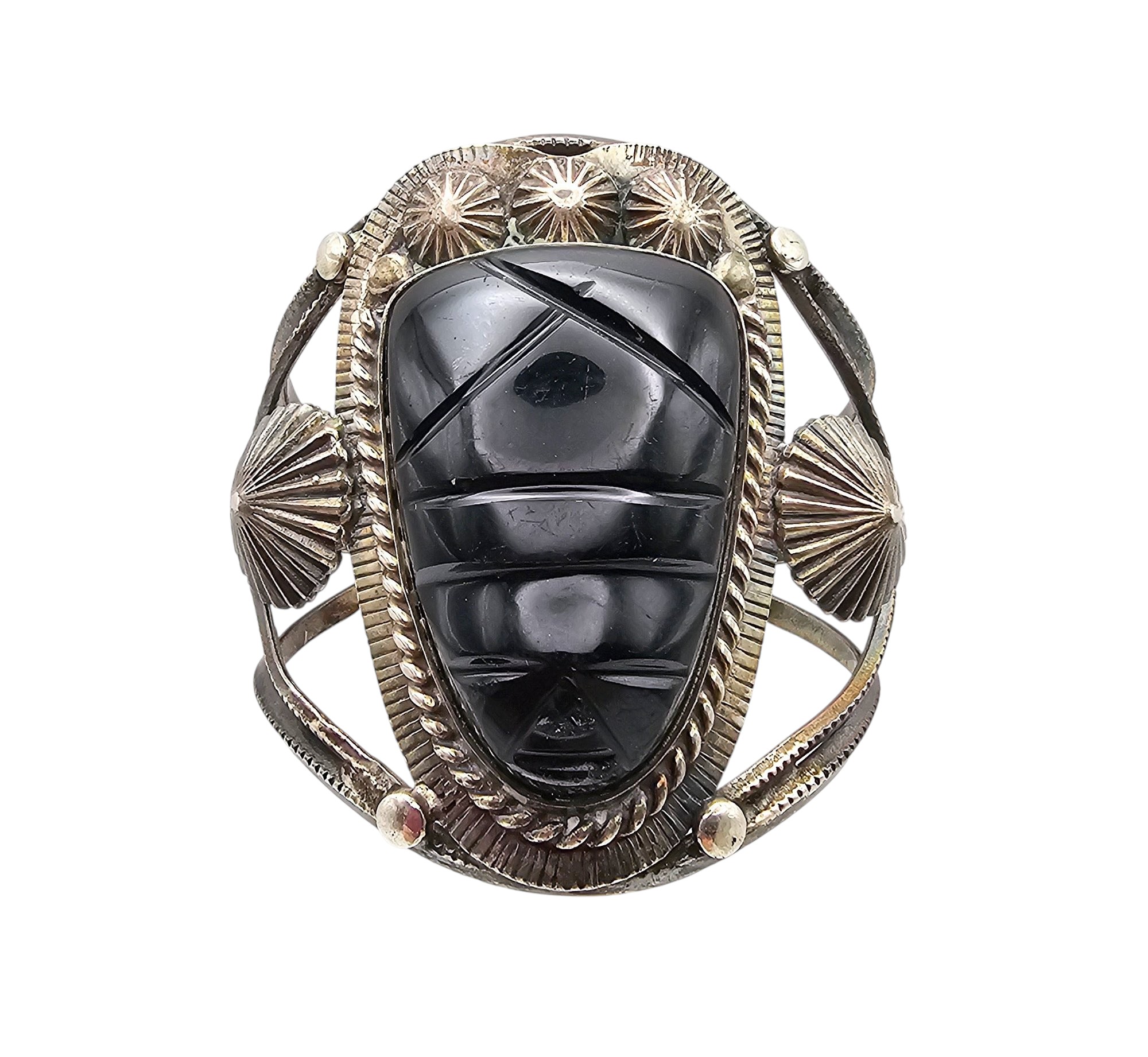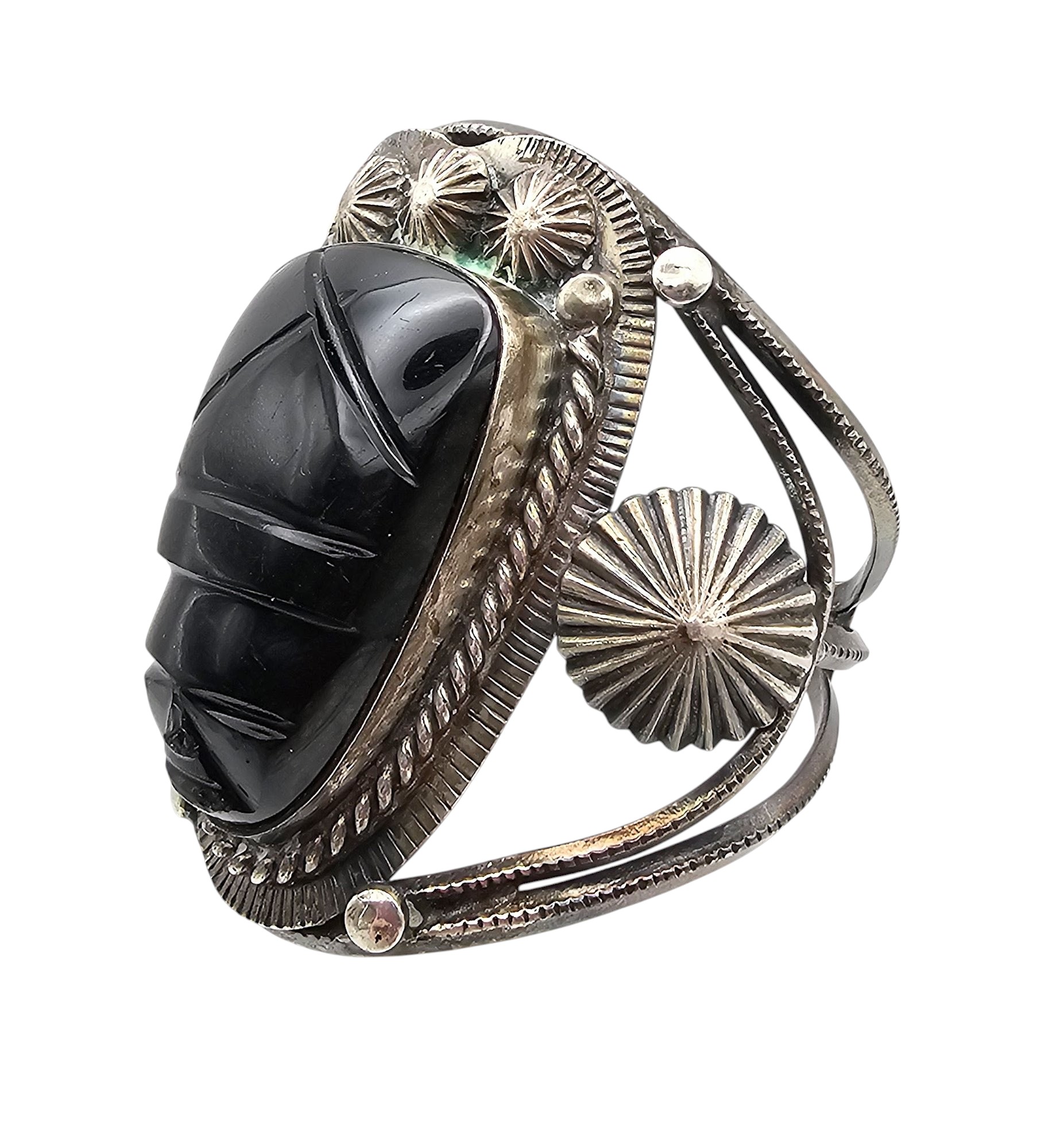 Onyx Sterling Silver Carved Face Mask Cuff Bracelet 72.8 G