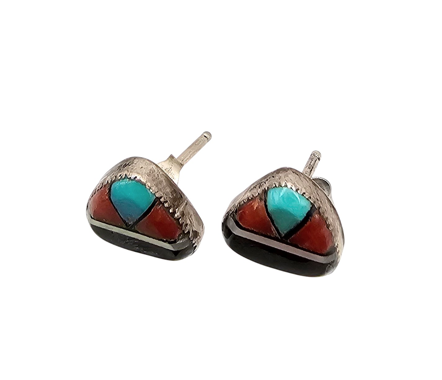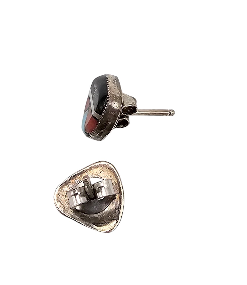 Navajo Coral Onyx Turquoise Mother Of Pearl Sterling Silver Inlay Earrings 1 G