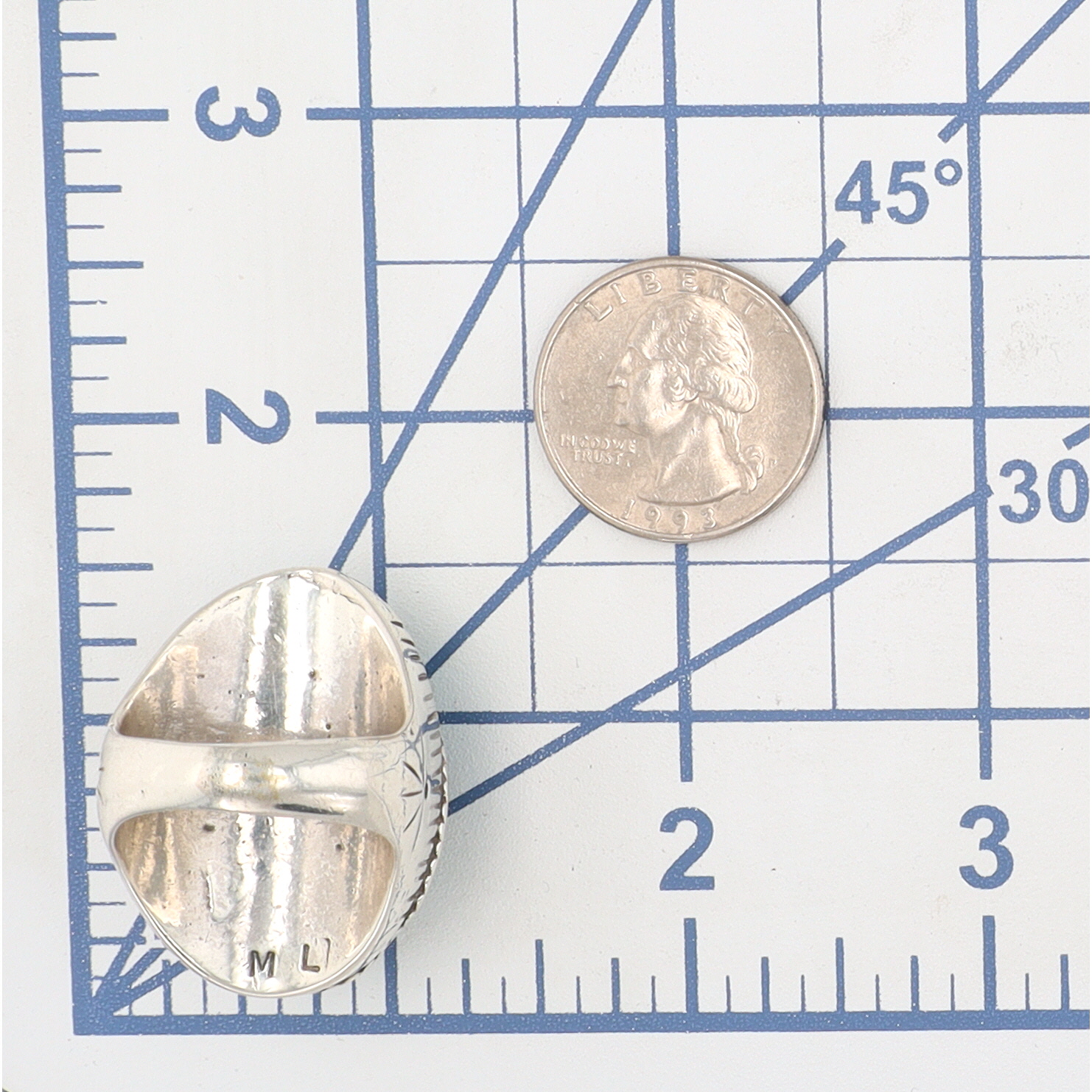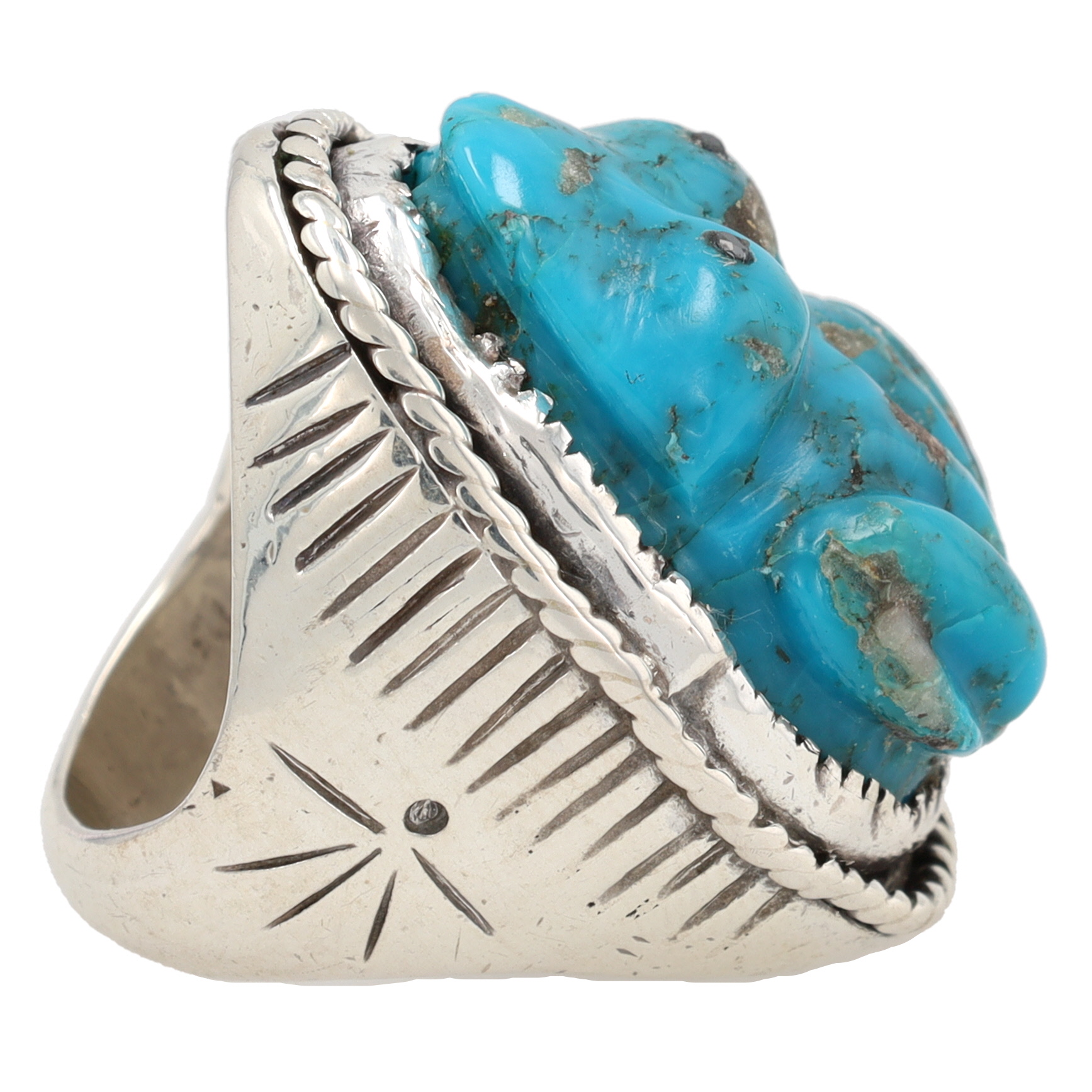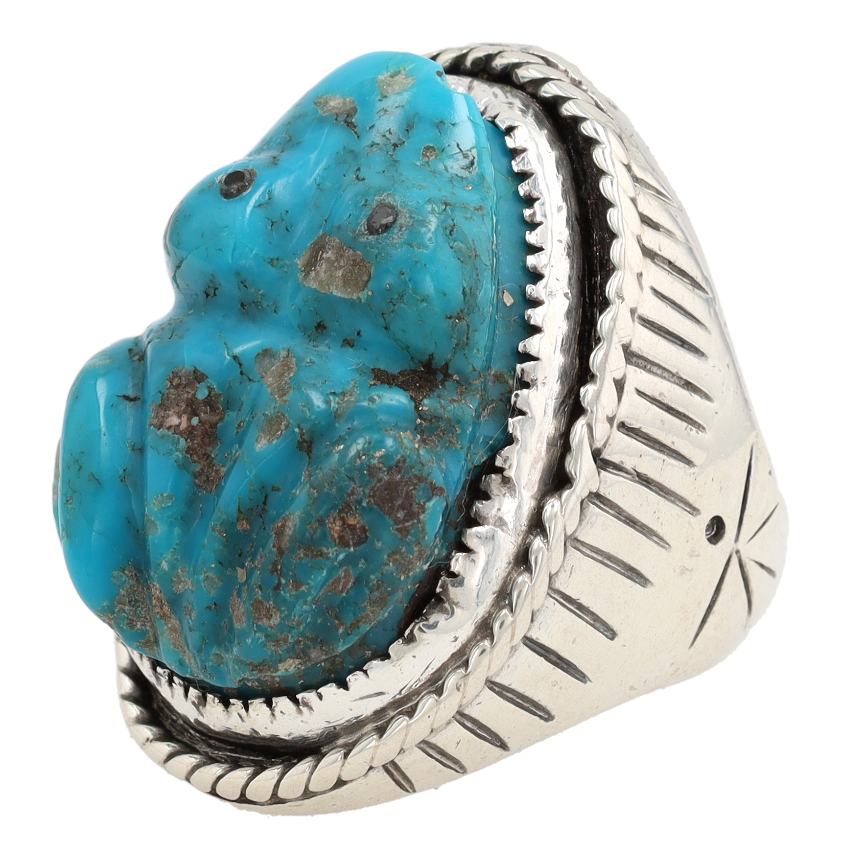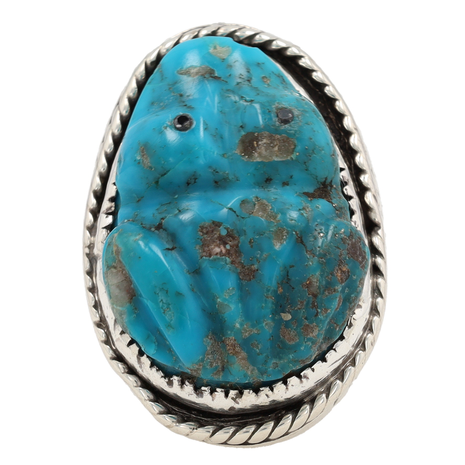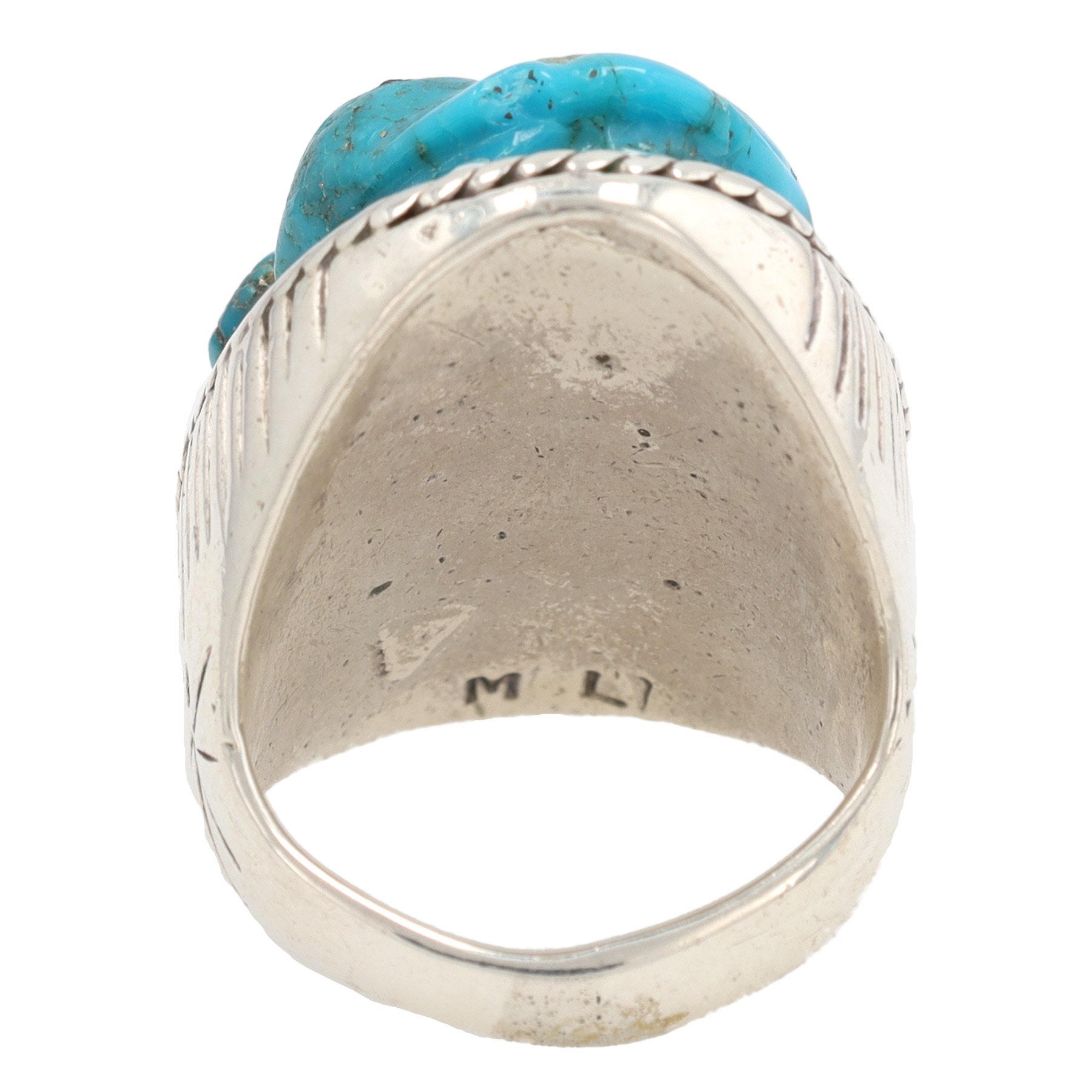 Signed ML Navajo Sterling Carved Turquoise Frog Ring Sz. 8, 37g