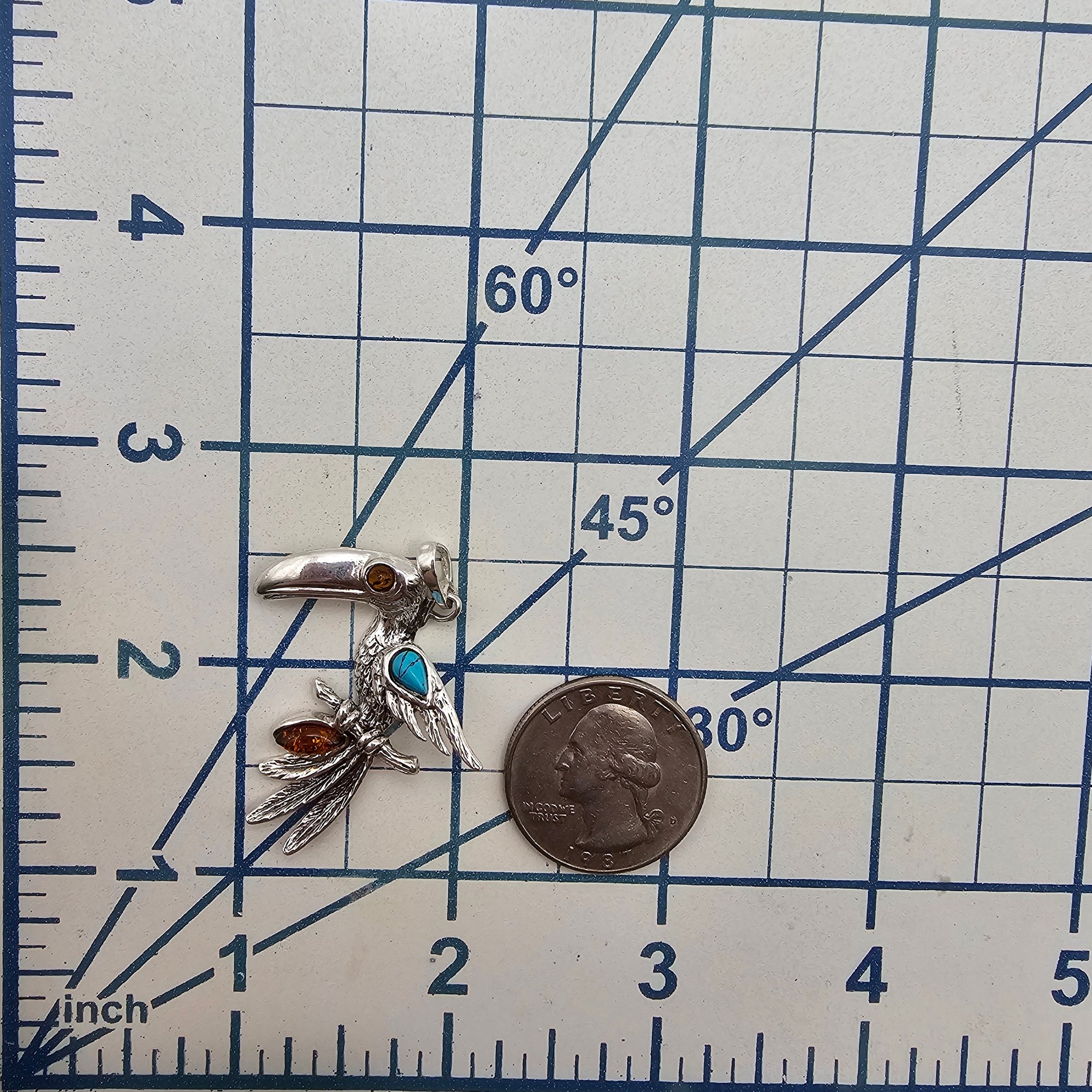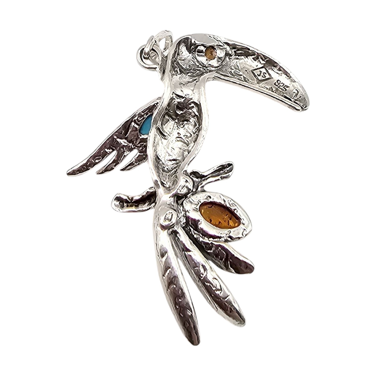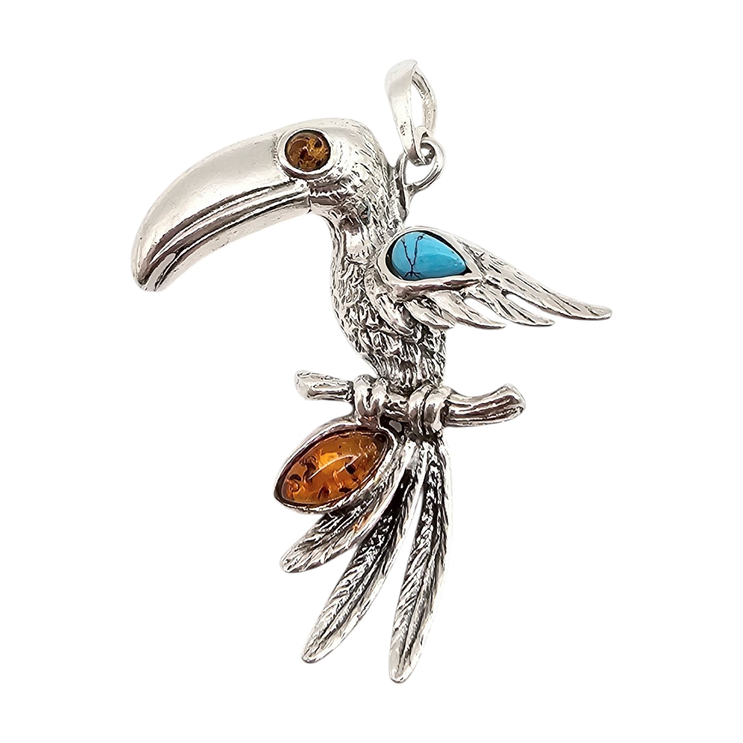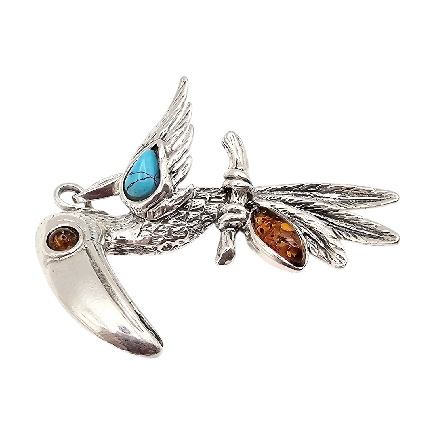 Amber Turquoise Sterling Silver Toucan Bird Pendant 4.6 G