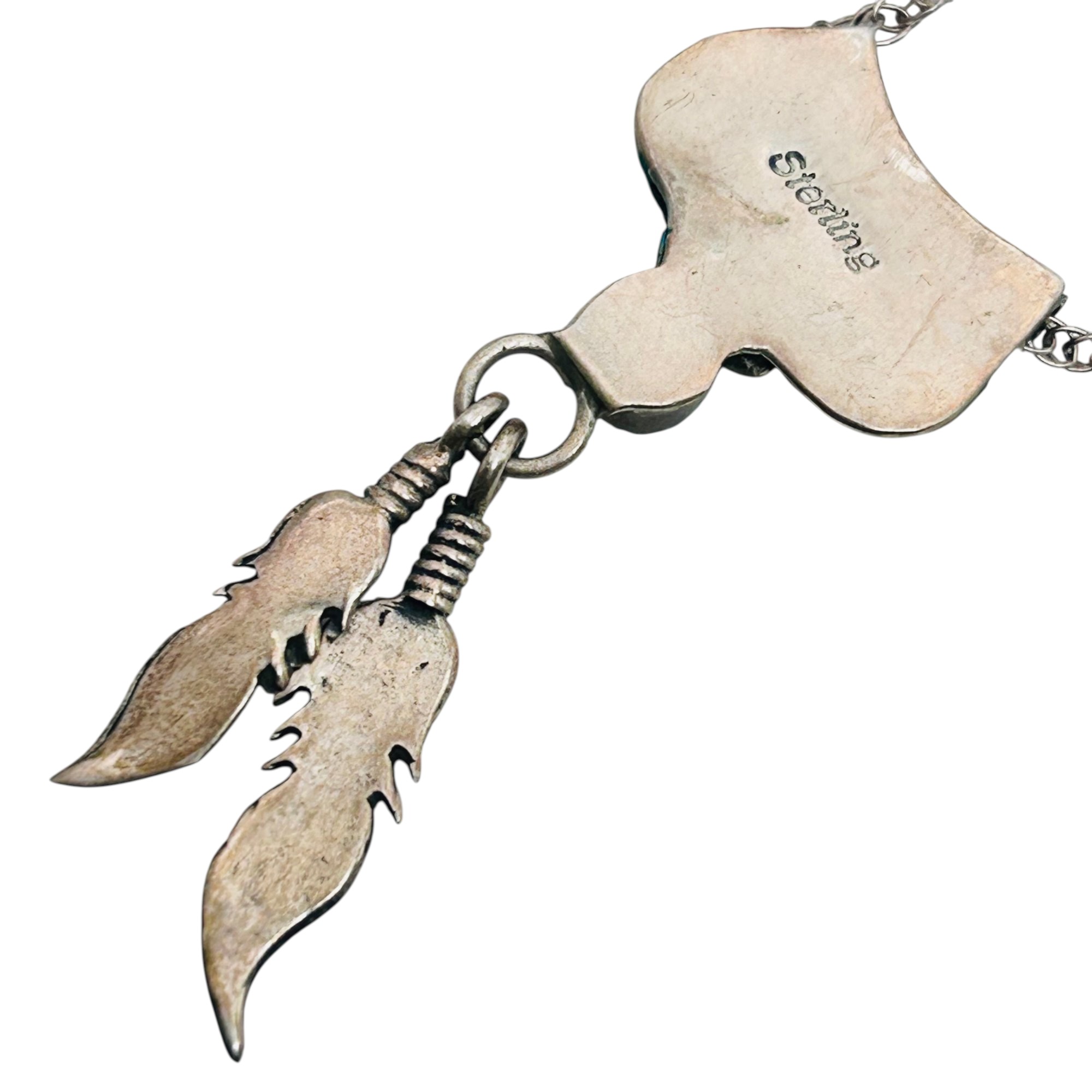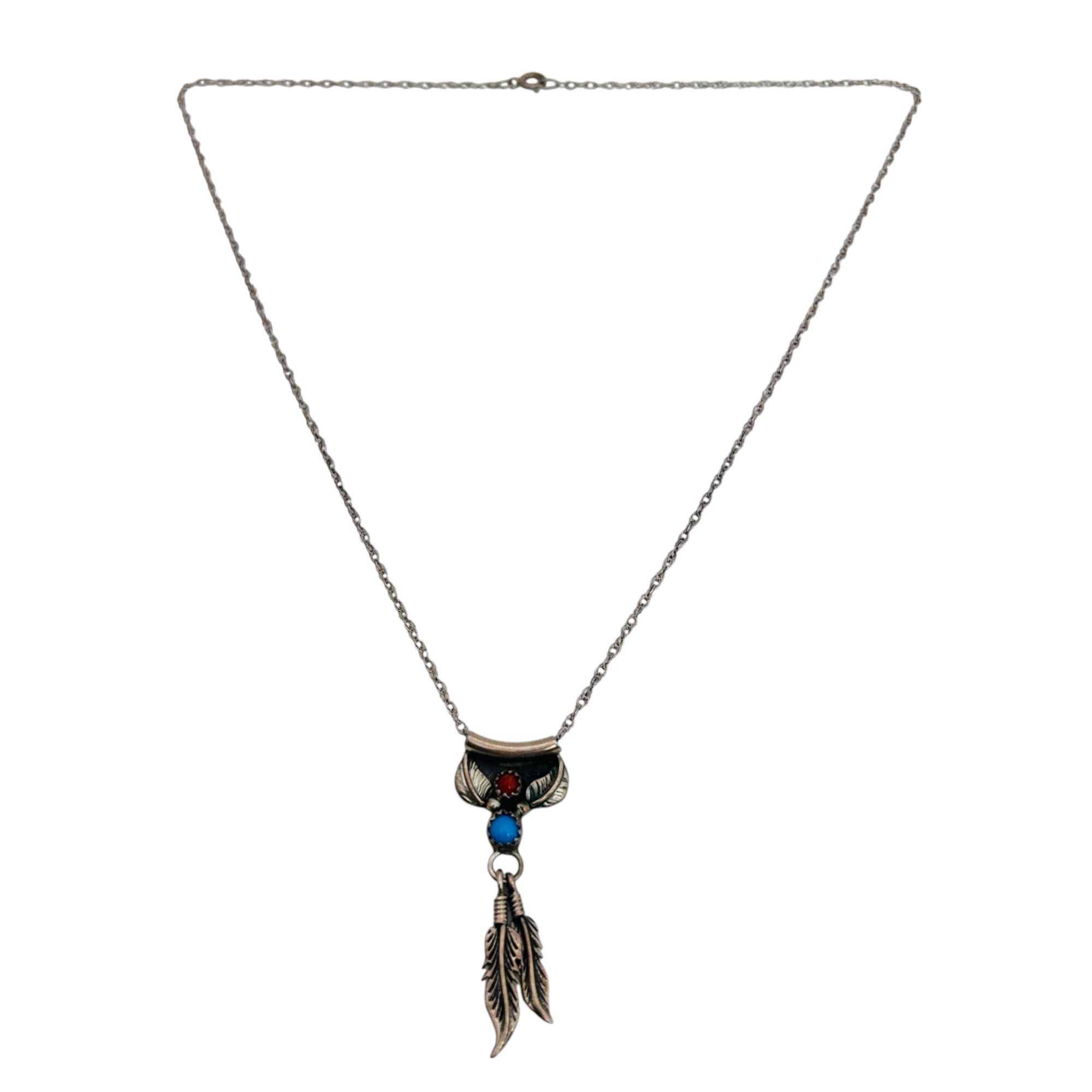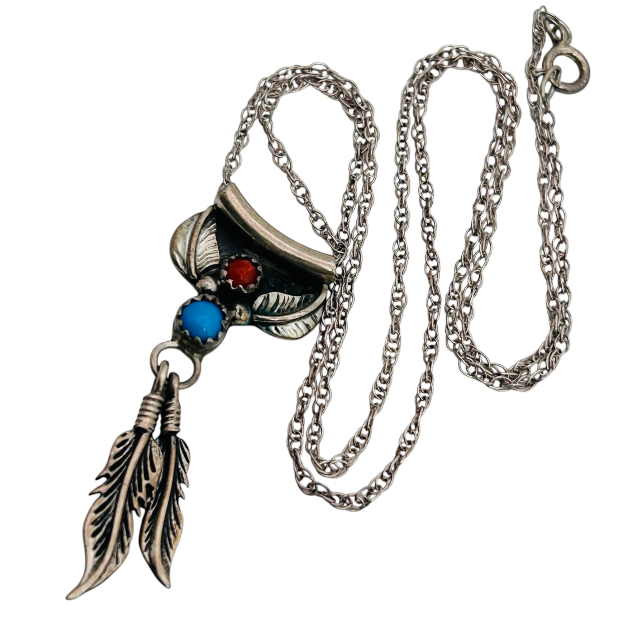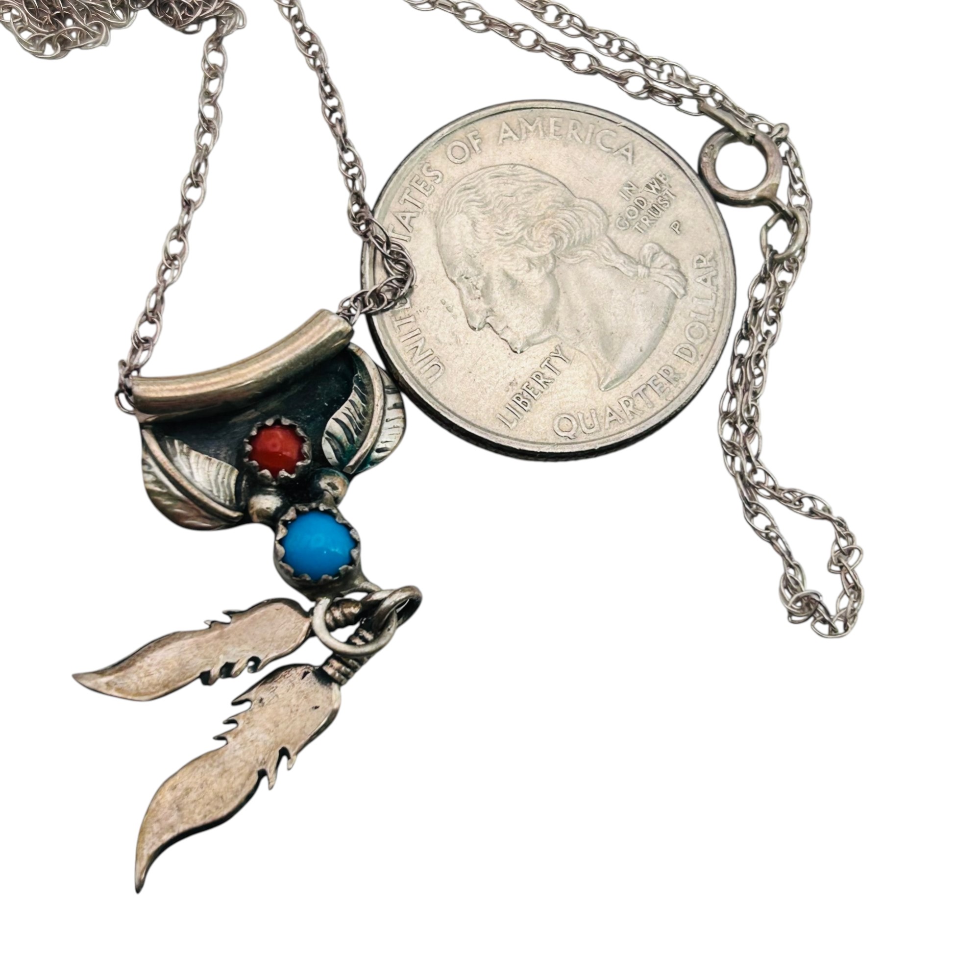 Navajo turquoise coral sterling feather pendant rope chain necklace 4.43 g