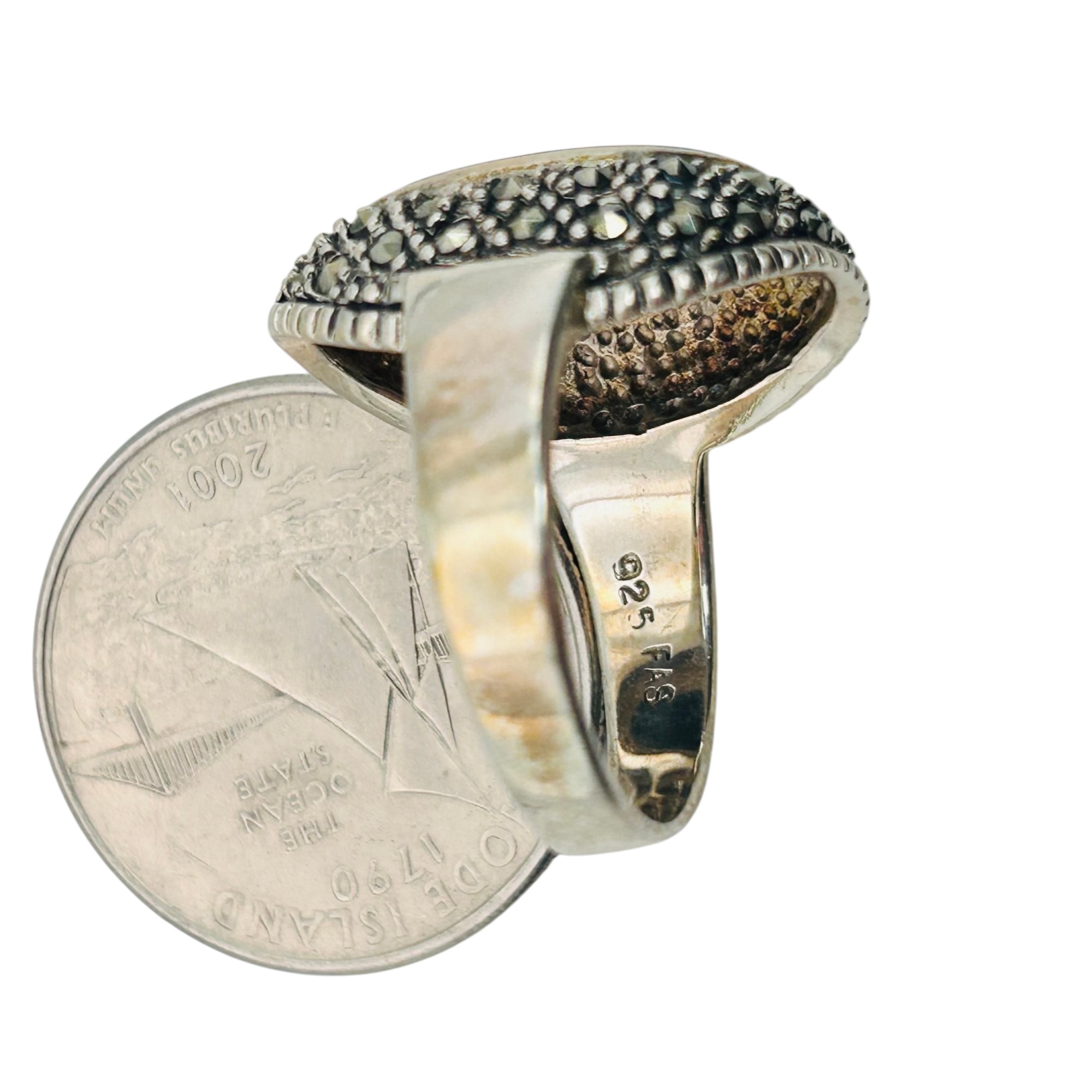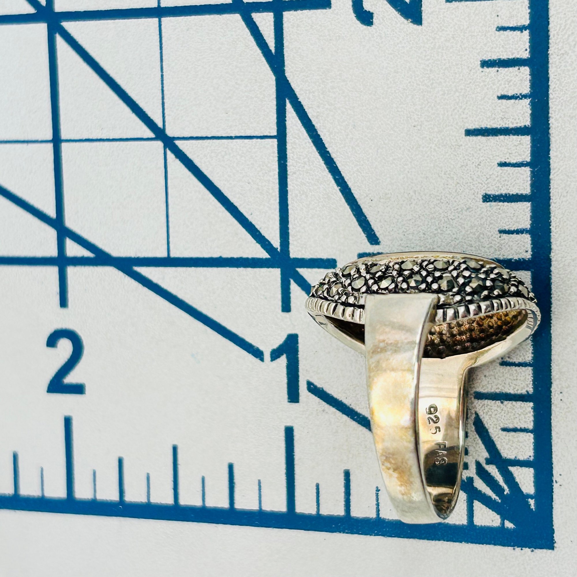 ONYX And MARCASITE Sterling Statement Ring Size 8, 6.22 G