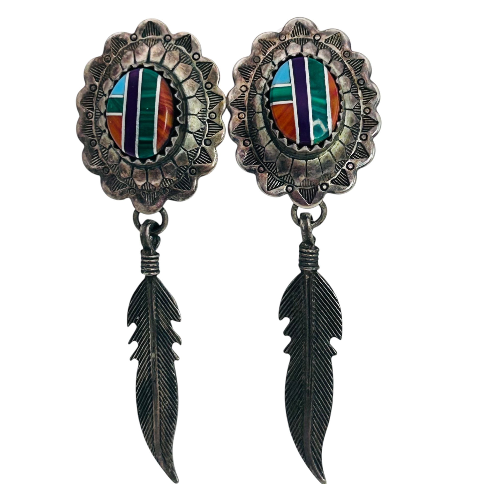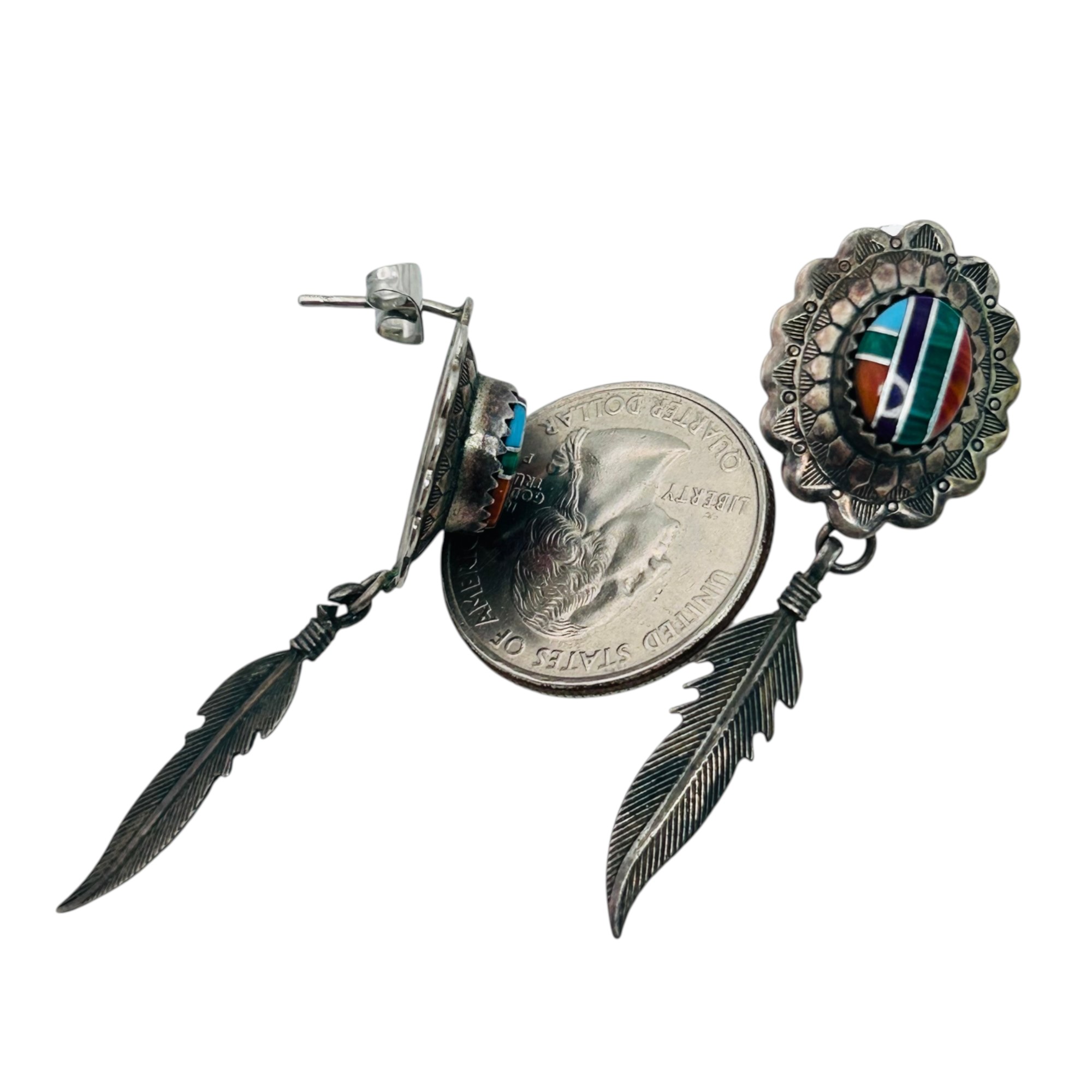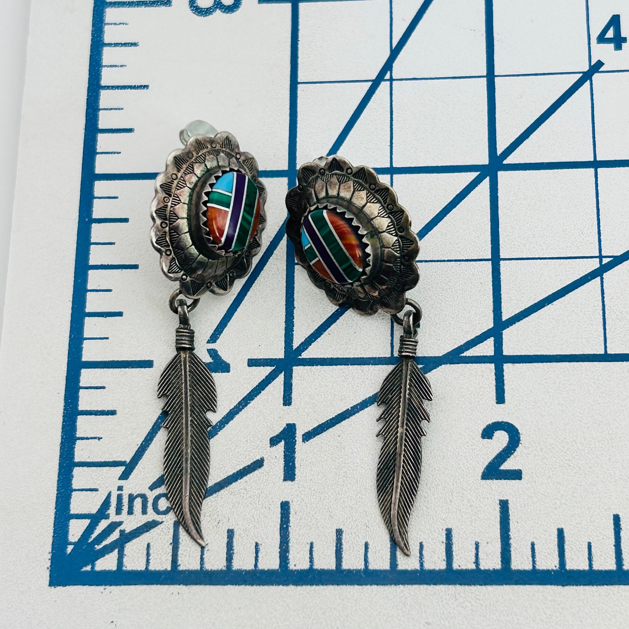 Navajo multi gem sterling feather dangle earrings 5.74 g