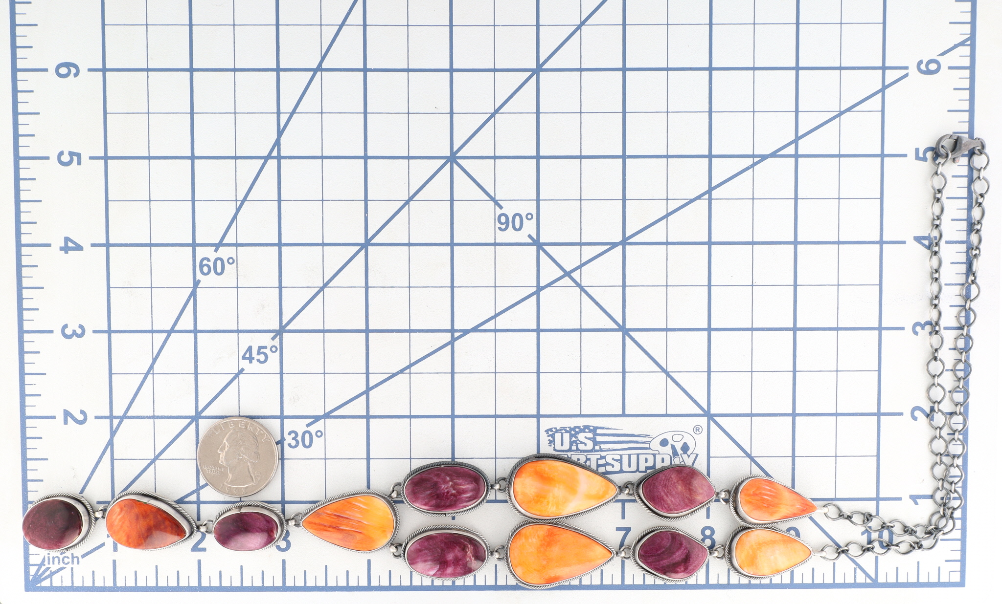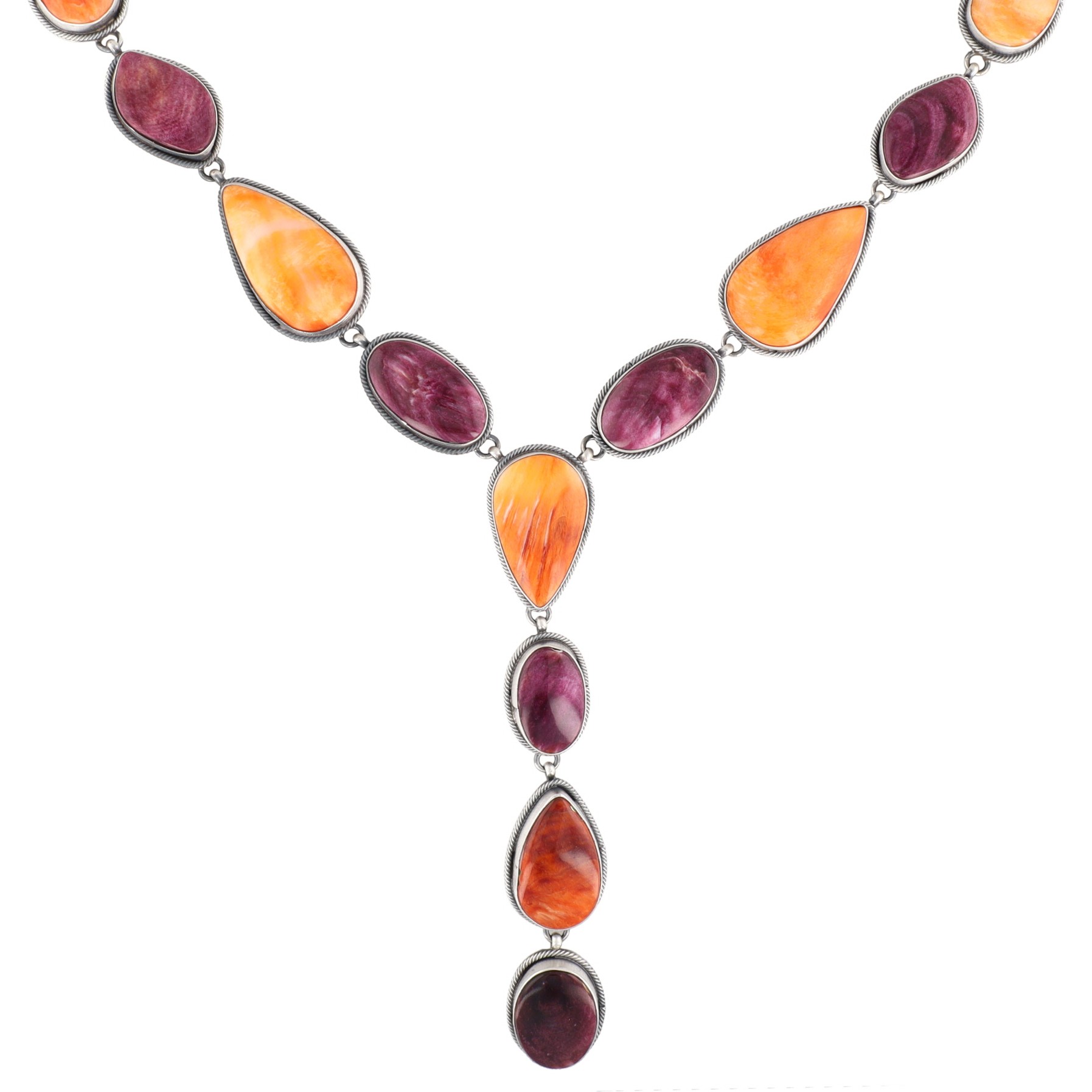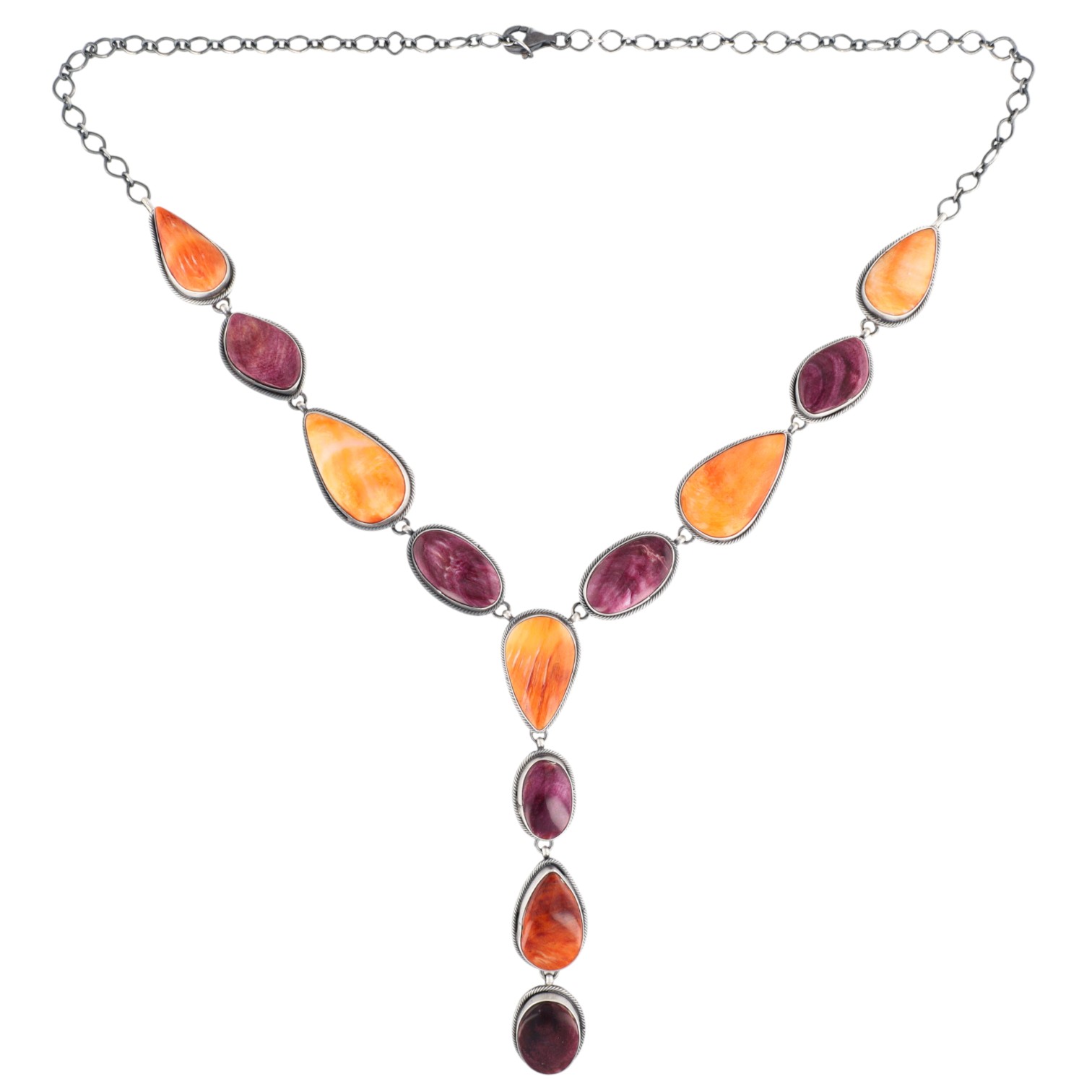A Navajo sterling silver Y-shaped necklace by Bessie Skeets, featuring interconnected, bezel-set cabochons of varying teardrop and oval shapes. The stones display natural variations in color, predominantly orange and a mottled purplish-red, consistent with Spiny Oyster shell. The settings and rolo-style link chain are silver-toned metal, marked "925" on the lobster clasp. An impressed mark "STERLING B. SKEETS" is visible on the reverse of the lowest pendant. An attached tag further identifies the piece as an "SS SPINY OYSTER NECKLACE" by "BESSIE SKEETS NAVAJO HANDMADE."